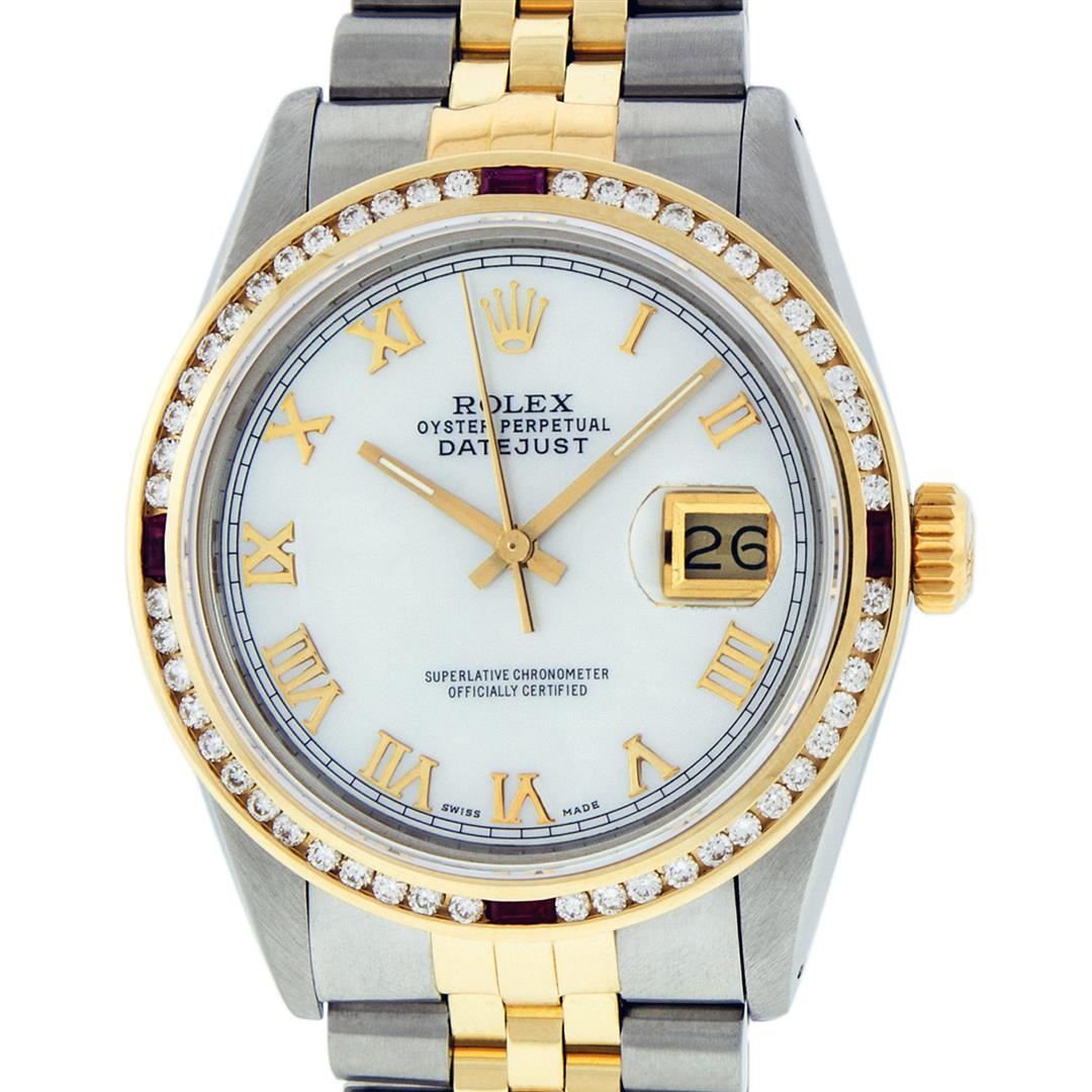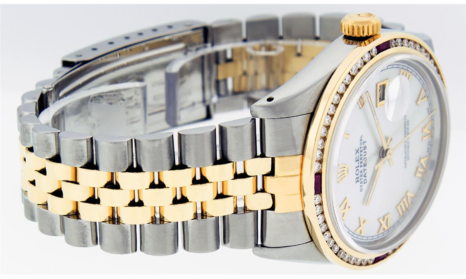 One Mens Pre Owned Yellow Gold Two Tone Rolex Datejust Polished, Serviced & Electronically Tested, Yellow Gold & Stainless Steel Case: 36mm, Yellow Gold Crown, Custom Bezel: 18K Yellow Gold Ruby Channel Set Diamond Bezel, Diamond Count: 52 Diamonds + 4 Ru
