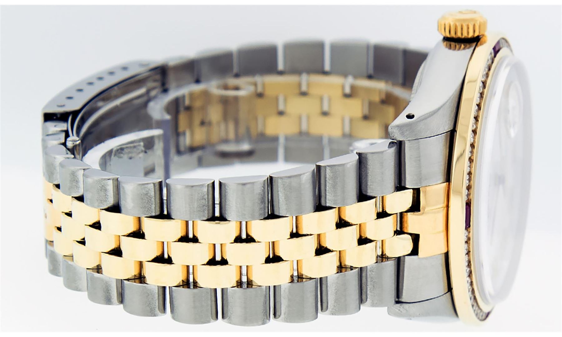 One Mens Pre Owned Yellow Gold Two Tone Rolex Datejust Polished, Serviced & Electronically Tested, Yellow Gold & Stainless Steel Case: 36mm, Yellow Gold Crown, Custom Bezel: 18K Yellow Gold Ruby Channel Set Diamond Bezel, Diamond Count: 52 Diamonds + 4 Rubies, Total Weight 1.30 Carat, Clarity: SI-VS, Color: G to H. Custom Crystal: New Sapphire With Date Window. Custom Hands: New Luminescent Hands. Rolex Movement: Automatic Winding Movement. Custom Dial: Mother Of Pearl Roman With Square Track. Date Window: 3 O'clock Position Date Display, Quickset, Model: Datejust. Condition: G-6 Extra Fine. Rolex Bracelet: Two Tone Yellow Gold & Stainless Steel Jubilee Band. Bright Polish. 7.0 Inch Length, Adjustable. Standard Clasp, With Rolex Logo. This Watch Has Been Serviced Time Tested And Is In Excellent Condition It Is Free Of All Scratches And Dents.