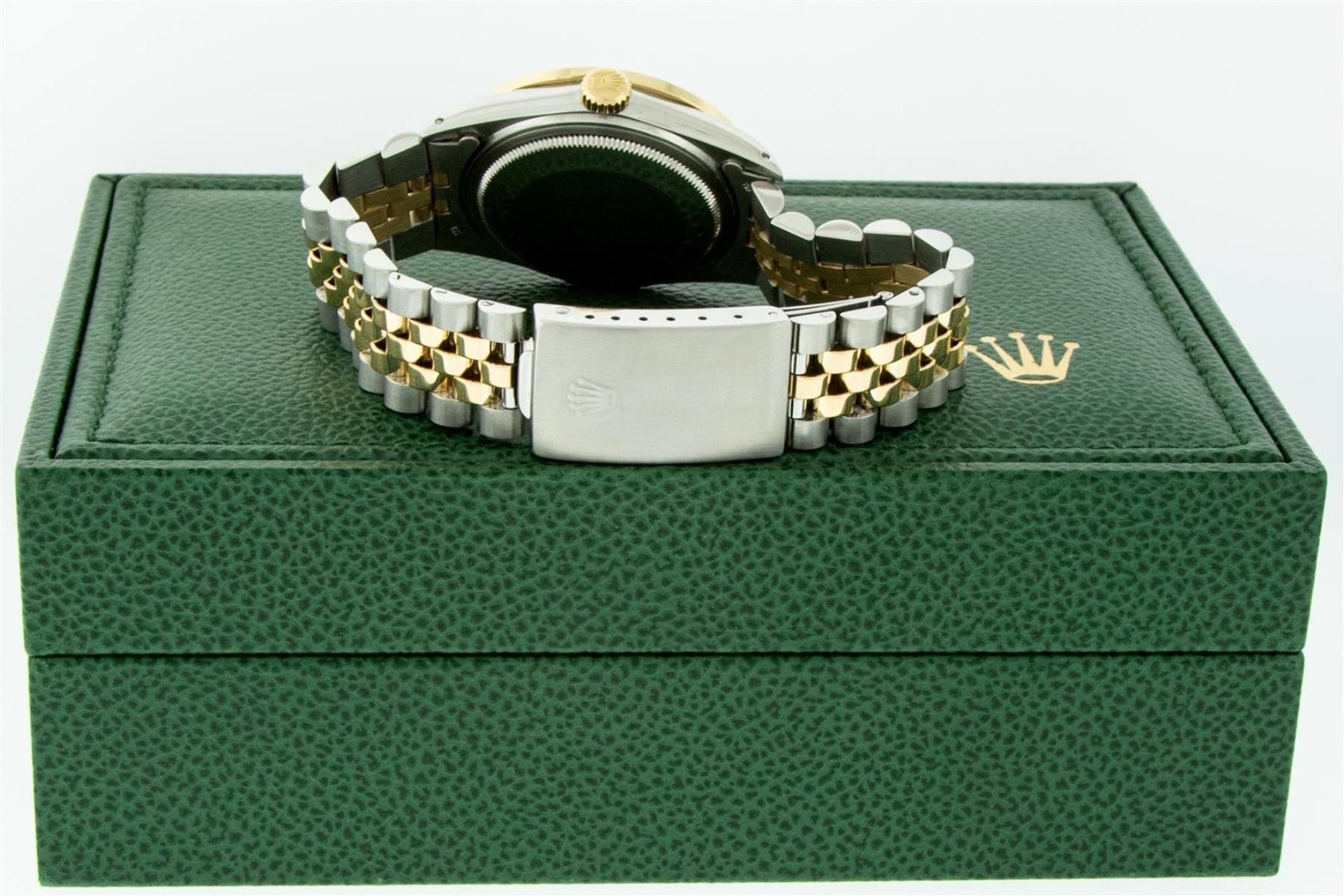 One Mens Yellow Gold Two Tone Rolex Datejust Polished, Serviced & Electronically Tested, Yellow Gold & Stainless Steel Case: 36mm, Yellow Gold Crown, Custom Bezel: 18K Yellow Gold Sapphire Channel Set Diamond Bezel, Diamond Count: 52 Diamonds + 4 Sapphires, Total Weight 1.30 Carat, Clarity: SI-VS, Color: G to H. Custom Crystal: New Synthetic Sapphire Cyclops Lens. Custom Hands: New Hands. Movement: Automatic Winding Movement. Custom Dial: Mother Of Pearl Dial With Ruby Hour Markers, Stone Count: 10 Sapphires in Dial. Date Window: 3 O'Clock Position Date Display, Quickset, Model: Condition: G-6 Extra Fine. Bracelet: Two Tone Yellow Gold & Stainless Steel Jubilee. Bright Polish. 7.0 Inch Length, Adjustable. Standard Clasp, With Rolex Logo. This Watch Has Been Serviced Time Tested And Is In Excellent Condition It Is Free Of All Scratches And Dents.