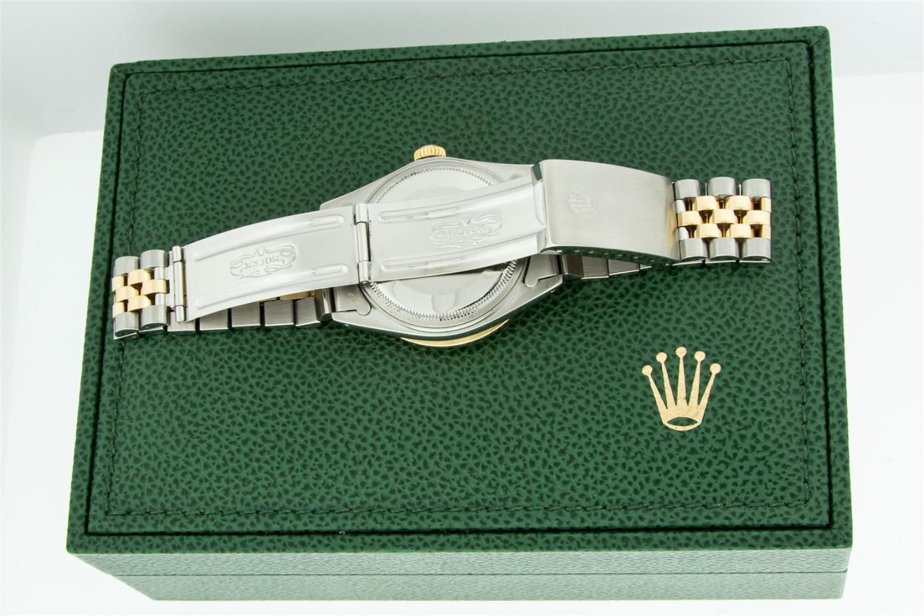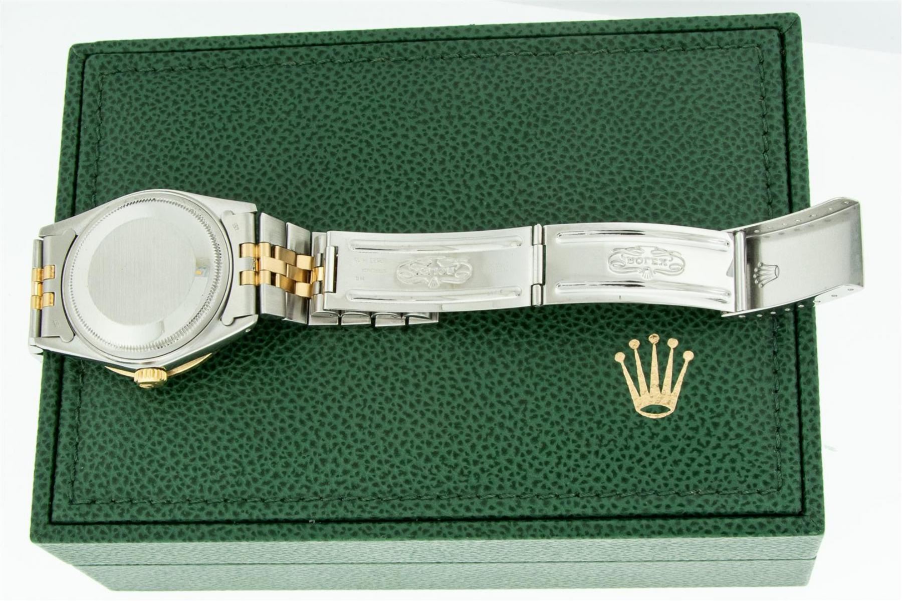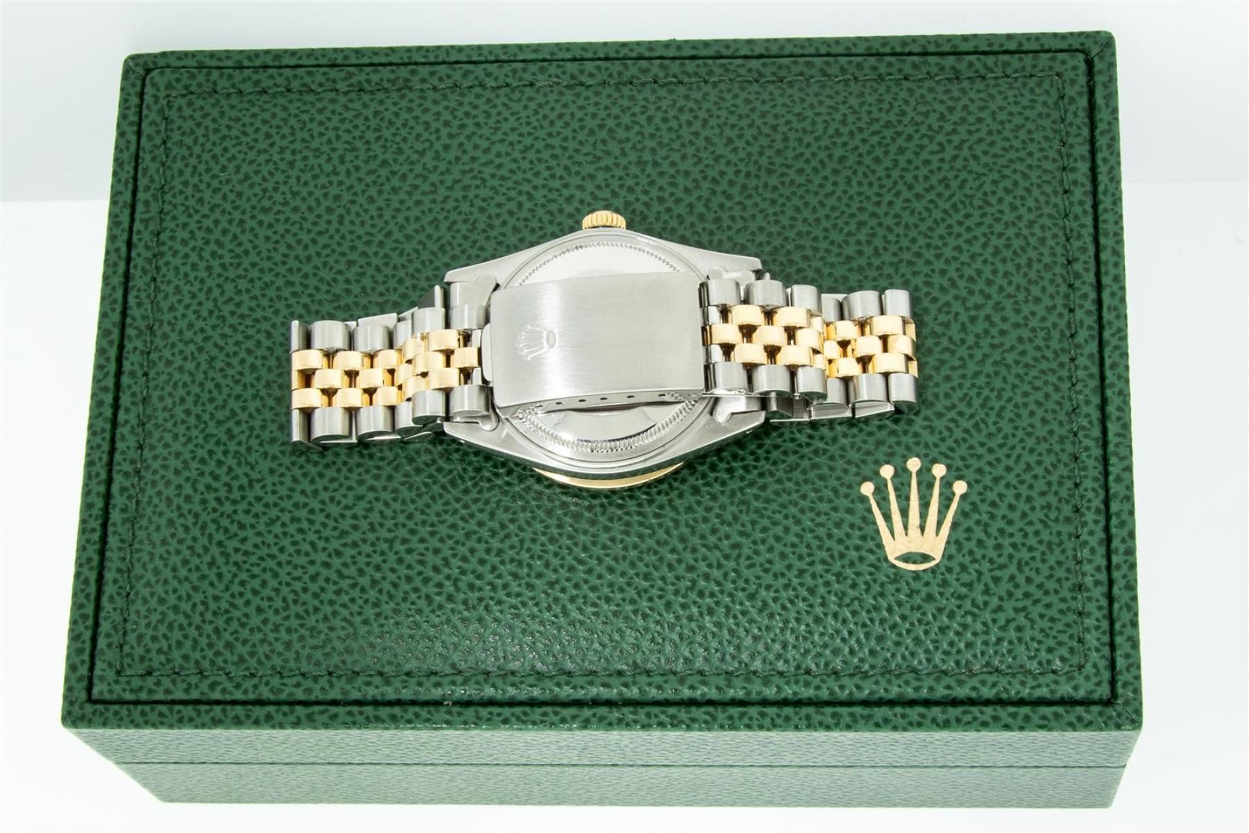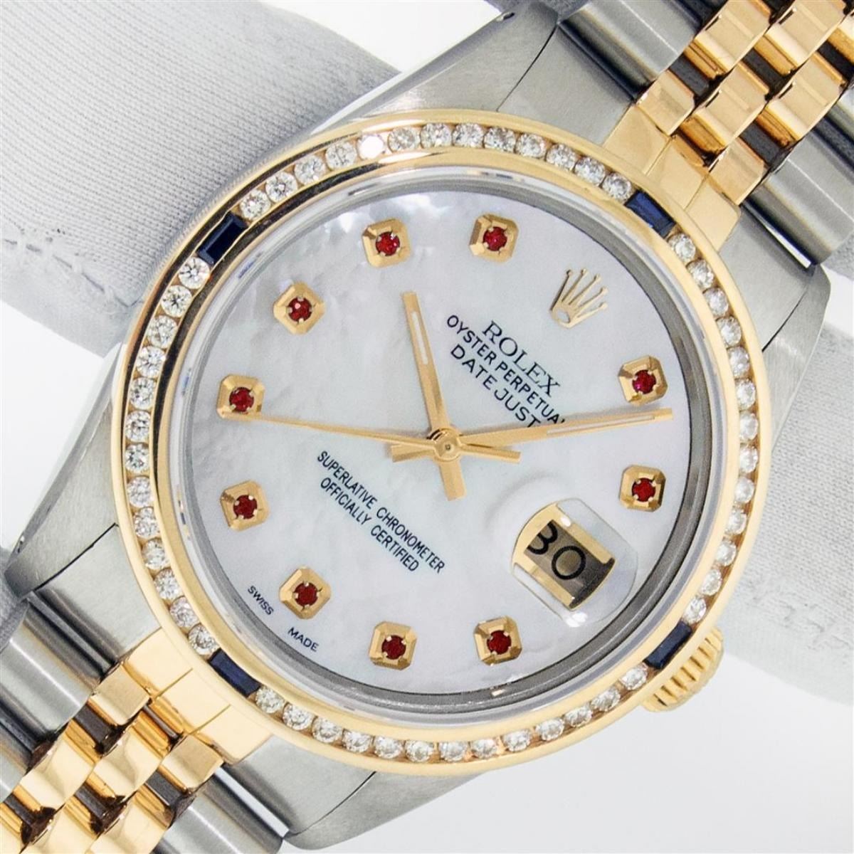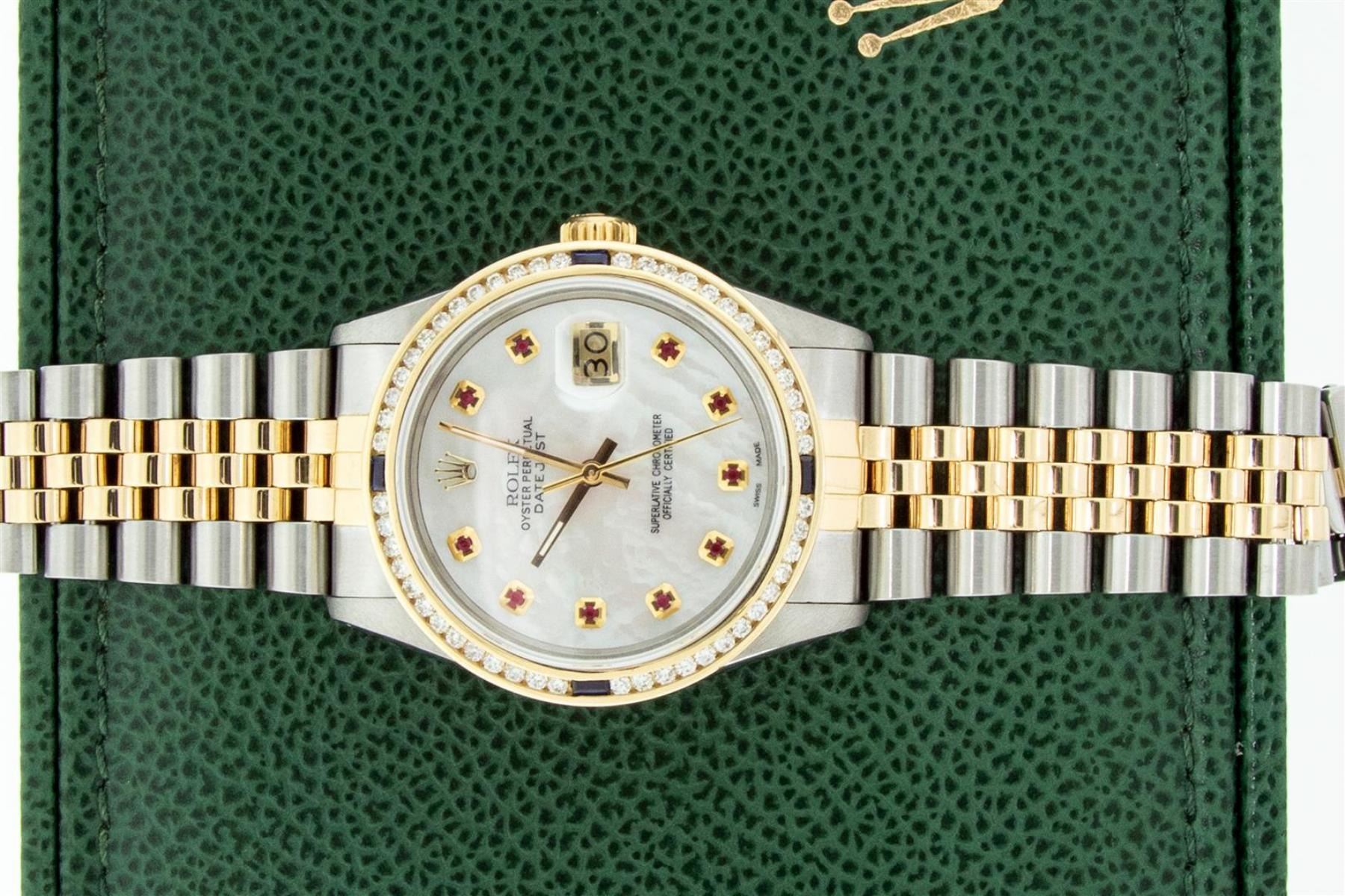 One Mens Yellow Gold Two Tone Rolex Datejust Polished, Serviced & Electronically Tested, Yellow Gold & Stainless Steel Case: 36mm, Yellow Gold Crown, Custom Bezel: 18K Yellow Gold Sapphire Channel Set Diamond Bezel, Diamond Count: 52 Diamonds + 4 Sapphires, Total Weight 1.30 Carat, Clarity: SI-VS, Color: G to H. Custom Crystal: New Synthetic Sapphire Cyclops Lens. Custom Hands: New Hands. Movement: Automatic Winding Movement. Custom Dial: Mother Of Pearl Dial With Ruby Hour Markers, Stone Count: 10 Sapphires in Dial. Date Window: 3 O'Clock Position Date Display, Quickset, Model: Condition: G-6 Extra Fine. Bracelet: Two Tone Yellow Gold & Stainless Steel Jubilee. Bright Polish. 7.0 Inch Length, Adjustable. Standard Clasp, With Rolex Logo. This Watch Has Been Serviced Time Tested And Is In Excellent Condition It Is Free Of All Scratches And Dents.