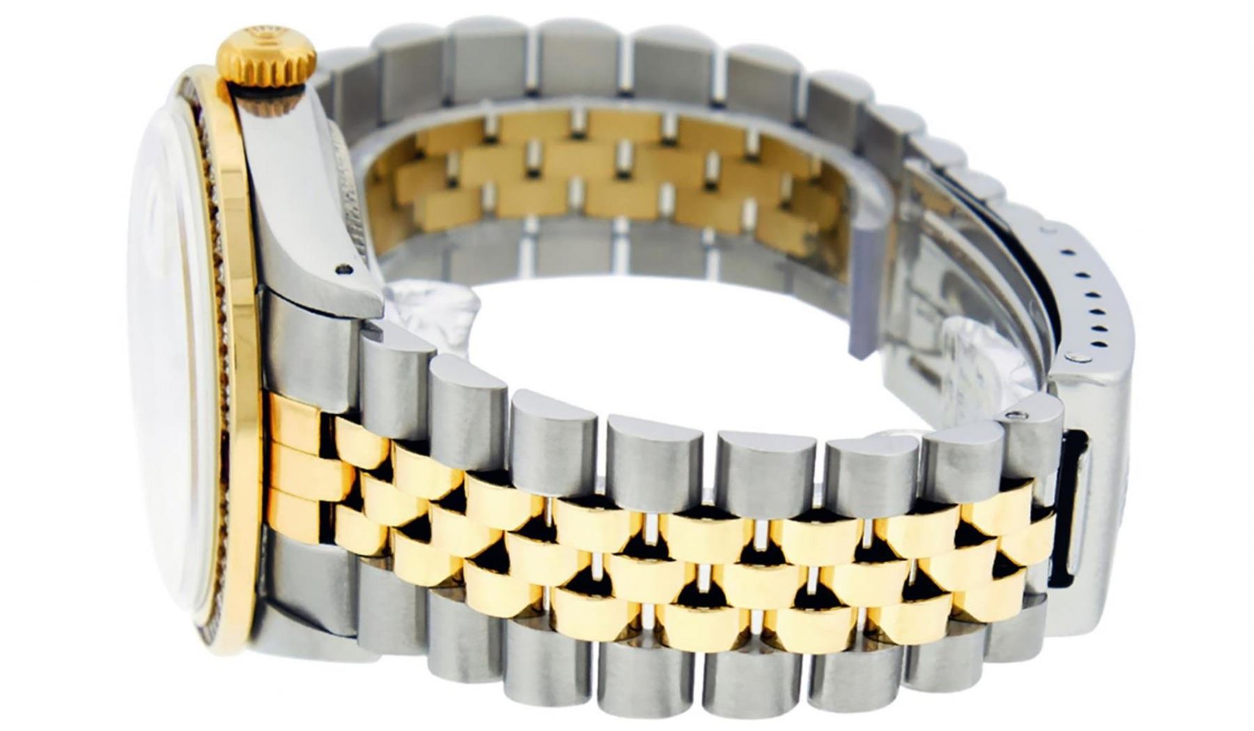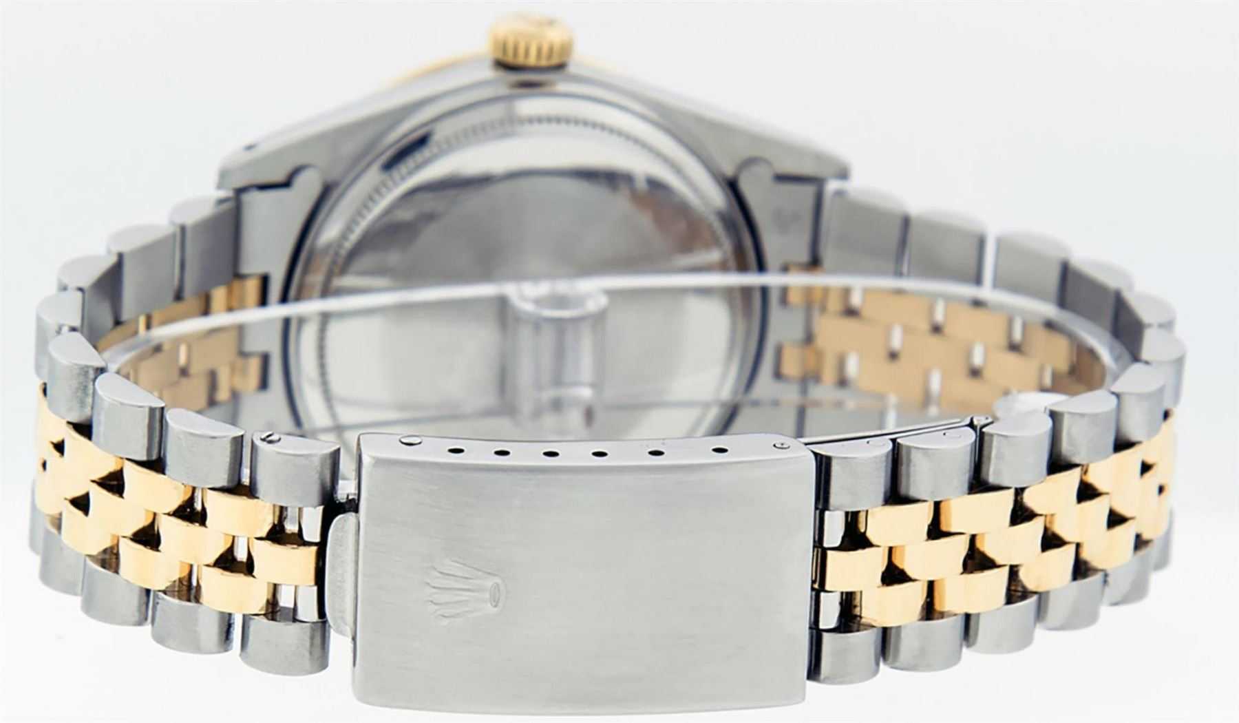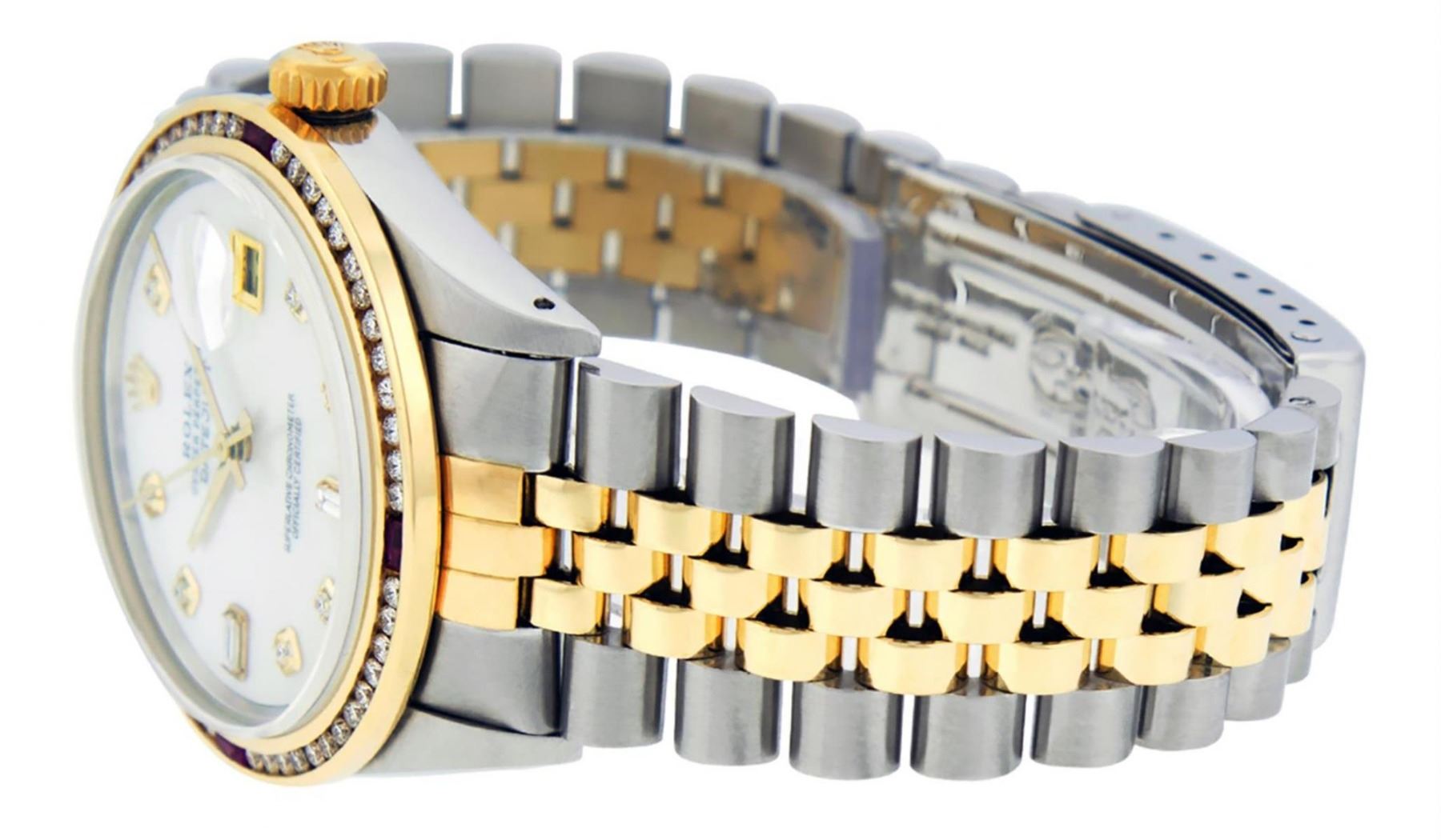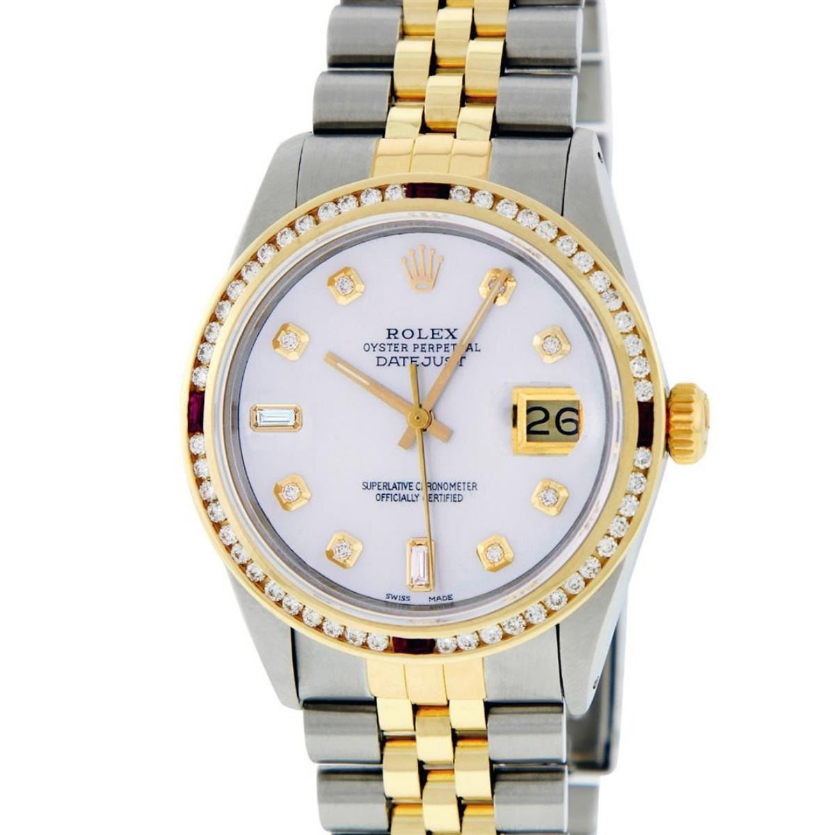 One Mens Yellow Gold Two Tone Rolex Datejust Polished, Serviced & Electronically Tested, Yellow Gold & Stainless Steel Case: 36mm, Yellow Gold Crown, Custom Bezel: 18K Yellow Gold Ruby Channel Set Diamond Bezel, Diamond Count: 52 Diamonds + 4 Rubies, Total Weight 1.30 Carat, Clarity: SI-VS, Color: G to H. Custom Crystal: New Scratch Resistant Synthetic Sapphire Cyclops Lens. Custom Hands: New Luminecent Hands. Movement: Automatic Winding Movement. Custom Dial: Mother Of Pearl Diamond Dial, Stone Count: 8 Diamonds + 2 Baguette Diamonds In Dial. Date Window: 3 O'Clock Position Date Display, Quickset, Model: Condition: G-6 Extra Fine. Bracelet: Two Tone Yellow Gold & Stainless Steel Jubilee. Bright Polish. 7.0 Inch Length, Adjustable. Standard Clasp, With Rolex Logo. This Watch Has Been Serviced Time Tested And Is In Excellent Condition It Is Free Of All Scratches And Dents.