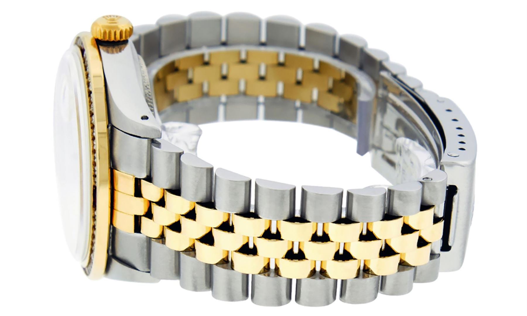 One Mens Pre Owned Yellow Gold Two Tone Rolex Datejust Polished, Serviced & Electronically Tested, Rolex Yellow Gold & Stainless Steel Case: 36mm, Rolex Yellow Gold Crown, Custom Bezel: New 18K Yellow Gold Ruby Channel Set Diamond Bezel, Diamond Count: 52 Diamonds + 4 Rubies, Total Weight 1.30 Carat, Clarity: SI-VS, Color: G to H. Custom Crystal: New Sapphire Magnified Date. Custom Hands: New Luminescent Hands. Rolex Movement: Automatic Winding Movement. Custom Dial: Mother Of Pearl Diamond Dial, Stone Count: 8 Diamonds + 2 Baguette Diamonds In Dial. Date Window: 3 O'Clock Position Date Display, Quickset, Model: Condition: G-6 Extra Fine. Rolex Bracelet: Two Tone Yellow Gold & Stainless Steel Jubilee. Bright Polish. 7.0 Inch Length, Adjustable. Standard Clasp, With Rolex Logo. This Watch Has Been Serviced Time Tested And Is In Excellent Condition It Is Free Of All Scratches And Dents.
