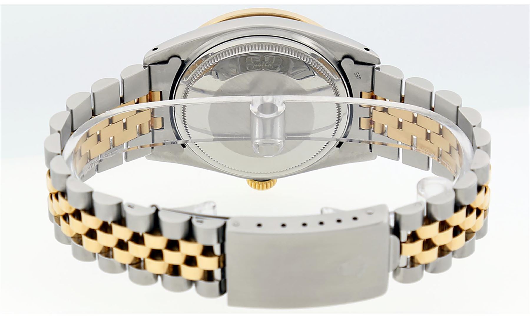 One Mens Pre Owned Yellow Gold Two Tone Rolex Datejust Polished, Serviced & Electronically Tested, Rolex Yellow Gold & Stainless Steel Case: 36mm, Rolex Yellow Gold Crown, Custom Bezel: New 18K Yellow Gold Sapphire Channel Set Diamond Bezel, Diamond Count: 52 Diamonds + 4 Sapphires, Clarity: SI-VS, Color: G to H. Custom Crystal: New Sapphire With Date Window. Custom Hands: New Hands. Rolex Movement: Automatic Winding Movement. Custom Dial: Mother Of Pearl Dial With Sapphire Hour Markers, Stone Count: 10 Sapphires in Dial. Date Window: 3 O'clock Position Date Display, Quickset, Model: Condition: G-6 Extra Fine. Rolex Bracelet: Two Tone Yellow Gold & Stainless Steel Jubilee. Bright Polish. 7.0 Inch Length, Adjustable. Standard Clasp, With Rolex Logo. This Watch Has Been Serviced Time Tested And Is In Excellent Condition It Is Free Of All Scratches And Dents. This Watch Comes With A Rolex Box.