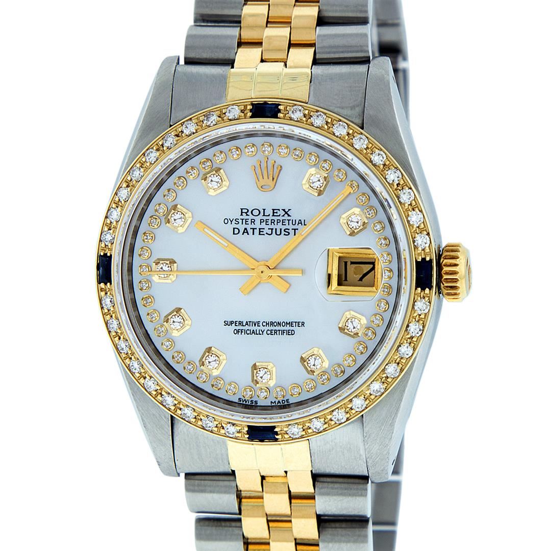 One Mens 14K Yellow Gold Two Tone Rolex Datejust Polished, Serviced & Electronically Tested, 14K Yellow Gold & Stainless Steel Case: 36mm, 14K Yellow Gold Crown, Custom Bezel: New 18K Yellow Gold Beadset + Sapphire Diamond Bezel, Diamond Count: 36 Diamonds + 4 Sapphires, Total Weight 1.00 Carat, Clarity: SI-VS, Color: G to H. Custom Crystal: New Scratch Resistant Synthetic Sapphire Cyclops Lens. Movement: Automatic Winding Movement Caliber 3035. Custom Dial: Mother Of String Diamond Dial, Diamond Count: 58 Diamonds, Color: G To H In Color, Clarity: SI-VS, Date Window: 3 O'Clock Position Date Display, Quickset, Model: 16013 Datejust, Condition: G-6 Extra Fine. Bracelet: Two Tone 14K Yellow Gold & Stainless Steel Jubilee Band. Bright Polish. 7.0 Inch Length, Adjustable. Standard Clasp, With Rolex Logo. This Watch Has Been Serviced Time Tested And Is In Excellent Condition It Is Free Of All Scratches And Dents.