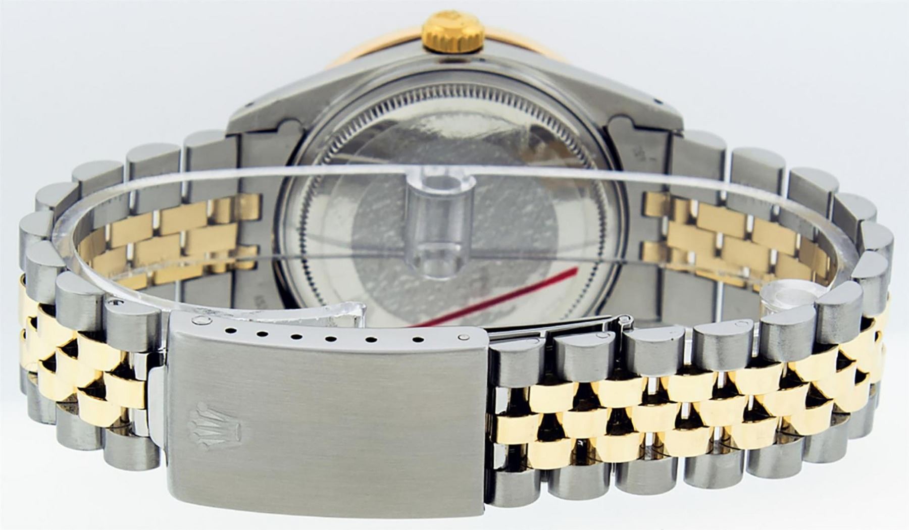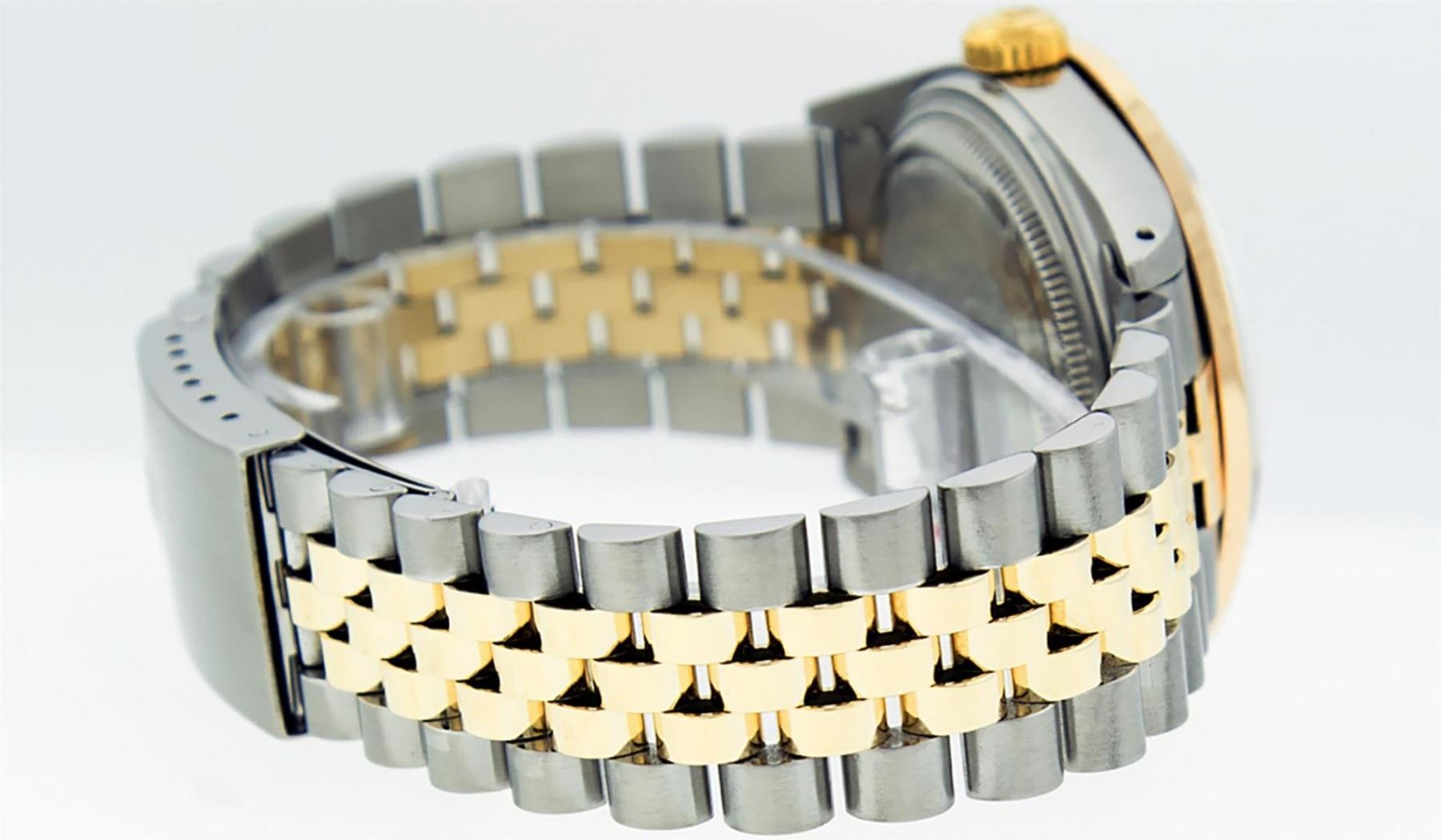 One Mens Yellow Gold Two Tone Rolex Datejust Polished Bright with Satin Finish, Serviced & Electronically Tested, Yellow Gold And Stainless Steel Case: 36mm, Yellow Gold Crown, Custom Bezel: New Yellow Gold Princess Cut Diamond Bezel, Diamond Count: 53 Diamonds, Total Weight 2.75 Carat, Clarity: SI-VS, Color: G to H. Custom Crystal: New Scratch Resistant Synthetic Sapphire Cyclops Lens. Custom Hands: New Luminescent Hands. Movement: Automatic Winding Movement. Custom Dial: Maroon Single Cut Diamond Dial, Diamond Count: 10 Diamonds in Dial, Dial Color: G To H In Color, Clarity: VS2. Date Window: 3 O'Clock Position Date Display, Quickset, Model: Datejust. Condition: G-6 Extra Fine. Bracelet: Yellow Gold And Stainless Steel Jubilee. Bright Polish & Satin Finish. 7.0 Inch Length, Adjustable. Standard Clasp, With Rolex Logo. This Watch Has Been Serviced and Polished And It Is Free Of All Dents And Scratches And Has Been Time Tested.
