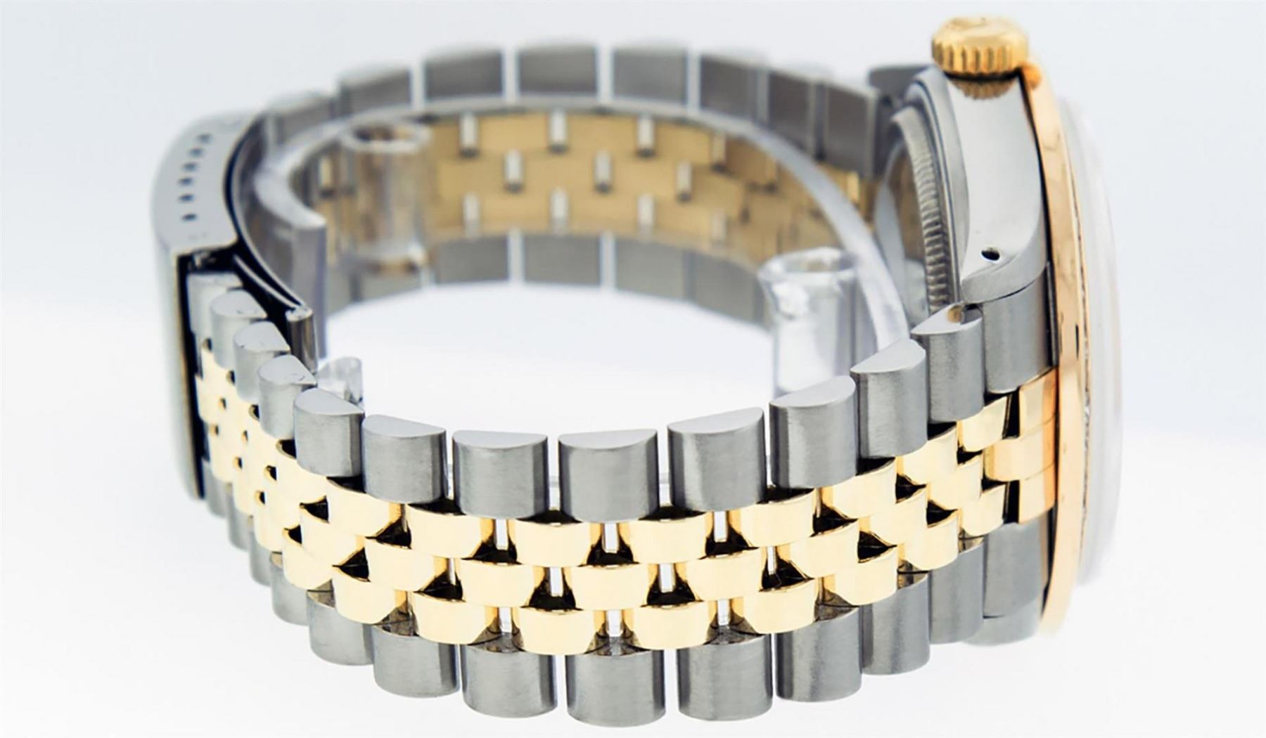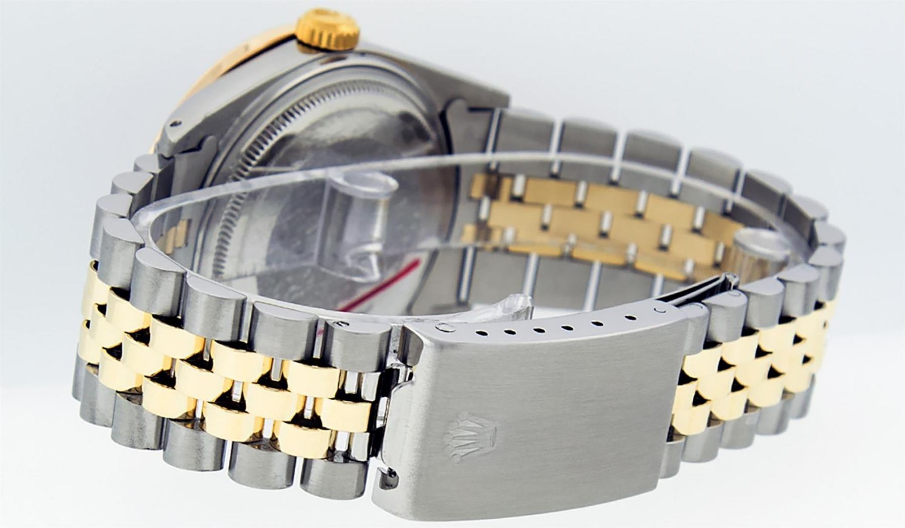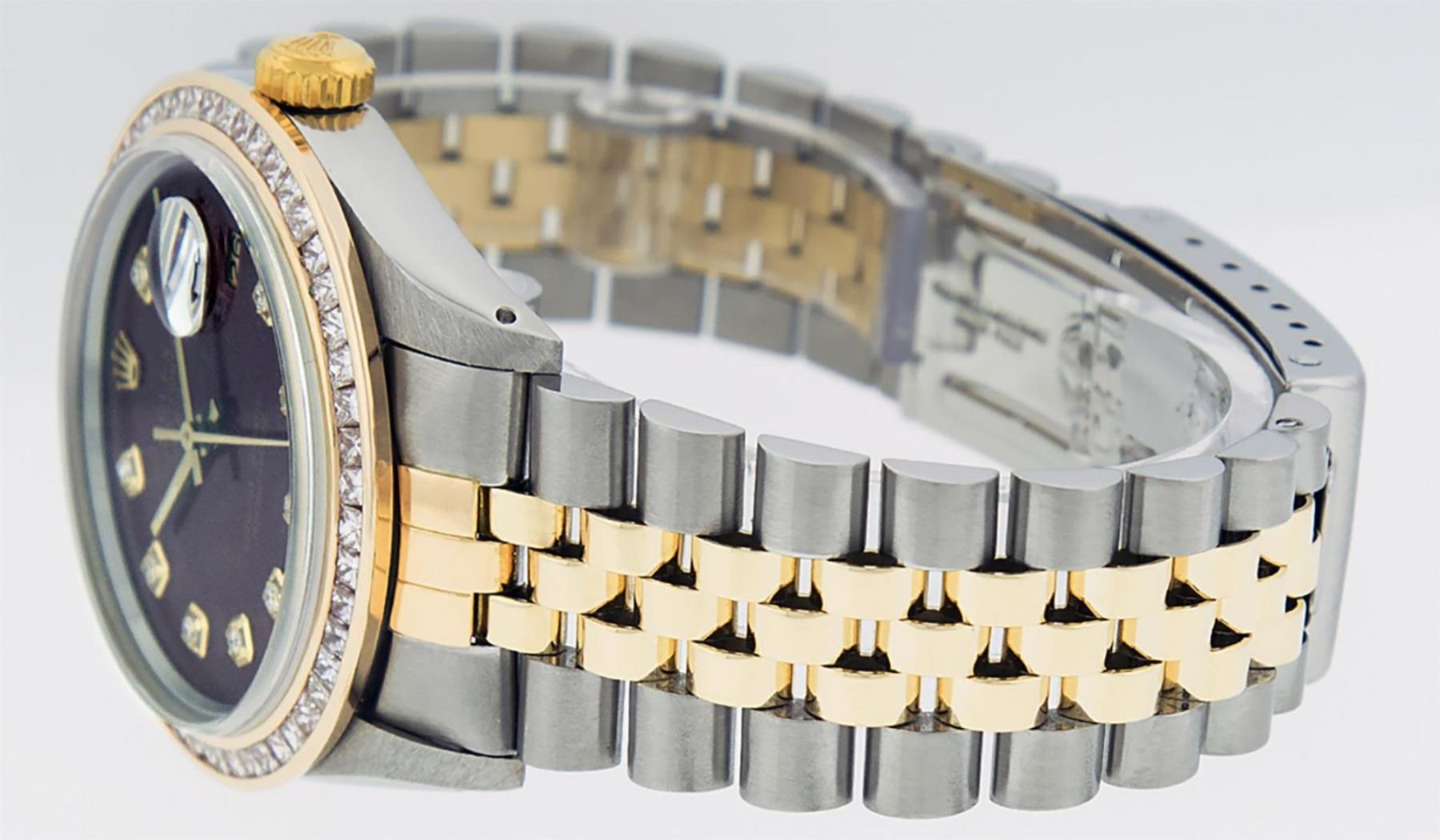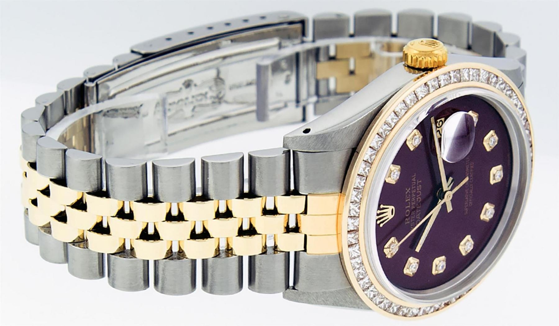 One Mens Yellow Gold Two Tone Rolex Datejust Polished Bright with Satin Finish, Serviced & Electronically Tested, Yellow Gold And Stainless Steel Case: 36mm, Yellow Gold Crown, Custom Bezel: New Yellow Gold Princess Cut Diamond Bezel, Diamond Count: 53 Diamonds, Total Weight 2.75 Carat, Clarity: SI-VS, Color: G to H. Custom Crystal: New Scratch Resistant Synthetic Sapphire Cyclops Lens. Custom Hands: New Luminescent Hands. Movement: Automatic Winding Movement. Custom Dial: Maroon Single Cut Diamond Dial, Diamond Count: 10 Diamonds in Dial, Dial Color: G To H In Color, Clarity: VS2. Date Window: 3 O'Clock Position Date Display, Quickset, Model: Datejust. Condition: G-6 Extra Fine. Bracelet: Yellow Gold And Stainless Steel Jubilee. Bright Polish & Satin Finish. 7.0 Inch Length, Adjustable. Standard Clasp, With Rolex Logo. This Watch Has Been Serviced and Polished And It Is Free Of All Dents And Scratches And Has Been Time Tested.