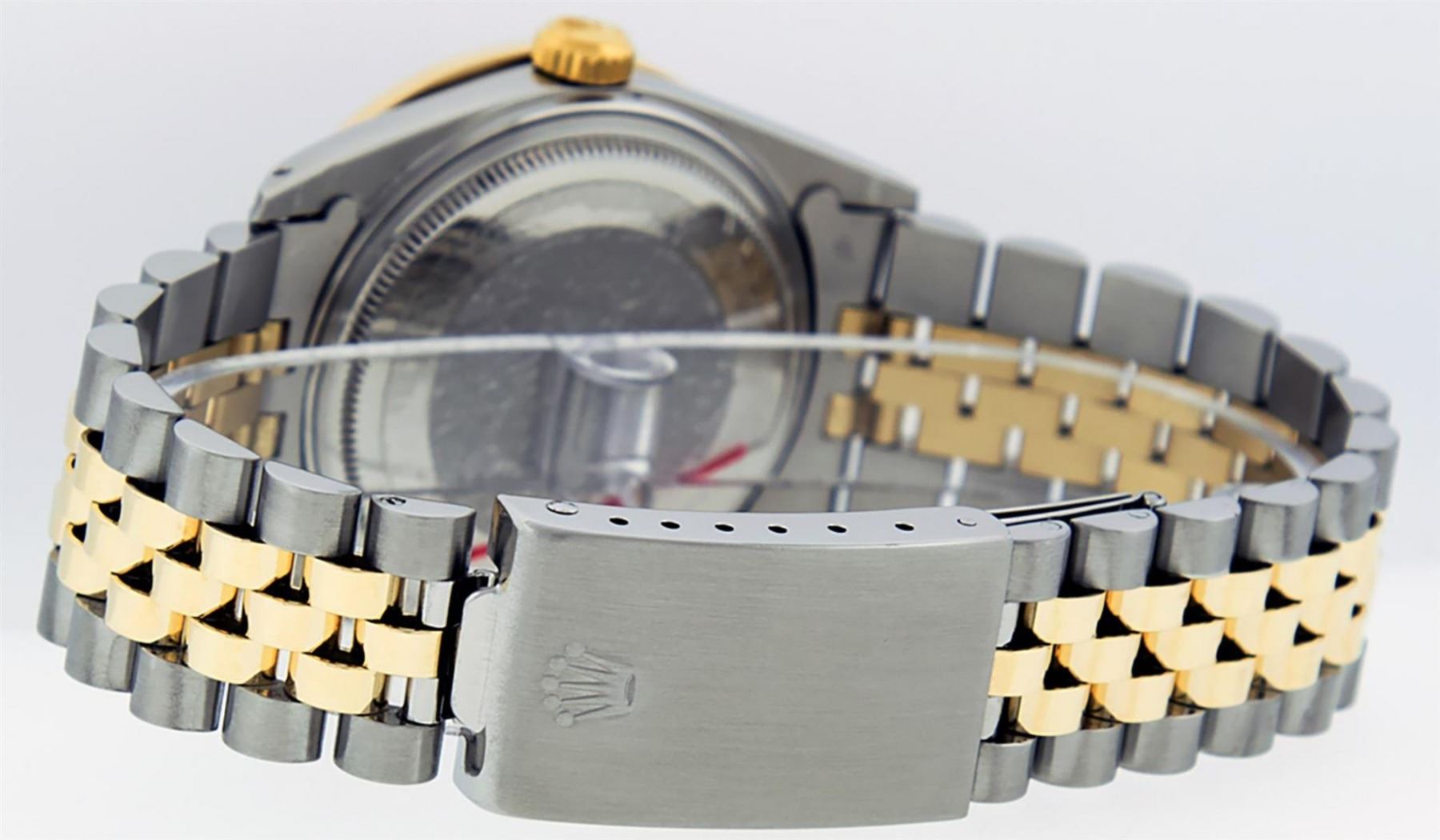 One Mens Yellow Gold Two Tone Rolex Datejust Polished, Serviced & Electronically Tested, Yellow Gold & Stainless Steel Case: 36mm, Yellow Gold Crown, Custom Bezel: 18K Yellow Gold Ruby Channel Set Diamond Bezel, Diamond Count: 52 Diamonds + 4 Rubies, Total Weight 1.30 Carat, Clarity: SI-VS, Color: G to H. Custom Crystal: New Scratch Resistant Synthetic Sapphire Cyclops Lens. Custom Hands: New Luminecent Hands. Movement: Automatic Winding Movement . Custom Dial: Maroon Diamond Dial With Single Cut Diamonds, Diamond Count: 10 Diamonds in Dial. Date Window: 3 O'Clock Position Date Display, Quickset, Model: Datejust. Condition: G-6 Extra Fine. Bracelet:Two Tone Yellow Gold & Stainless Steel Jubilee Band. Bright Polish. 7.0 Inch Length, Adjustable. Standard Clasp, With Rolex Logo. This Watch Has Been Serviced Time Tested And Is In Excellent Condition It Is Free Of All Scratches And Dents.