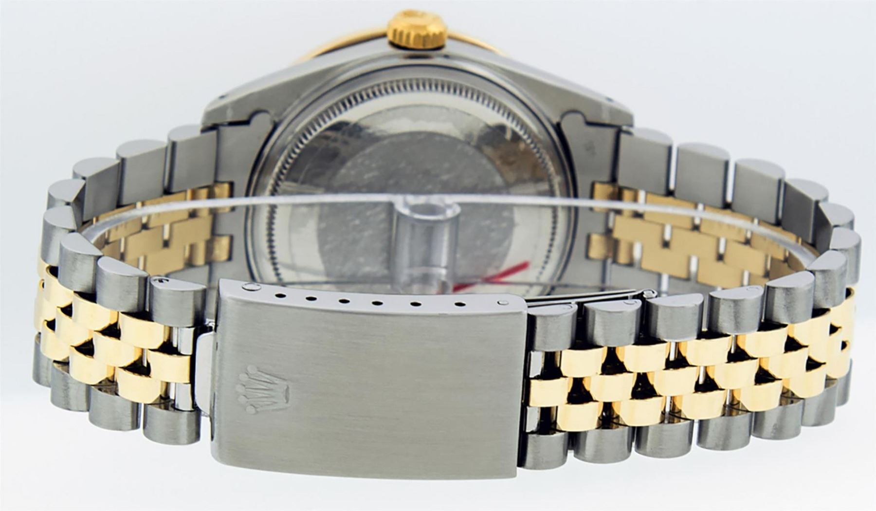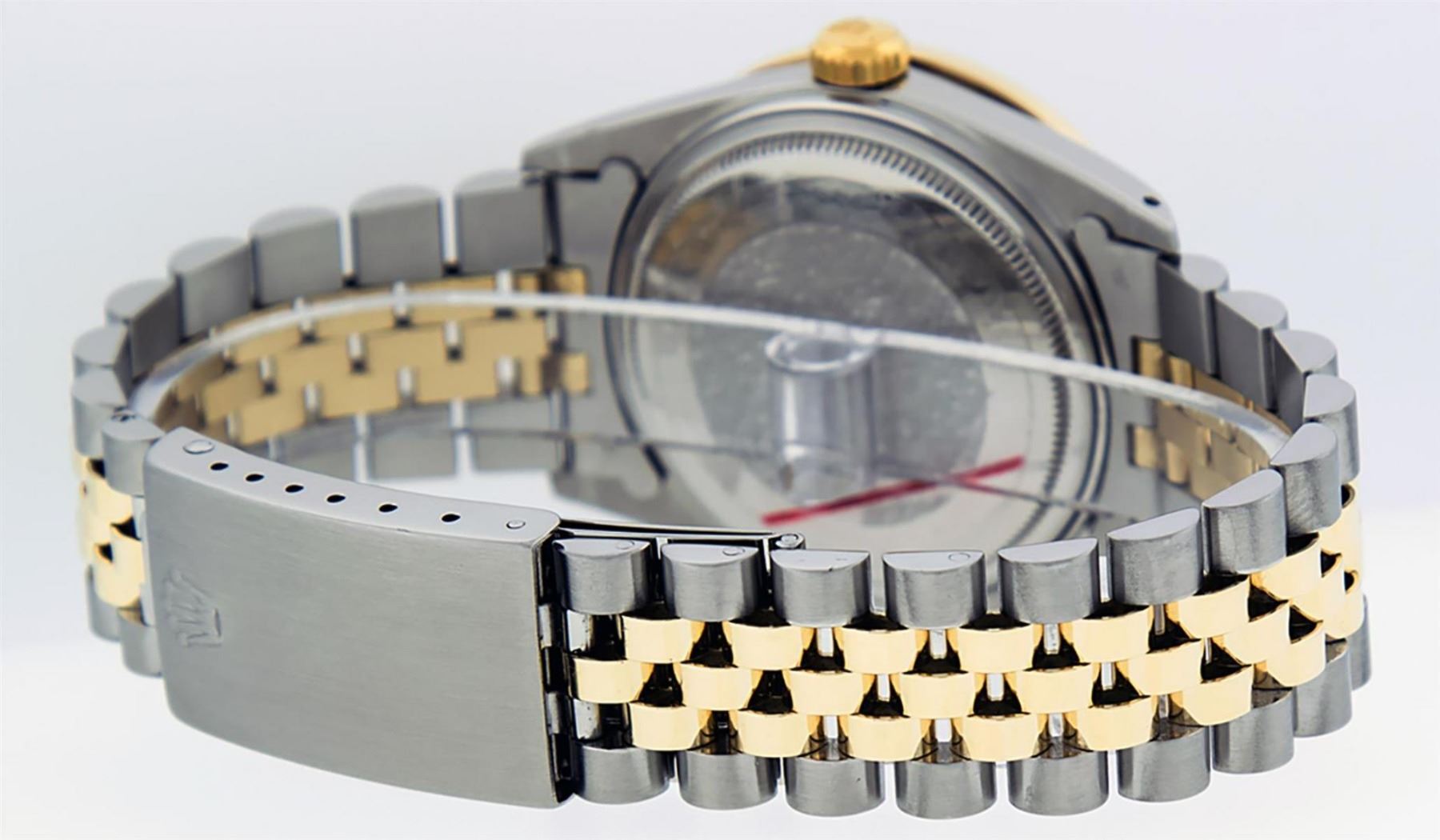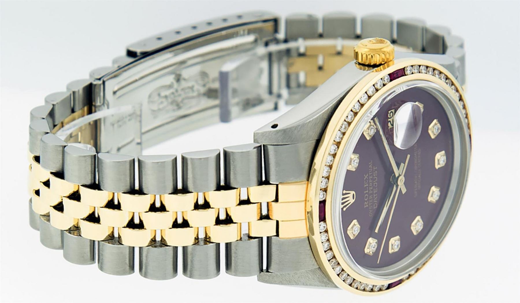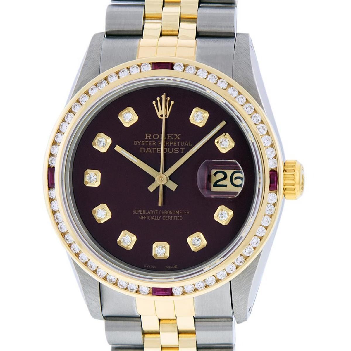 One Mens Yellow Gold Two Tone Rolex Datejust Polished, Serviced & Electronically Tested, Yellow Gold & Stainless Steel Case: 36mm, Yellow Gold Crown, Custom Bezel: 18K Yellow Gold Ruby Channel Set Diamond Bezel, Diamond Count: 52 Diamonds + 4 Rubies, Total Weight 1.30 Carat, Clarity: SI-VS, Color: G to H. Custom Crystal: New Scratch Resistant Synthetic Sapphire Cyclops Lens. Custom Hands: New Luminecent Hands. Movement: Automatic Winding Movement . Custom Dial: Maroon Diamond Dial With Single Cut Diamonds, Diamond Count: 10 Diamonds in Dial. Date Window: 3 O'Clock Position Date Display, Quickset, Model: Datejust. Condition: G-6 Extra Fine. Bracelet:Two Tone Yellow Gold & Stainless Steel Jubilee Band. Bright Polish. 7.0 Inch Length, Adjustable. Standard Clasp, With Rolex Logo. This Watch Has Been Serviced Time Tested And Is In Excellent Condition It Is Free Of All Scratches And Dents.