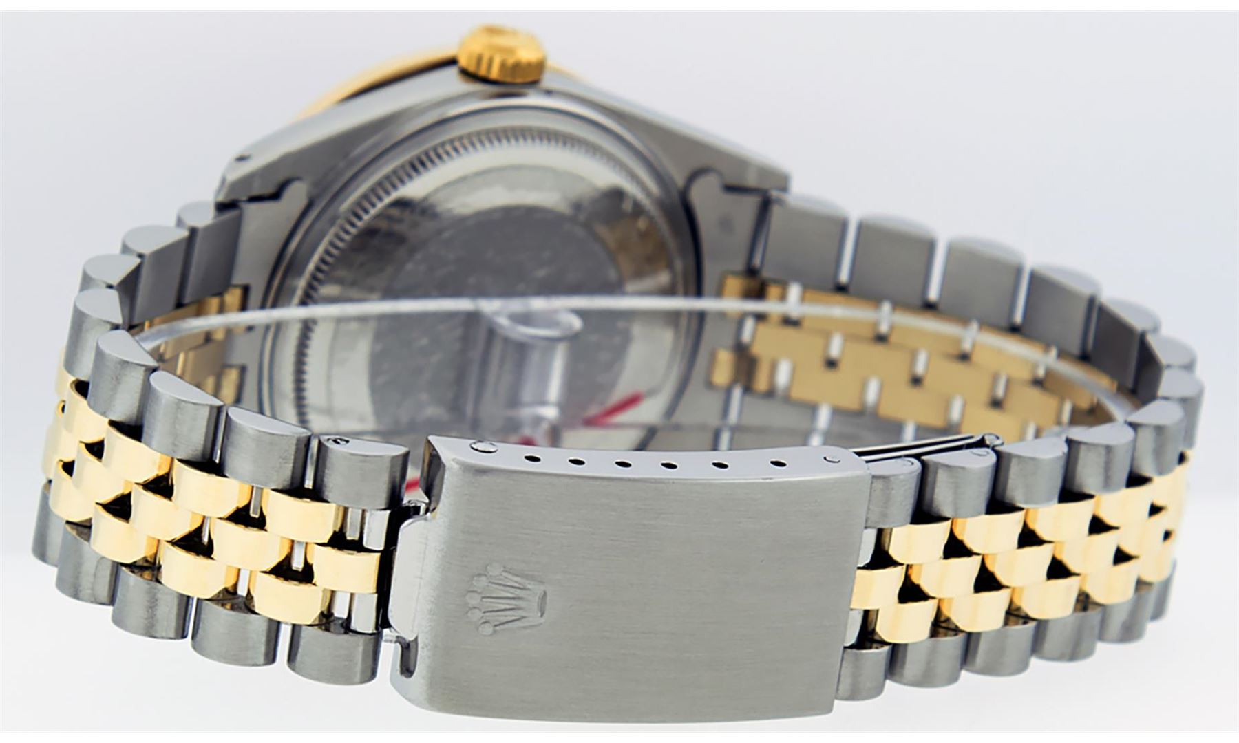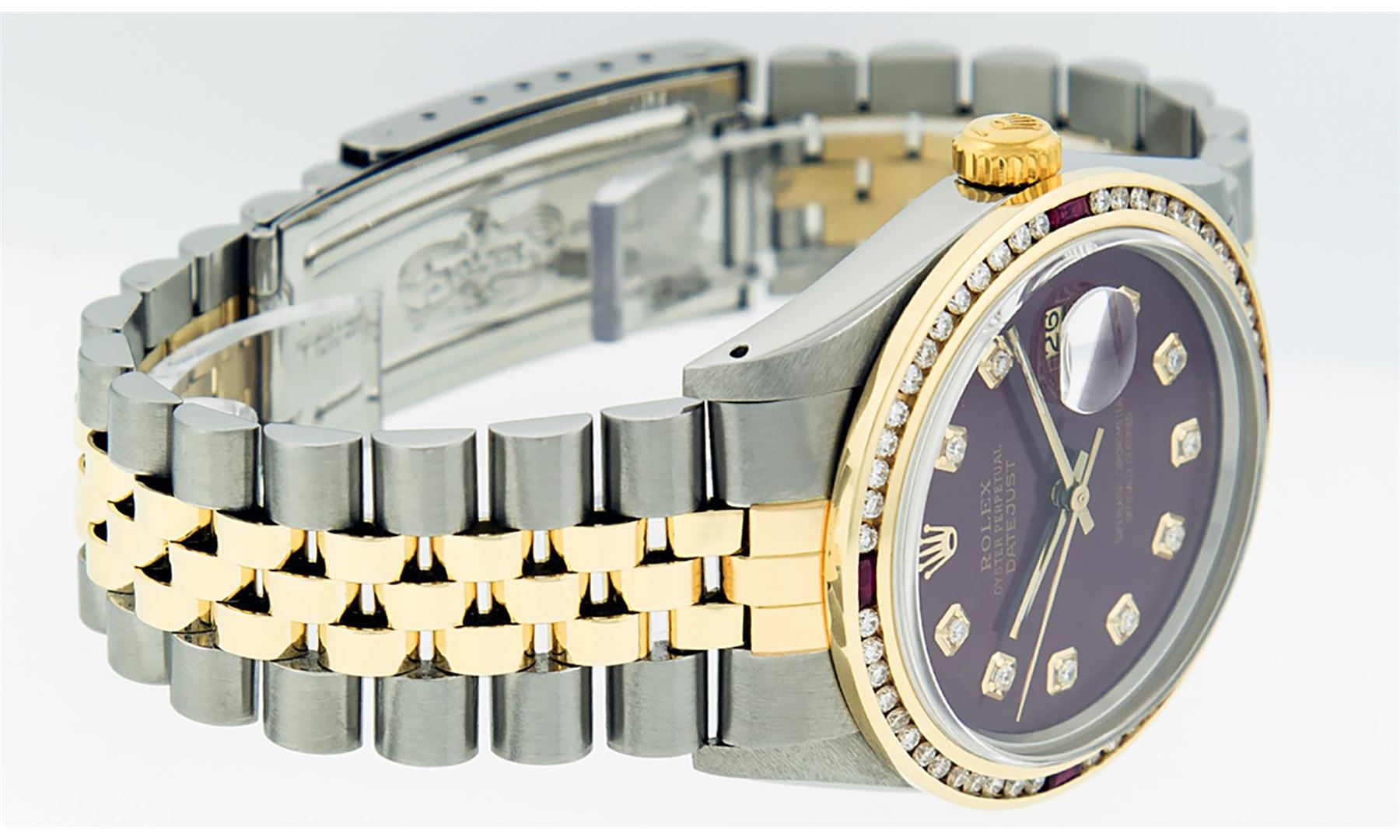 One Mens Pre Owned Yellow Gold Two Tone Rolex Datejust Polished, Serviced & Electronically Tested, Yellow Gold & Stainless Steel Case: 36mm, Yellow Gold Crown, Custom Bezel: 18K Yellow Gold Ruby Channel Set Diamond Bezel, Diamond Count: 52 Diamonds + 4 Ru