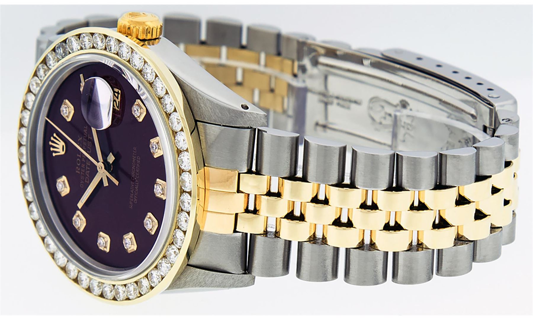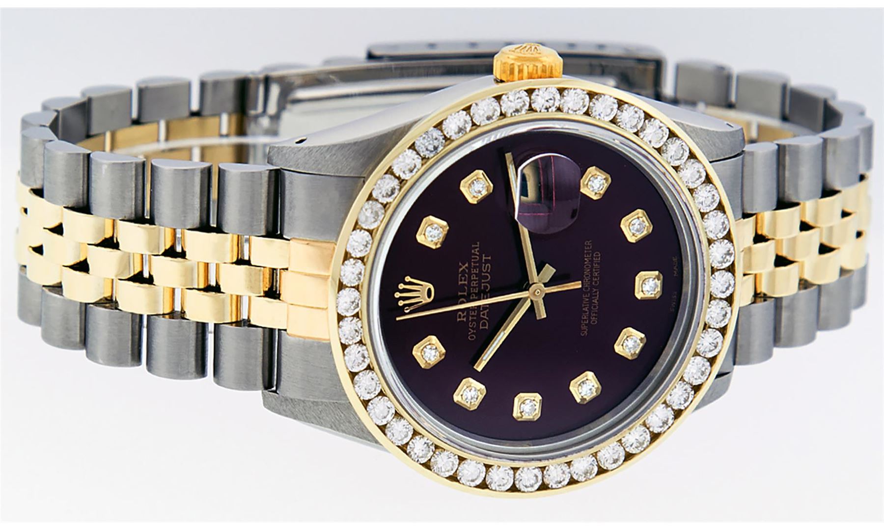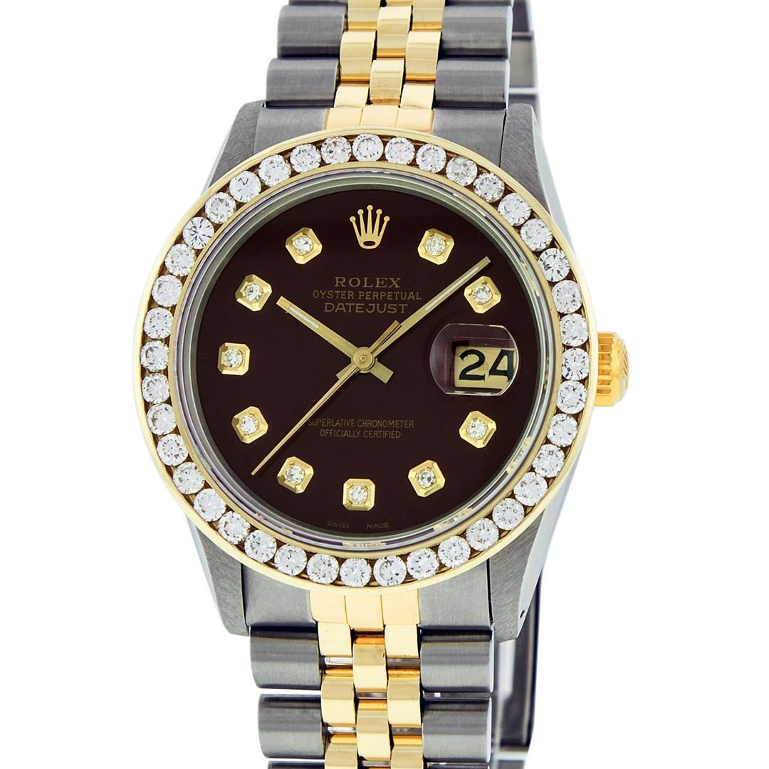 One Mens 14K Yellow Gold Rolex Datejust Polished Bright with Satin Finish, Serviced & Electronically Tested, Stainless Steel Case: 36mm, Yellow Gold Crown, Custom Bezel: New 18K Yellow Gold 3ct Channel Set Diamond Bezel, Diamond Count: 40 Diamonds In Bezel, Total Weight 3.00 Carat, Clarity: SI-VS, Color: G to H. Custom Crystal: New Scratch Resistent Synthetic Sapphire Cyclops Lens. Custom Hands: New Luminecent Hands. Movement: Automatic Winding Movement Caliber 3035. Custom Dial: Maroon Single Cut Diamond Dial, Diamond Count: 10 Diamonds In Dial, Color: G to H, Clarity: VS. Date Window: 3 O'Clock Position Date Display, Quickset, Model: Datejust. Condition: G-6 Extra Fine. Bracelet: 14K Yellow Gold And Stainless Steel Jubilee Band. Bright Polish & Satin Finish. 7.0 Inch Length, Adjustable. Standard Clasp, With Rolex Logo. This Watch Has Been Serviced And Polished It Is Free Of All Scratches And Dents.