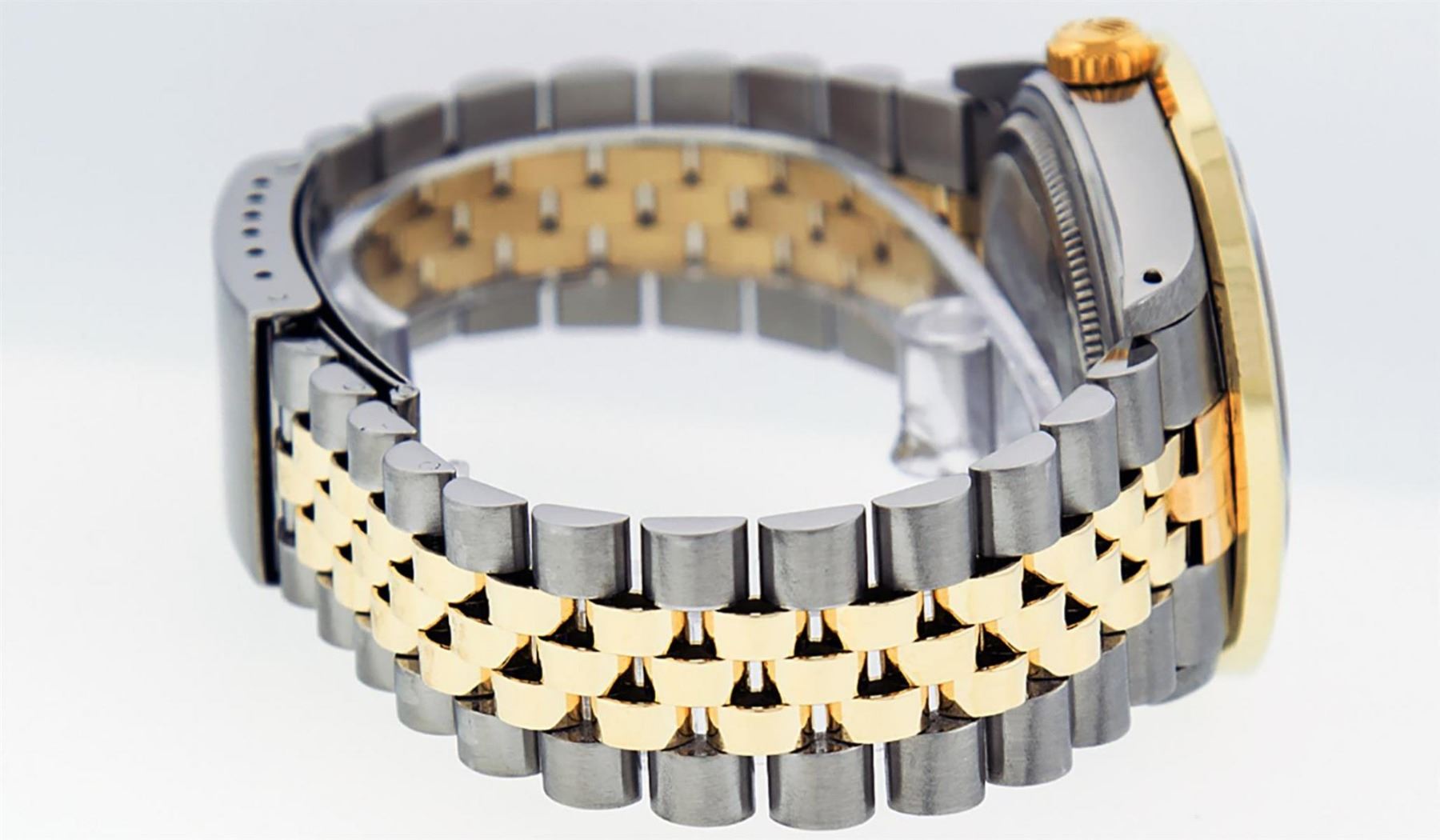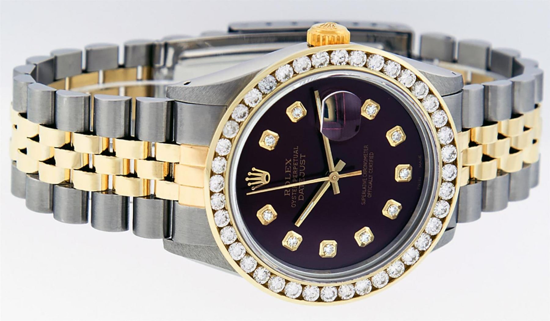 One Mens Yellow Gold Rolex Datejust Polished Bright with Satin Finish, Serviced & Electronically Tested, Stainless Steel Case: 36mm, Yellow Gold Crown, Custom Bezel: New 18K Yellow Gold 3ct Channel Set Diamond Bezel, Diamond Count: 40 Diamonds In Bezel, Total Weight 3.00 Carat, Clarity: SI-VS, Color: G to H. Custom Crystal: New Scratch Resistent Synthetic Sapphire Cyclops Lens. Custom Hands: New Luminecent Hands. Movement: Automatic Winding Movement. Custom Dial: Maroon Single Cut Diamond Dial, Diamond Count: 10 Diamonds In Dial, Color: G to H, Clarity: VS. Date Window: 3 O'Clock Position Date Display, Quickset, Model: Datejust. Condition: G-6 Extra Fine. Bracelet: Yellow Gold And Stainless Steel Jubilee Band. Bright Polish & Satin Finish. 7.0 Inch Length, Adjustable. Standard Clasp, With Rolex Logo. This Watch Has Been Serviced And Polished It Is Free Of All Scratches And Dents.