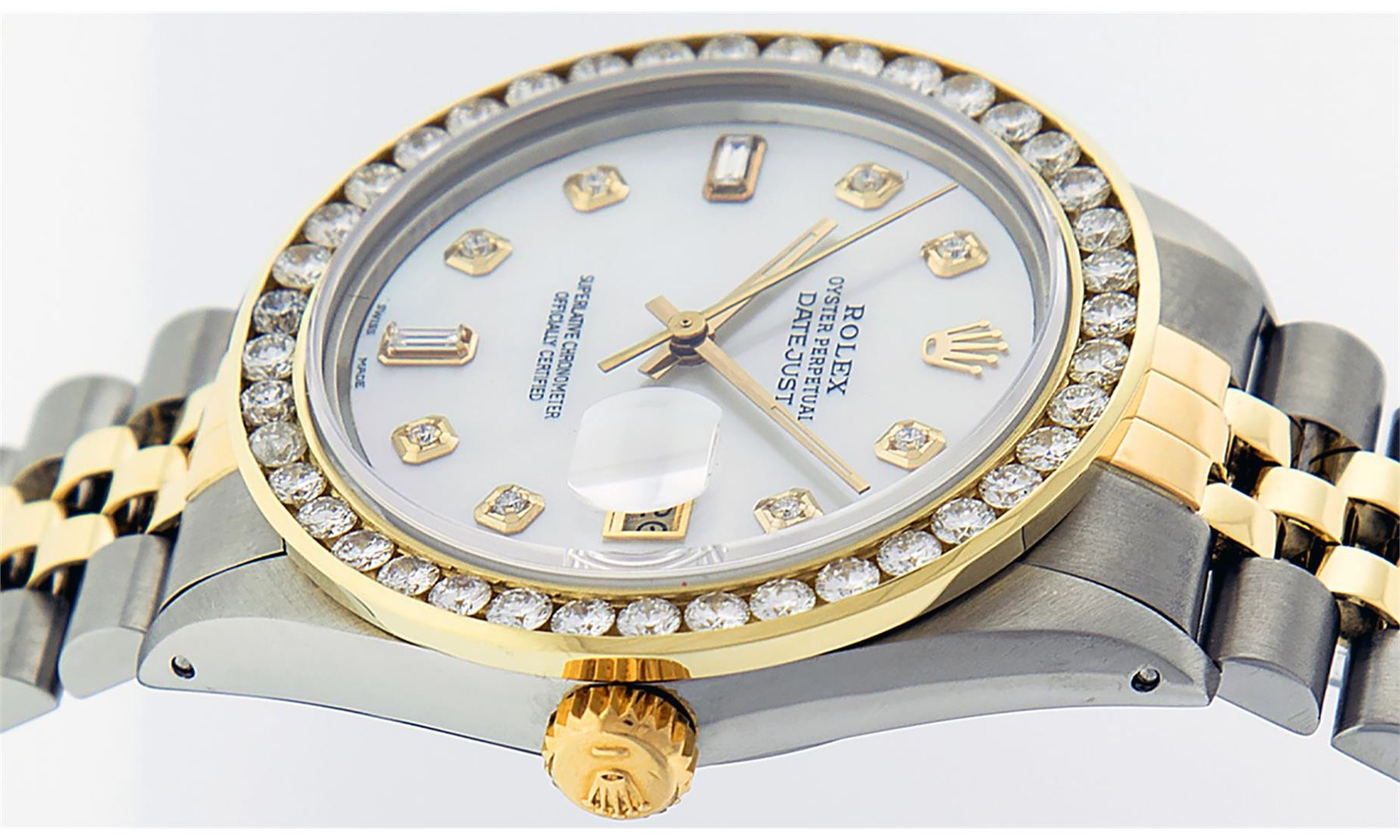 One Mens 14K Yellow Gold Rolex Datejust Polished Bright with Satin Finish, Serviced & Electronically Tested, Stainless Steel Case: 36mm, Yellow Gold Crown, Custom Bezel: New 18K Yellow Gold 3ct Channel Set Diamond Bezel, Diamond Count: 40 Diamonds, Total Weight 3.00 Carat, Clarity: SI-VS, Color: G to H. Custom Crystal: New Scratch Resistant Synthetic Sapphire Cyclops Lens. Custom Hands: New Luminecent Hands. Movement: Automatic Winding Movement Caliber 3035. Custom Dial: Mother Of Pearl Diamond Dial, Diamond Count: 8 Diamonds + 2 Baguette Diamonds In Dial, Color: G to H, Clarity: SI-VS. Date Window: 3 O'Clock Position Date Display, Quickset, Model: 16013 Datejust. Condition: G-6 Extra Fine. Bracelet: 14K Yellow Gold And Stainless Steel Jubilee Band. Bright Polish & Satin Finish. 7.0 Inch Length, Adjustable. Standard Clasp, With Rolex Logo. This Watch Has Been Serviced And Polished It Is Free Of All Scratches And Dents.