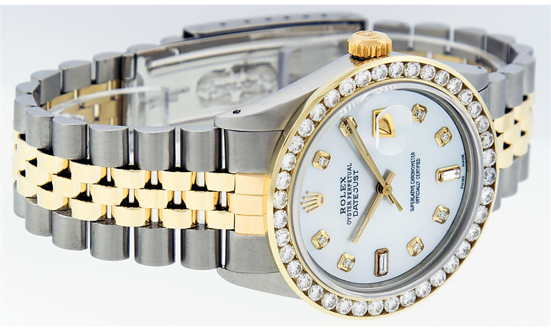 One Mens 14K Yellow Gold Rolex Datejust Polished Bright with Satin Finish, Serviced & Electronically Tested, Stainless Steel Case: 36mm, Yellow Gold Crown, Custom Bezel: New 18K Yellow Gold 3ct Channel Set Diamond Bezel, Diamond Count: 40 Diamonds, Total Weight 3.00 Carat, Clarity: SI-VS, Color: G to H. Custom Crystal: New Scratch Resistant Synthetic Sapphire Cyclops Lens. Custom Hands: New Luminecent Hands. Movement: Automatic Winding Movement Caliber 3035. Custom Dial: Mother Of Pearl Diamond Dial, Diamond Count: 8 Diamonds + 2 Baguette Diamonds In Dial, Color: G to H, Clarity: SI-VS. Date Window: 3 O'Clock Position Date Display, Quickset, Model: 16013 Datejust. Condition: G-6 Extra Fine. Bracelet: 14K Yellow Gold And Stainless Steel Jubilee Band. Bright Polish & Satin Finish. 7.0 Inch Length, Adjustable. Standard Clasp, With Rolex Logo. This Watch Has Been Serviced And Polished It Is Free Of All Scratches And Dents.