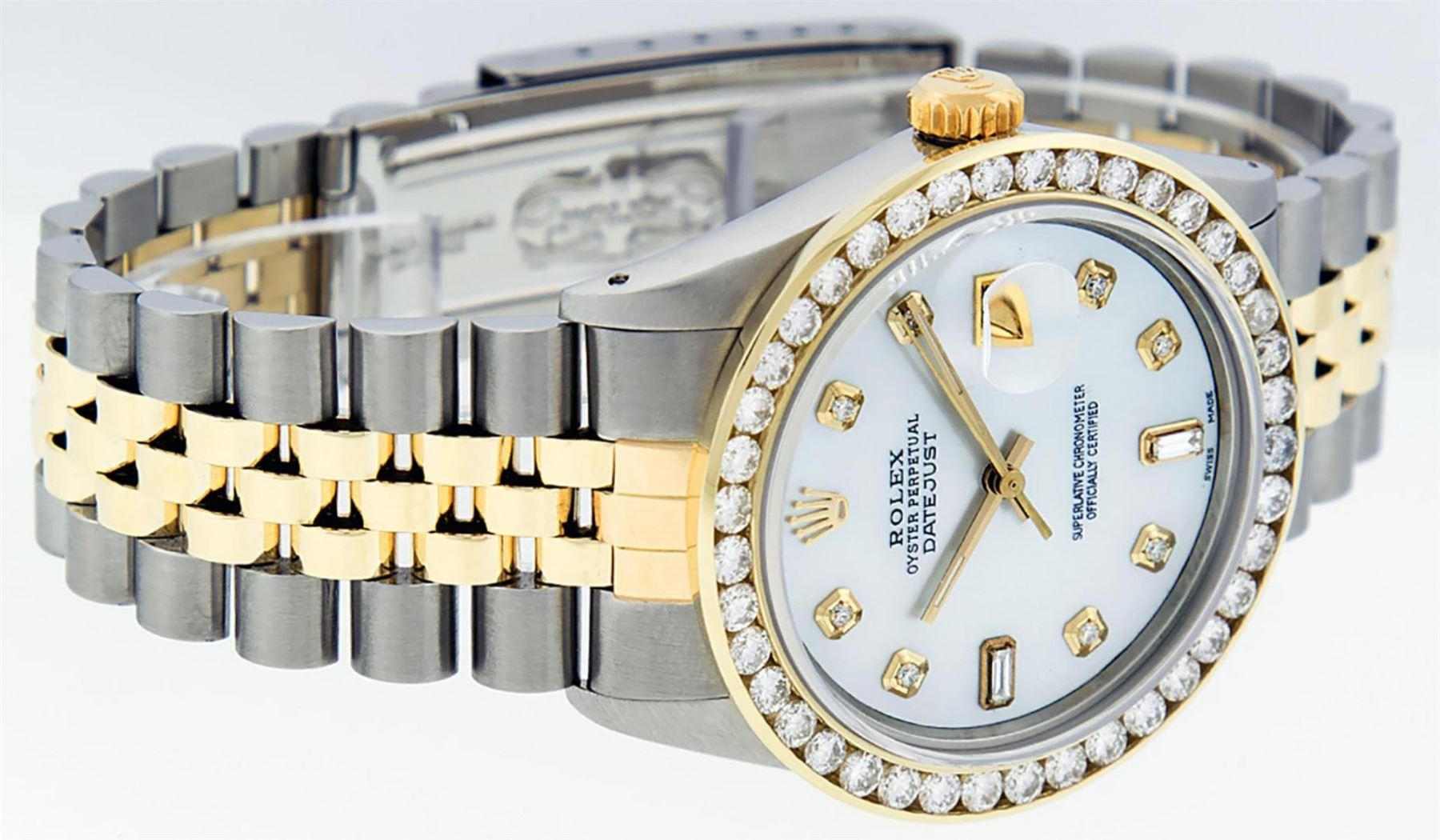 One Mens 14K Yellow Gold Rolex Datejust Polished Bright with Satin Finish, Serviced & Electronically Tested, Stainless Steel Case: 36mm, Yellow Gold Crown, Custom Bezel: New 18K Yellow Gold 3ct Channel Set Diamond Bezel, Diamond Count: 40 Diamonds, Total Weight 3.00 Carat, Clarity: SI-VS, Color: G to H. Custom Crystal: New Scratch Resistant Synthetic Sapphire Cyclops Lens. Custom Hands: New Luminecent Hands. Movement: Automatic Winding Movement Caliber 3035. Custom Dial: Mother Of Pearl Diamond Dial, Diamond Count: 8 Diamonds + 2 Baguette Diamonds In Dial, Color: G to H, Clarity: SI-VS. Date Window: 3 O'Clock Position Date Display, Quickset, Model: 16013 Datejust. Condition: G-6 Extra Fine. Bracelet: 14K Yellow Gold And Stainless Steel Jubilee Band. Bright Polish & Satin Finish. 7.0 Inch Length, Adjustable. Standard Clasp, With Rolex Logo. This Watch Has Been Serviced And Polished It Is Free Of All Scratches And Dents.