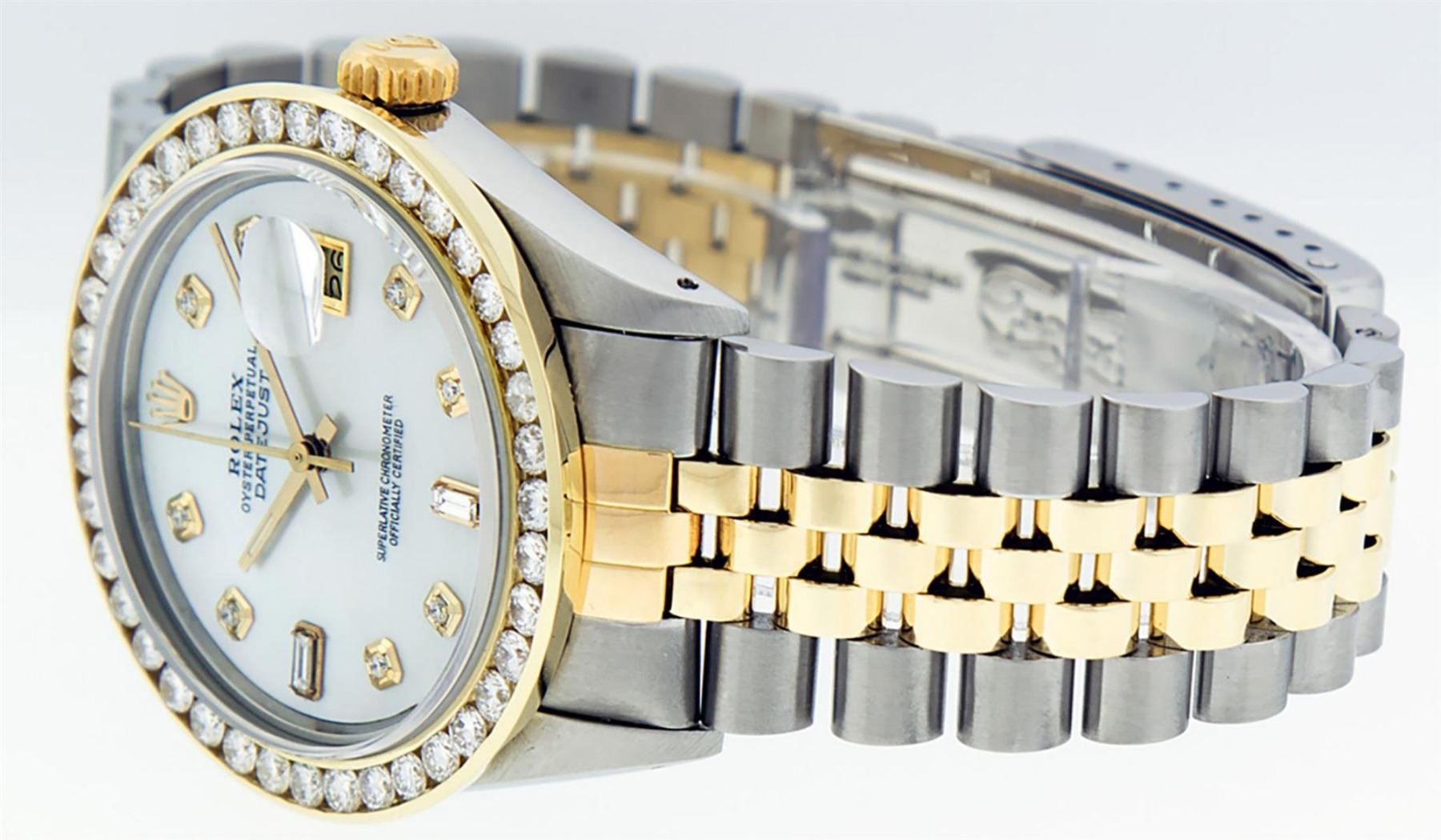 One Mens 14K Yellow Gold Rolex Datejust Polished Bright with Satin Finish, Serviced & Electronically Tested, Stainless Steel Case: 36mm, Yellow Gold Crown, Custom Bezel: New 18K Yellow Gold 3ct Channel Set Diamond Bezel, Diamond Count: 40 Diamonds, Total Weight 3.00 Carat, Clarity: SI-VS, Color: G to H. Custom Crystal: New Scratch Resistant Synthetic Sapphire Cyclops Lens. Custom Hands: New Luminecent Hands. Movement: Automatic Winding Movement Caliber 3035. Custom Dial: Mother Of Pearl Diamond Dial, Diamond Count: 8 Diamonds + 2 Baguette Diamonds In Dial, Color: G to H, Clarity: SI-VS. Date Window: 3 O'Clock Position Date Display, Quickset, Model: 16013 Datejust. Condition: G-6 Extra Fine. Bracelet: 14K Yellow Gold And Stainless Steel Jubilee Band. Bright Polish & Satin Finish. 7.0 Inch Length, Adjustable. Standard Clasp, With Rolex Logo. This Watch Has Been Serviced And Polished It Is Free Of All Scratches And Dents.