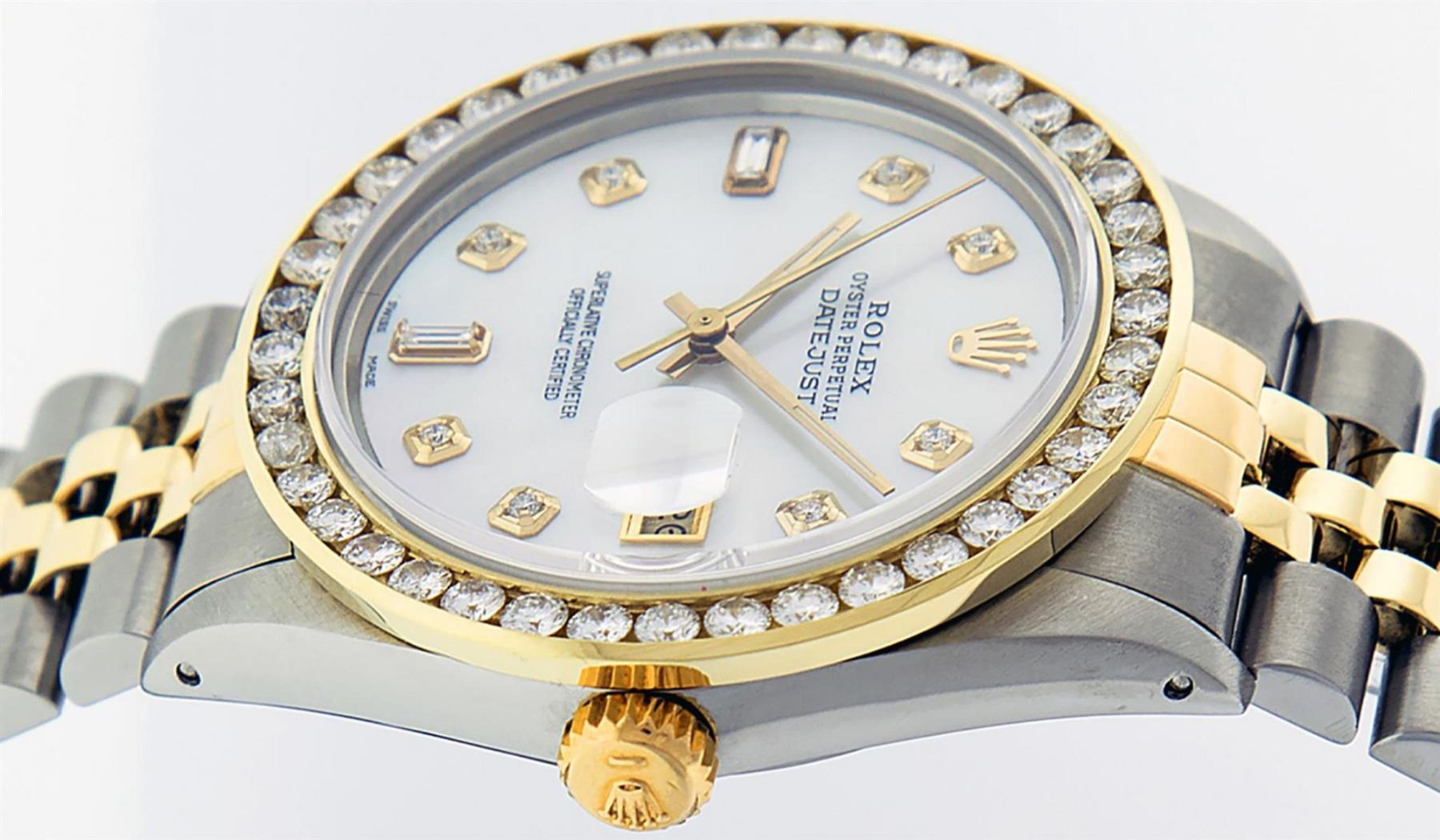 One Mens 14K Yellow Gold Rolex Datejust Polished Bright with Satin Finish, Serviced & Electronically Tested, Stainless Steel Case: 36mm, Yellow Gold Crown, Custom Bezel: New 18K Yellow Gold 3ct Channel Set Diamond Bezel, Diamond Count: 40 Diamonds, Total Weight 3.00 Carat, Clarity: SI-VS, Color: G to H. Custom Crystal: New Scratch Resistant Synthetic Sapphire Cyclops Lens. Custom Hands: New Luminecent Hands. Movement: Automatic Winding Movement Caliber 3035. Custom Dial: Mother Of Pearl Diamond Dial, Diamond Count: 8 Diamonds + 2 Baguette Diamonds In Dial, Color: G to H, Clarity: SI-VS. Date Window: 3 O'Clock Position Date Display, Quickset, Model: 16013 Datejust. Condition: G-6 Extra Fine. Bracelet: 14K Yellow Gold And Stainless Steel Jubilee Band. Bright Polish & Satin Finish. 7.0 Inch Length, Adjustable. Standard Clasp, With Rolex Logo. This Watch Has Been Serviced And Polished It Is Free Of All Scratches And Dents.