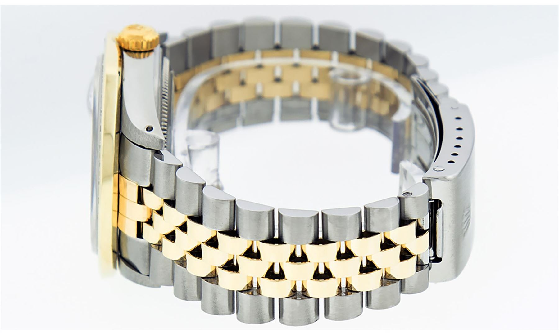 One Mens Yellow Gold Rolex Datejust Polished Bright with Satin Finish, Serviced & Electronically Tested, Stainless Steel Case: 36mm, Yellow Gold Crown, Custom Bezel: New 18K Yellow Gold 3ct Channel Set Diamond Bezel, Diamond Count: 40 Diamonds, Total Weight 3.00 Carat, Clarity: SI-VS, Color: G to H. Custom Crystal: New Scratch Resistant Synthetic Sapphire Cyclops Lens. Custom Hands: New Luminecent Hands. Movement: Automatic Winding Movement . Custom Dial: Mother Of Pearl Diamond Dial, Diamond Count: 8 Diamonds + 2 Baguette Diamonds In Dial, Color: G to H, Clarity: SI-VS. Date Window: 3 O'Clock Position Date Display, Quickset, Model: Datejust. Condition: G-6 Extra Fine. Bracelet: Yellow Gold And Stainless Steel Jubilee Band. Bright Polish & Satin Finish. 7.0 Inch Length, Adjustable. Standard Clasp, With Rolex Logo. This Watch Has Been Serviced And Polished It Is Free Of All Scratches And Dents.