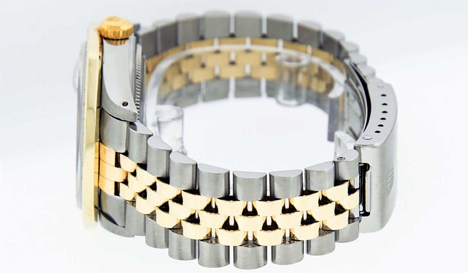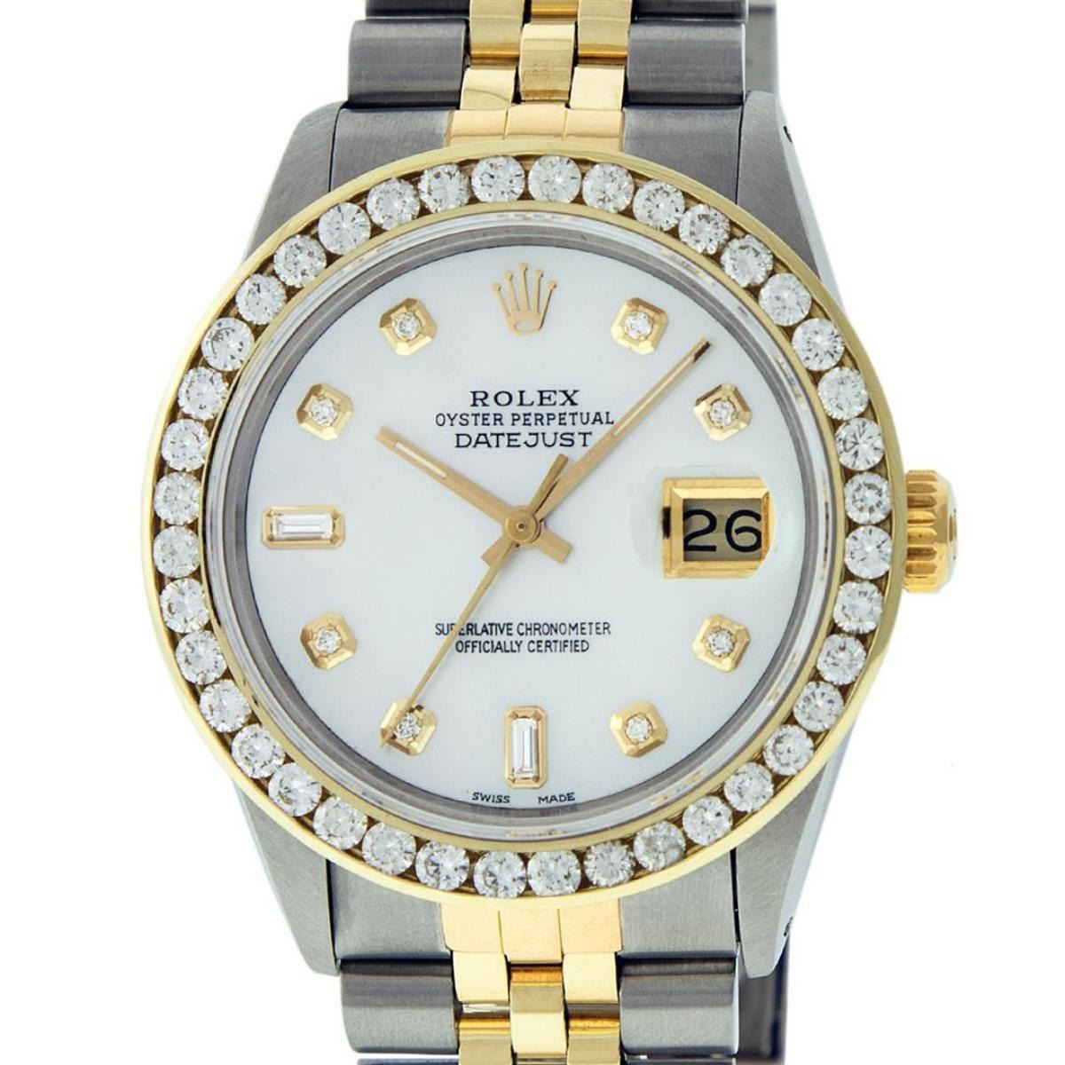 One Mens Yellow Gold Rolex Datejust Polished Bright with Satin Finish, Serviced & Electronically Tested, Stainless Steel Case: 36mm, Yellow Gold Crown, Custom Bezel: New 18K Yellow Gold 3ct Channel Set Diamond Bezel, Diamond Count: 40 Diamonds, Total Weight 3.00 Carat, Clarity: SI-VS, Color: G to H. Custom Crystal: New Scratch Resistant Synthetic Sapphire Cyclops Lens. Custom Hands: New Luminecent Hands. Movement: Automatic Winding Movement . Custom Dial: Mother Of Pearl Diamond Dial, Diamond Count: 8 Diamonds + 2 Baguette Diamonds In Dial, Color: G to H, Clarity: SI-VS. Date Window: 3 O'Clock Position Date Display, Quickset, Model: Datejust. Condition: G-6 Extra Fine. Bracelet: Yellow Gold And Stainless Steel Jubilee Band. Bright Polish & Satin Finish. 7.0 Inch Length, Adjustable. Standard Clasp, With Rolex Logo. This Watch Has Been Serviced And Polished It Is Free Of All Scratches And Dents.
