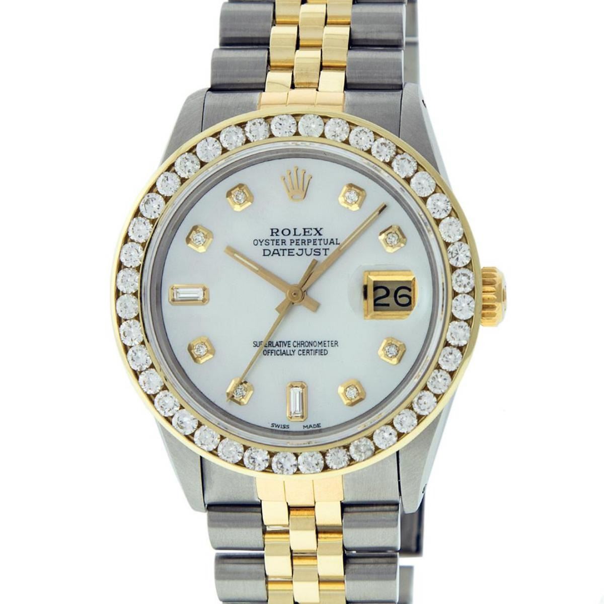 One Mens Yellow Gold Rolex Datejust Polished Bright with Satin Finish, Serviced & Electronically Tested, Stainless Steel Case: 36mm, Yellow Gold Crown, Custom Bezel: New 18K Yellow Gold 3ct Channel Set Diamond Bezel, Diamond Count: 40 Diamonds, Total Weight 3.00 Carat, Clarity: SI-VS, Color: G to H. Custom Crystal: New Scratch Resistant Synthetic Sapphire Cyclops Lens. Custom Hands: New Luminecent Hands. Movement: Automatic Winding Movement . Custom Dial: Mother Of Pearl Diamond Dial, Diamond Count: 8 Diamonds + 2 Baguette Diamonds In Dial, Color: G to H, Clarity: SI-VS. Date Window: 3 O'Clock Position Date Display, Quickset, Model: Datejust. Condition: G-6 Extra Fine. Bracelet: Yellow Gold And Stainless Steel Jubilee Band. Bright Polish & Satin Finish. 7.0 Inch Length, Adjustable. Standard Clasp, With Rolex Logo. This Watch Has Been Serviced And Polished It Is Free Of All Scratches And Dents.