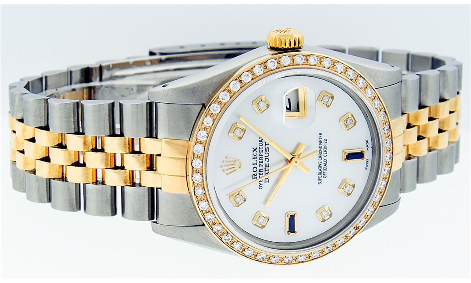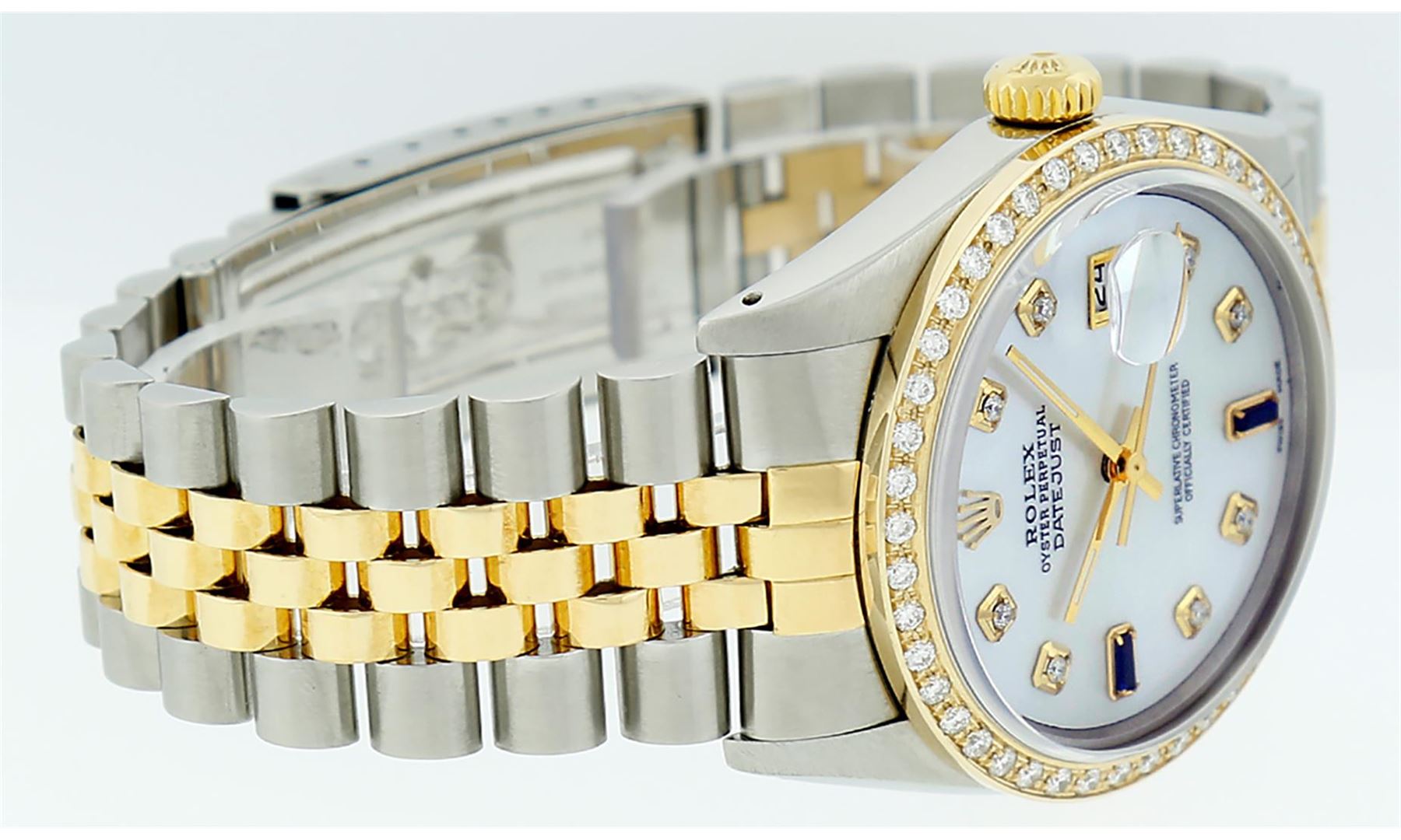 One Mens Yellow Gold Two Tone Rolex Datejust Polished, Serviced & Electronically Tested, Yellow Gold & Stainless Steel Case: 36mm, Yellow Gold Crown, Custom Bezel: New 18K Yellow Gold Beadset Diamond Bezel, Diamond Count: 44 Diamonds, Total Weight 1.00 Carat, Clarity: SI-VS, Color: G to H. Custom Crystal: New Synthetic Sapphire Cyclops Lens. Movement: Automatic Winding Movement . Custom Dial: Mother Of Pearl Dial Set With Diamond Hour Markers and Synthetic Sapphire Baguette Markers On 6 and 9, Diamond Count: 8 + 2 Synthetic Sapphire Bagguettes, Color: G To H In Color, Clarity: SI-VS, Date Window: 3 O'Clock Position Date Display, Quickset, Model: Condition: G-6 Extra Fine. Bracelet: Two Tone Yellow Gold & Stainless Steel Jubilee. Bright Polish. 7.0 Inch Length, Adjustable. Standard Clasp, With Rolex Logo. This Watch Has Been Serviced Time Tested And Is In Excellent Condition It Is Free Of All Scratches And Dents.