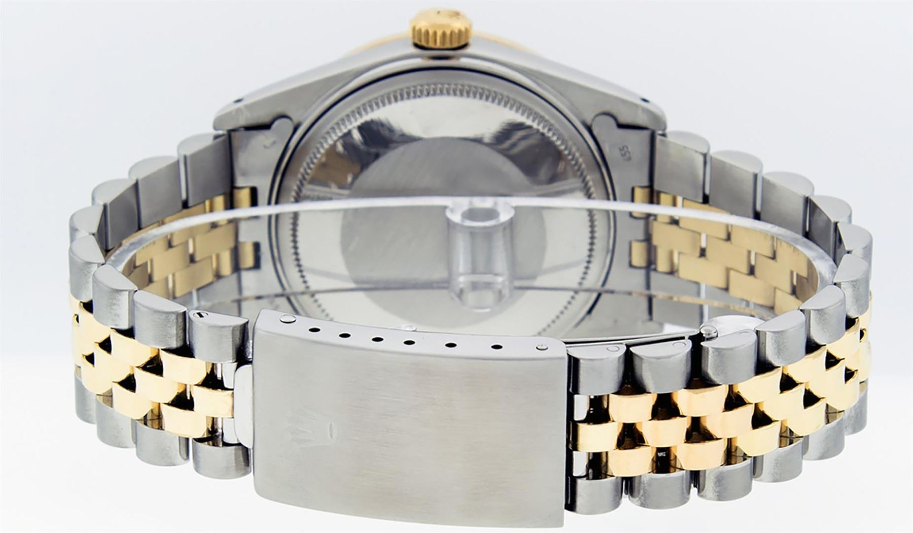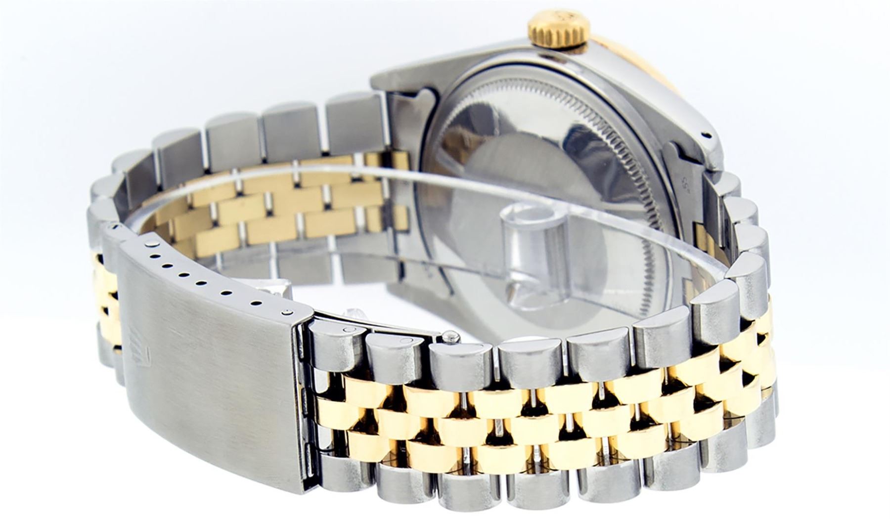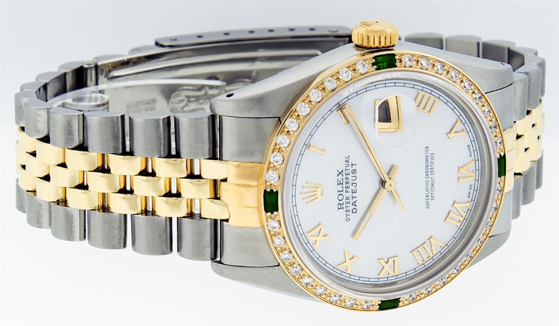 One Mens Pre Owned Yellow Gold Two Tone Rolex Datejust Polished, Serviced & Electronically Tested, Yellow Gold & Stainless Steel Case: 36mm, Yellow Gold Crown, Custom Bezel: New 18K Yellow Gold Beadset & Emerald Diamond Bezel, Stone Count: 36 Diamonds + 4