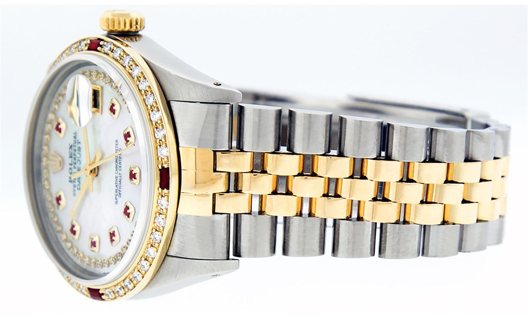 One Mens Yellow Gold Two Tone Rolex Datejust Polished, Serviced & Electronically Tested, Yellow Gold & Stainless Steel Case: 36mm, Yellow Gold Crown, Custom Bezel: New 18K Yellow Gold Ruby Beadset Diamond Bezel, Diamond Count: 36 Diamonds + 4 Rubies, Total Weight 1.00 Carat, Clarity: SI-VS, Color: G to H. Custom Crystal: New Scratch Resistant Synthetic Sapphire Cyclops Lens. Custom Hands: New Luminecent Hands. Movement: Automatic Winding Movement. Custom Dial: Mother Of Pearl Ruby String Diamond Dial, Diamond + Gem Count: 10 Rubies + 48 Diamonds in Dial, G To H In Color, SI-VS Clarity. Date Window: 3 O'Clock Position Date Display, Quickset, Model: Datejust. Condition: G-6 Extra Fine. Bracelet: Two Tone Yellow Gold & Stainless Steel Jubilee. Bright Polish. 7.0 Inch Length, Adjustable. Standard Clasp, With Rolex Logo. This Watch Has Been Serviced Time Tested And Is In Excellent Condition It Is Free Of All Scratches And Dents.