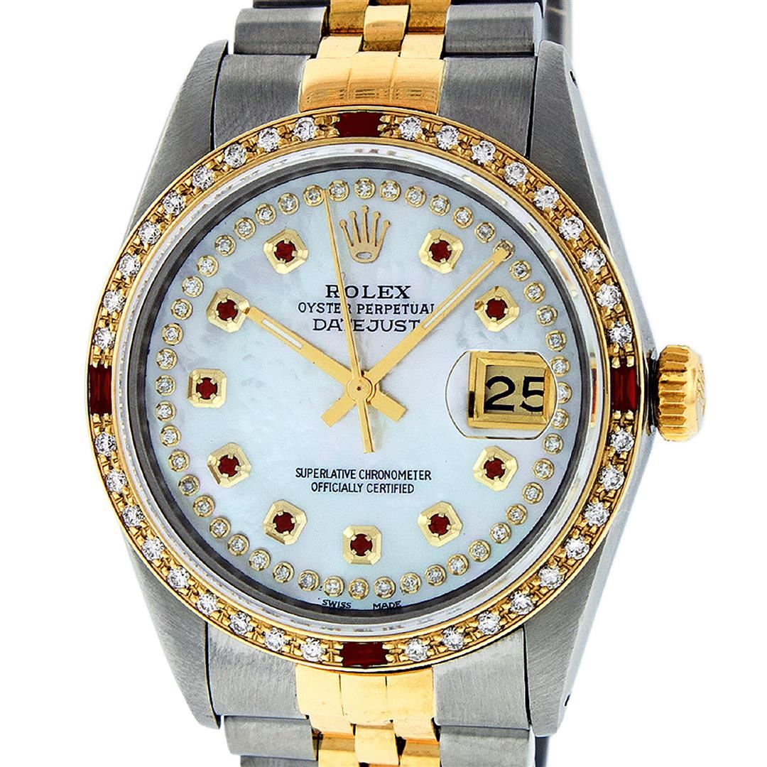 One Mens Pre Owned Yellow Gold Two Tone Rolex Datejust Polished, Serviced & Electronically Tested, Rolex Yellow Gold & Stainless Steel Case: 36mm, Yellow Gold Crown, Custom Bezel: New 18K Yellow Gold Ruby Bead set Diamond Bezel, Diamond Count: 36 Diamonds + 4 Rubies, Clarity: SI-VS, Color: G to H. Custom Crystal: New Sapphire With Date Window. Custom Hands: New Luminescent Hands. Rolex Movement: Automatic Winding Movement. Custom Dial: Mother Of Pearl Ruby String Diamond Dial, Diamond + Gem Count: 10 Rubies + 48 Diamonds in Dial, G To H In Color, SI-VS Clarity. Date Window: 3 O'clock Position Date Display, Quickset, Model: Datejust. Condition: G-6 Extra Fine. Rolex Bracelet: Two Tone Yellow Gold & Stainless Steel Jubilee. Bright Polish. 7.0 Inch Length, Adjustable. Standard Clasp, With Rolex Logo. This Watch Has Been Serviced Time Tested And Is In Excellent Condition It Is Free Of All Scratches And Dents.