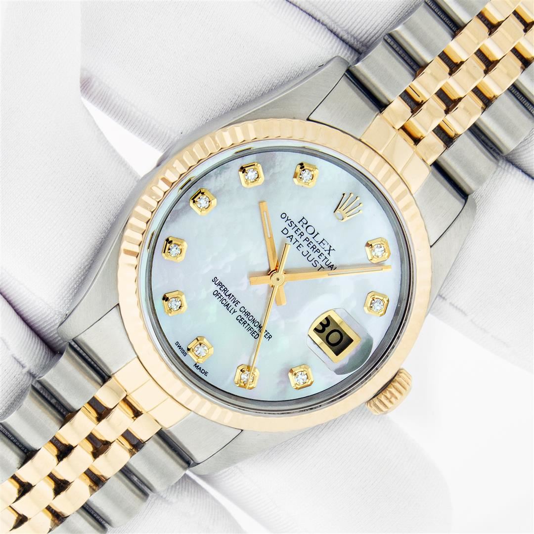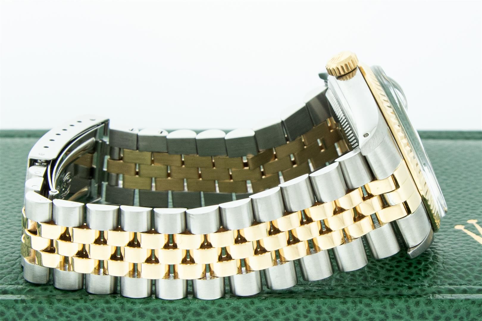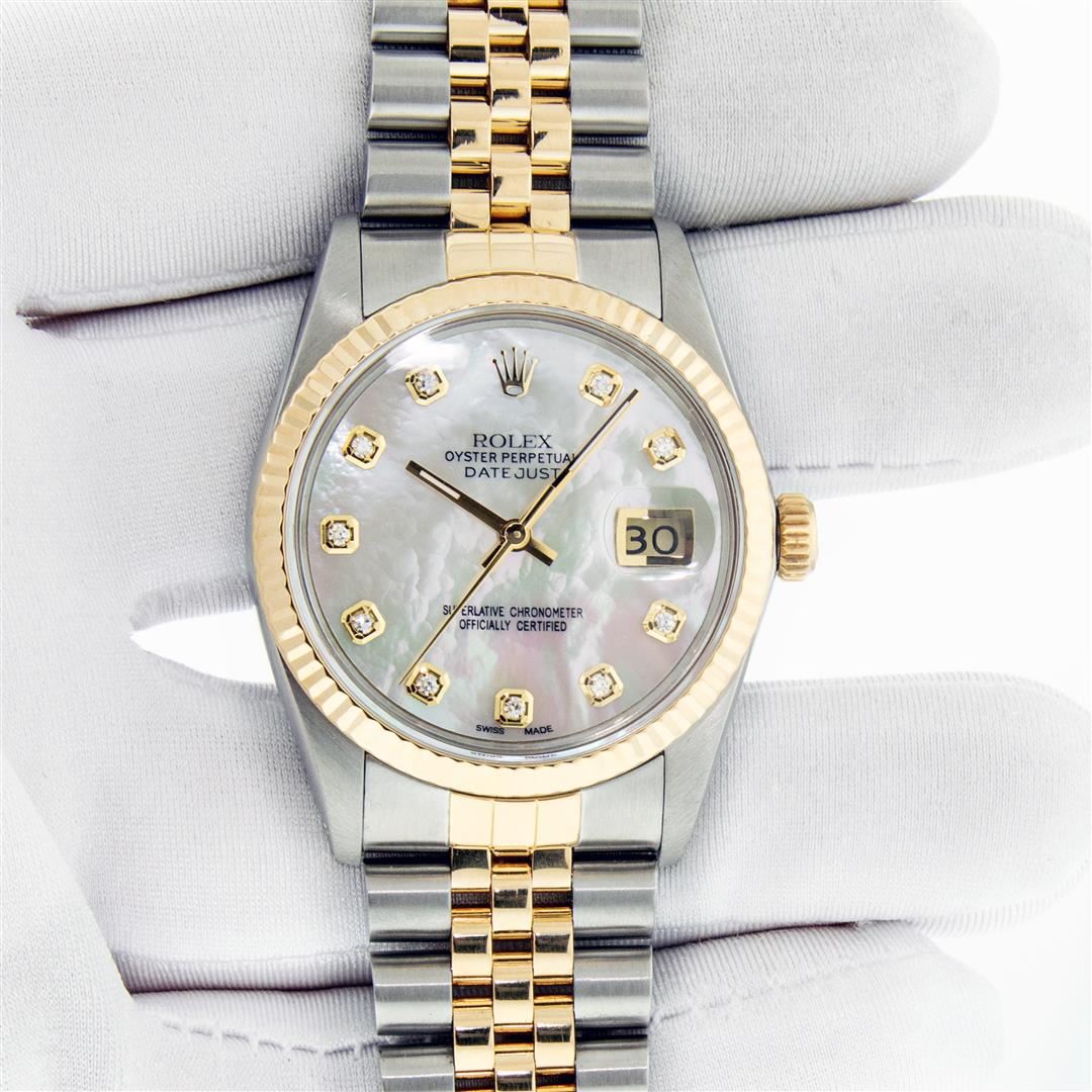 One Mens Pre Owned Yellow Gold Two Tone Rolex Datejust Polished, Serviced & Electronically Tested, Rolex Yellow Gold & Stainless Steel Case: 36mm, Rolex Yellow Gold Crown, Rolex Bezel: 18K Yellow Gold Fluted Bezel. Custom Crystal: New Acrylic Cyclops Lens. Custom Hands: New Hands. Rolex Movement: Automatic Winding Movement. Custom Dial: Dial Refinished To Mother Of Pearl Dial With Custom Added Diamond Hour Markers, Diamond Count: 10 Diamonds in Dial G To H In Color, VS Clarity. Date Window: 3 O'Clock Position Date Display, Quickset, Model: Condition: G-6 Extra Fine. Rolex Bracelet: Two Tone Yellow Gold & Stainless Steel Jubilee Band. Bright Polish. 7.0 Inch Length, Adjustable. Standard Clasp, With Rolex Logo. Watch Has Been Serviced And Polished It Is Free Of All Scratches And Dents. This Watch Has Been Serviced Time Tested And Is In Excellent Condition It Is Free Of All Scratches And Dents. This Watch Comes With A Rolex Box.
