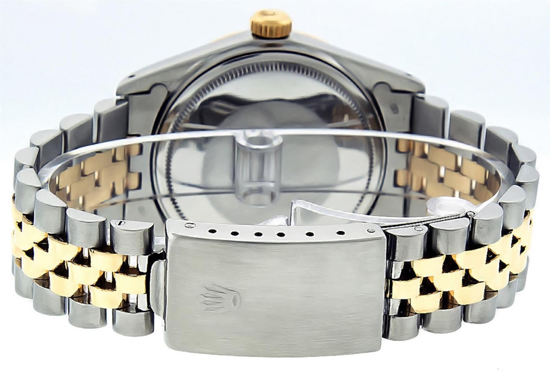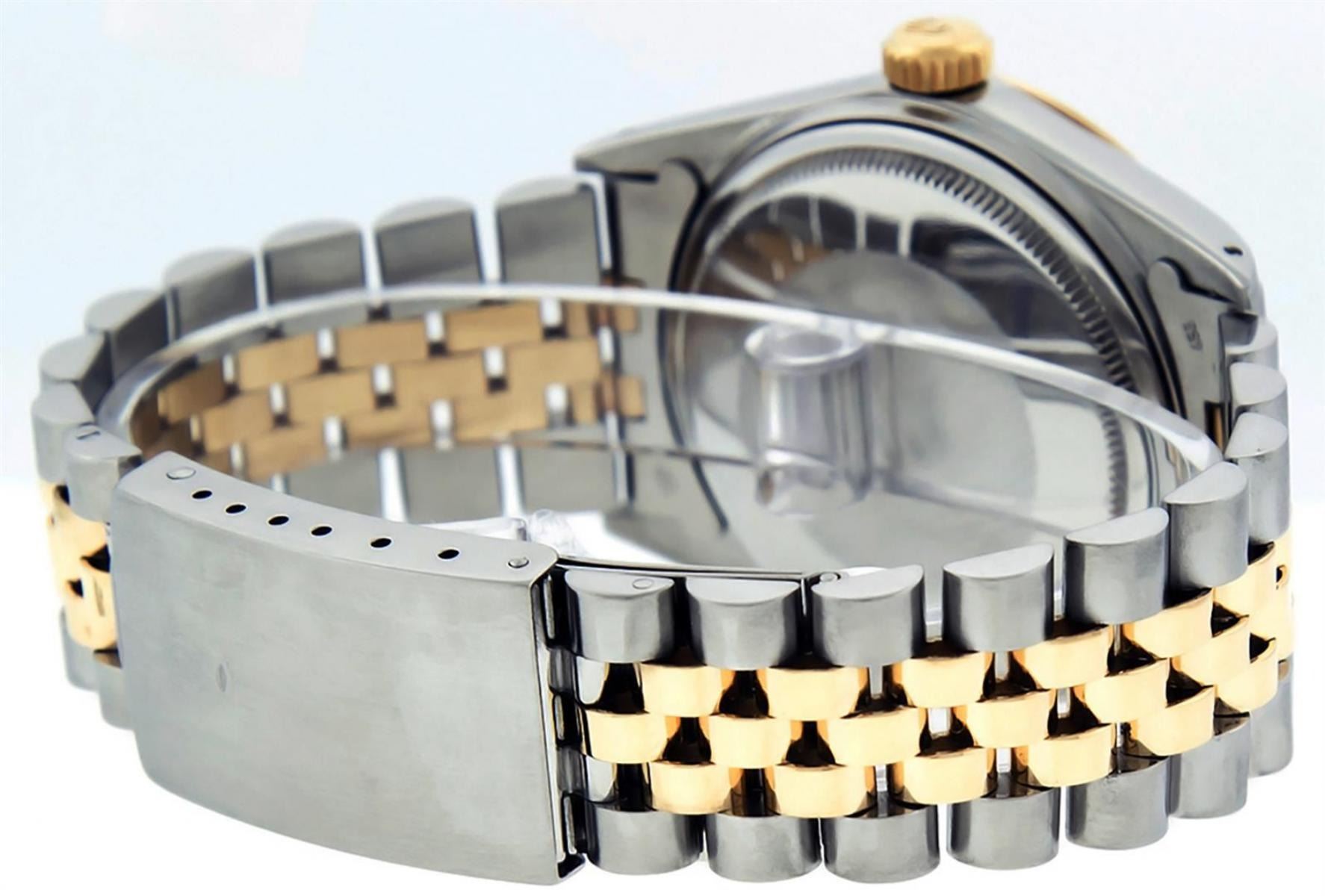 One Mens Yellow Gold Two Tone Rolex Datejust Polished, Serviced & Electronically Tested, Yellow Gold & Stainless Steel Case: 36mm, Yellow Gold Crown, Bezel: Yellow Gold Fluted Bezel. Custom Crystal: New Acrylic Cyclops Lens. Custom Hands: New Luminecent Hands. Movement: Automatic Winding Movement. Dial: Champagne Tapestry Index Dial With Roman Square Track. Date Window: 3 O'Clock Position Date Display, Quickset, Model: Datejust. Condition: G-6 Extra Fine. Bracelet: Two Tone Yellow Gold & Stainless Steel Jubilee. Bright Polish. 7.0 Inch Length, Adjustable. Standard Clasp, With Rolex Logo. This Watch Has Been Serviced Time Tested And Is In Excellent Condition It Is Free Of All Scratches And Dents.