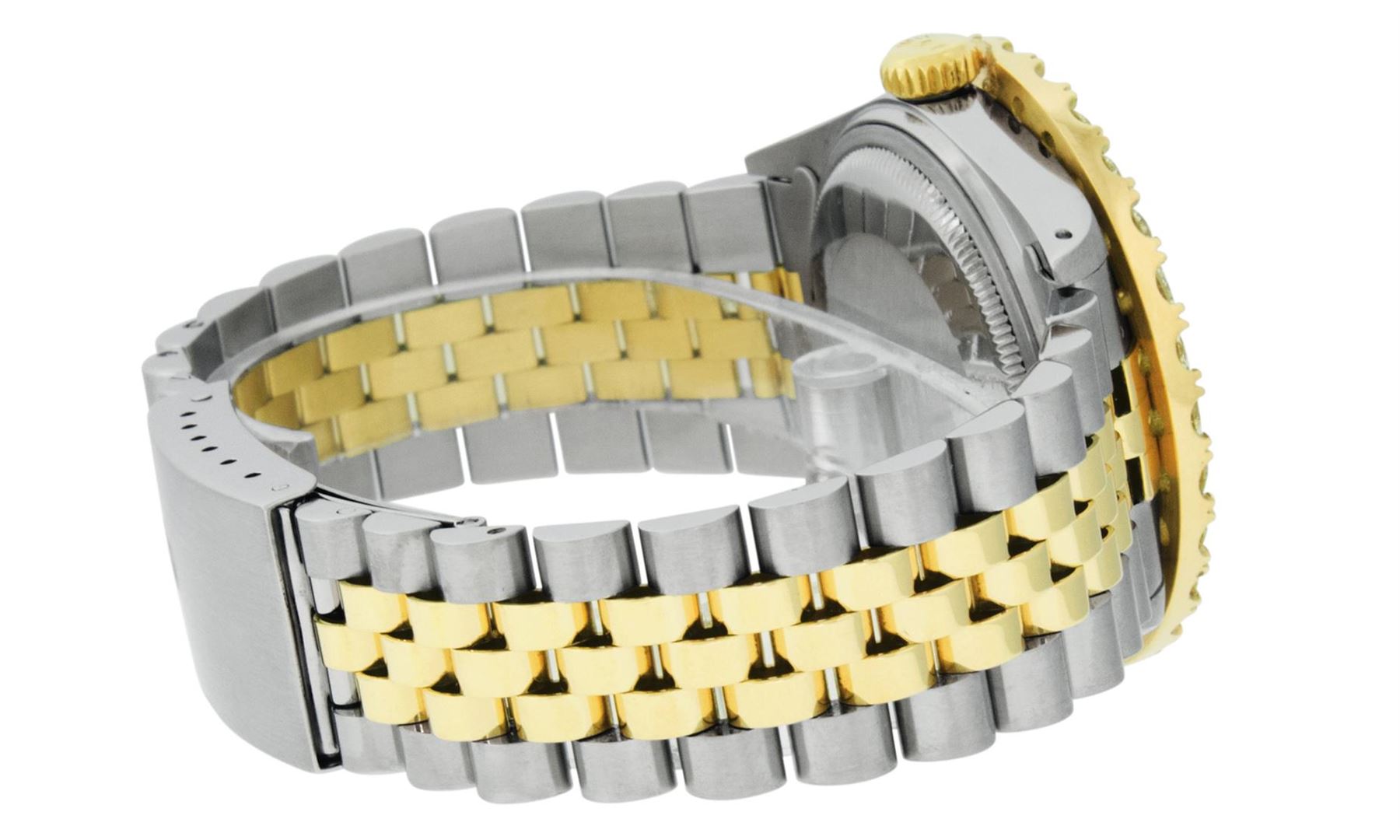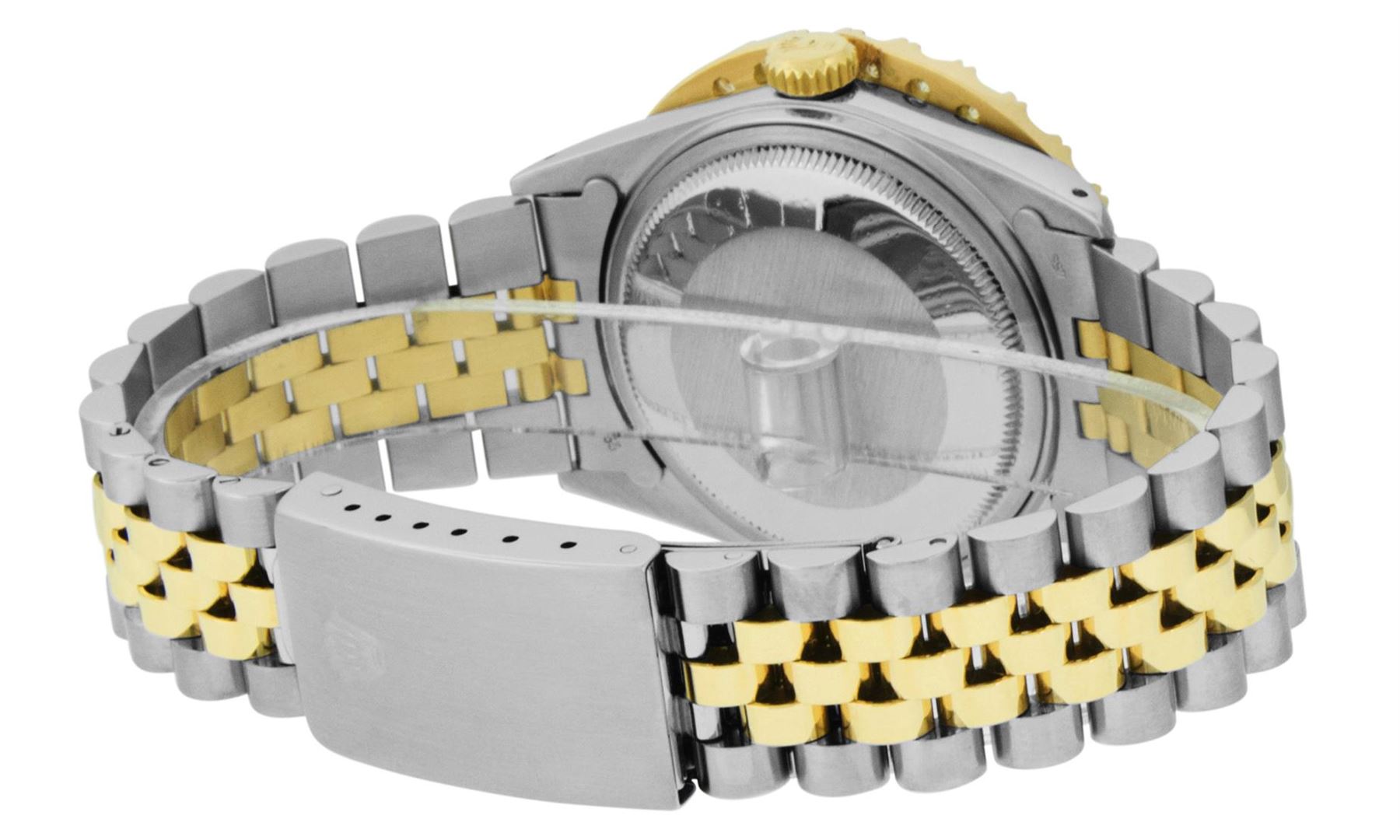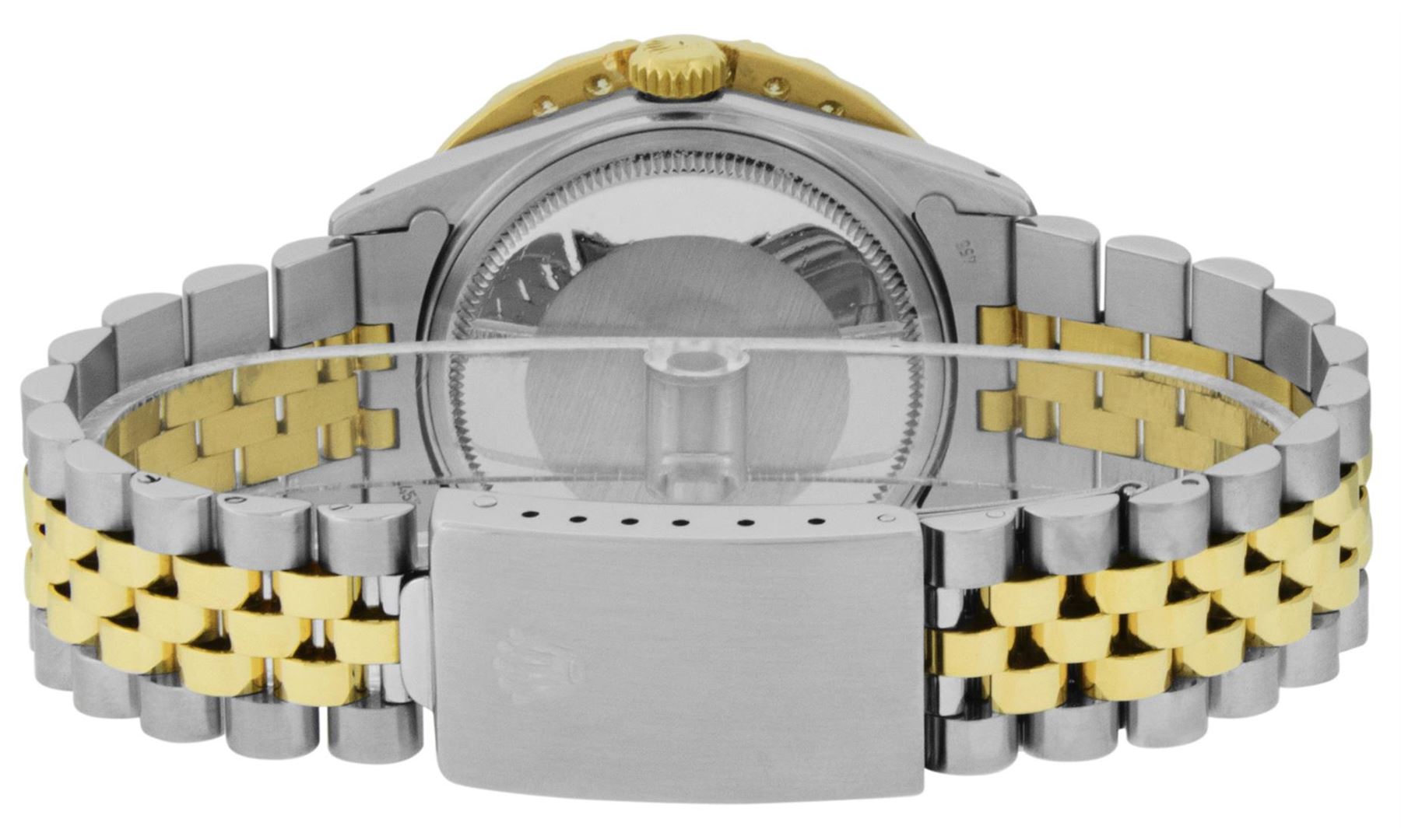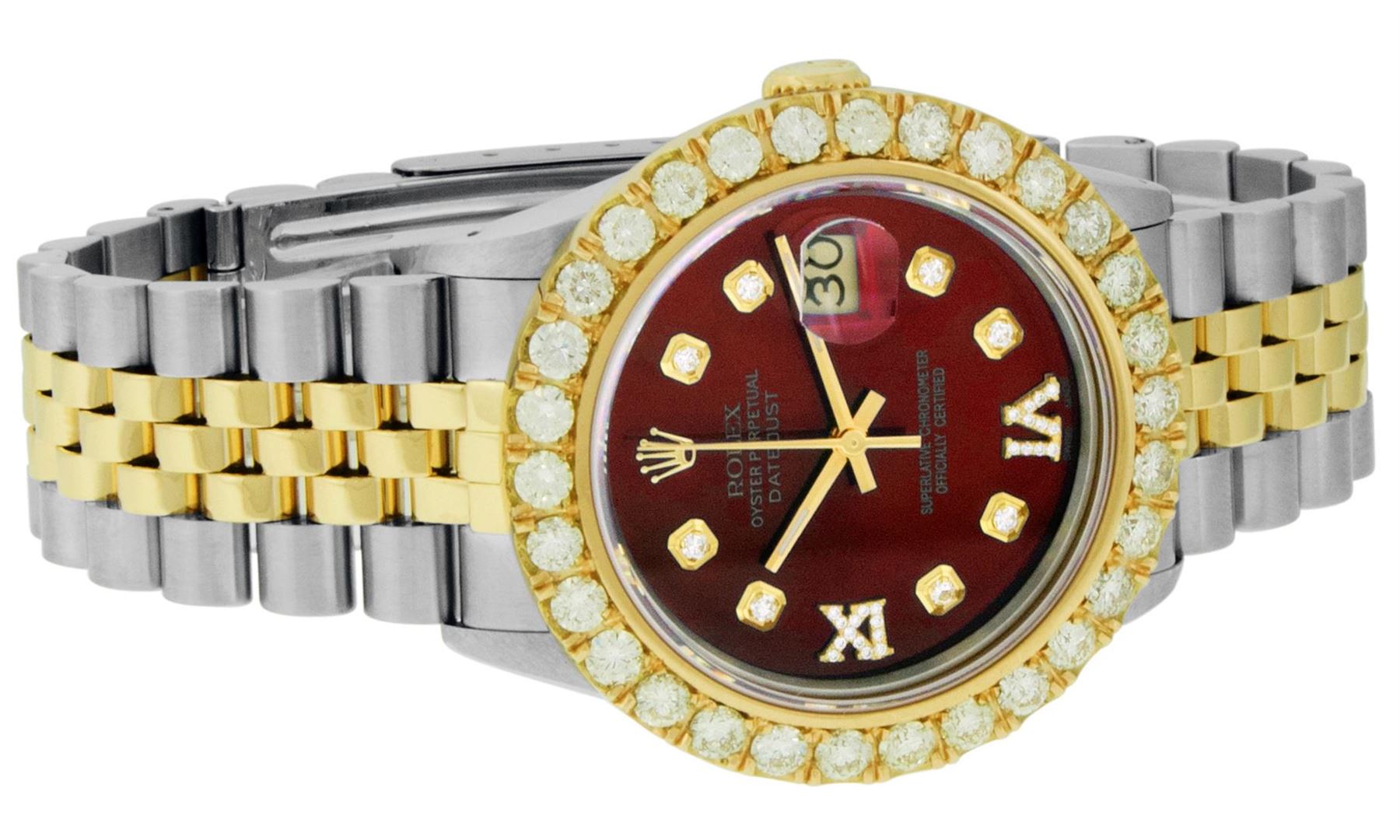 One Mens Pre Owned Yellow Gold Rolex Datejust Polished Bright with Satin Finish, Serviced & Electronically Tested, Stainless Steel Case: 36mm, Yellow Gold Crown, Custom Bezel: New 18K Yellow Gold 4ct Bead set Diamond Bezel, Diamond Count: 30 Diamonds, Total Bezel Weight 4.00 Carat, Clarity: SI-VS, Color: G to H. Custom Crystal: New Sapphire With Date Window. Custom Hands: New Luminescent Hands. Rolex Movement: Automatic Winding Movement. Custom Dial: Red With Custom Added Diamonds, Diamond Count: 8 Diamonds + 2 Roman Diamonds On Dial, Color: G to H, Clarity: VS. Date Window: 3 O'clock Position Date Display, Quickset, Model: Datejust. Condition: G-6 Extra Fine. Rolex Bracelet: Yellow Gold And Stainless Steel Jubilee Band. Bright Polish & Satin Finish. 7.0 Inch Length, Adjustable. Standard Clasp, With Rolex Logo. This Watch Has Been Serviced And Polished It Is Free Of All Scratches And Dents.