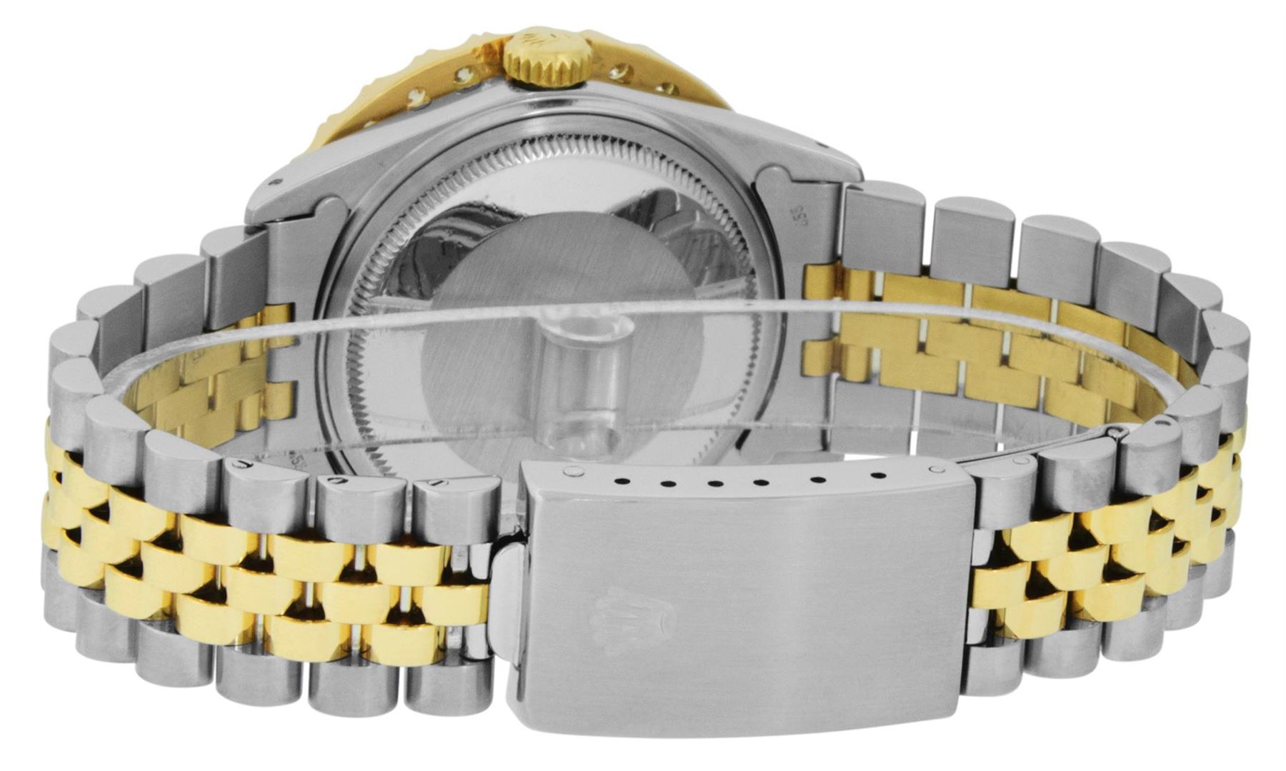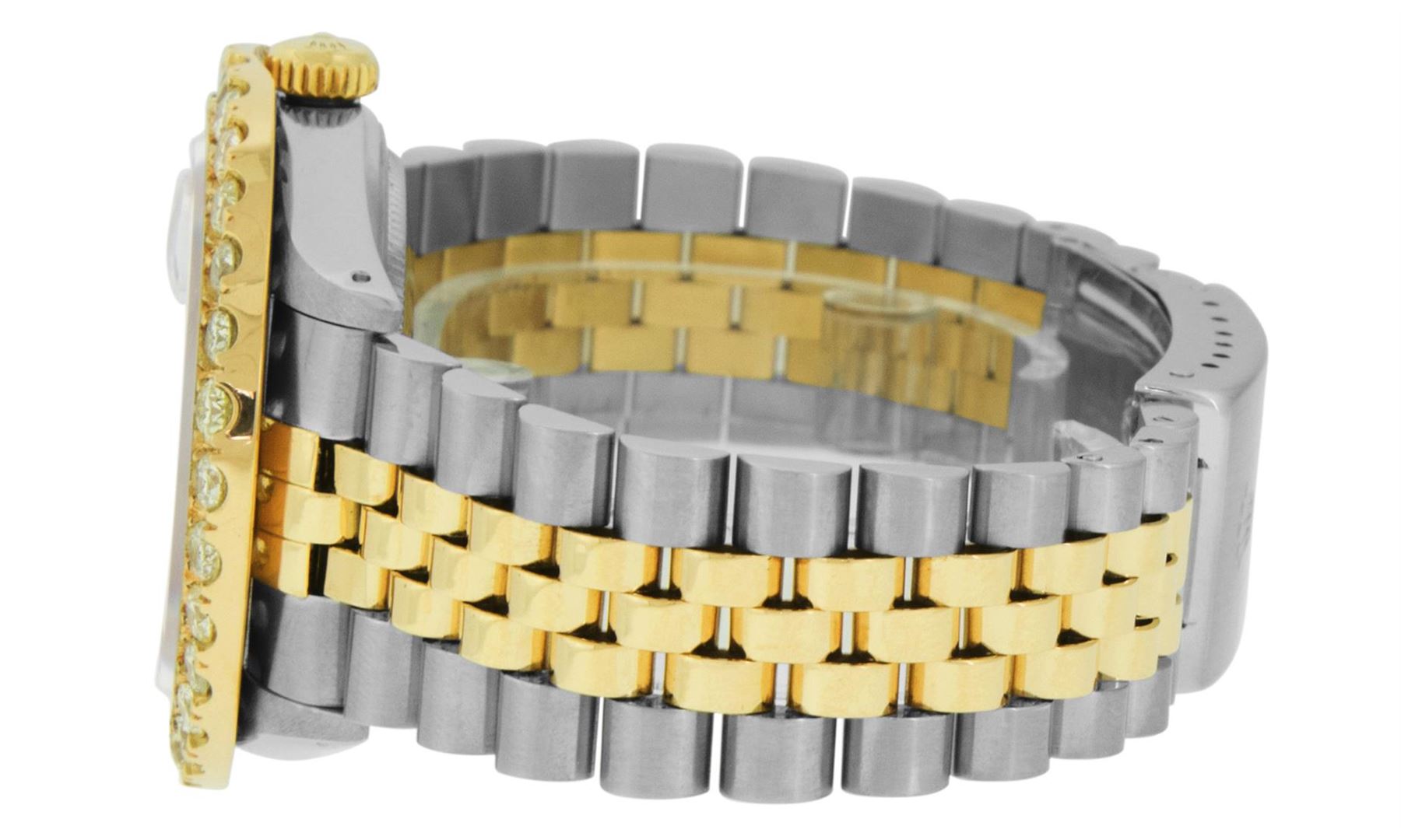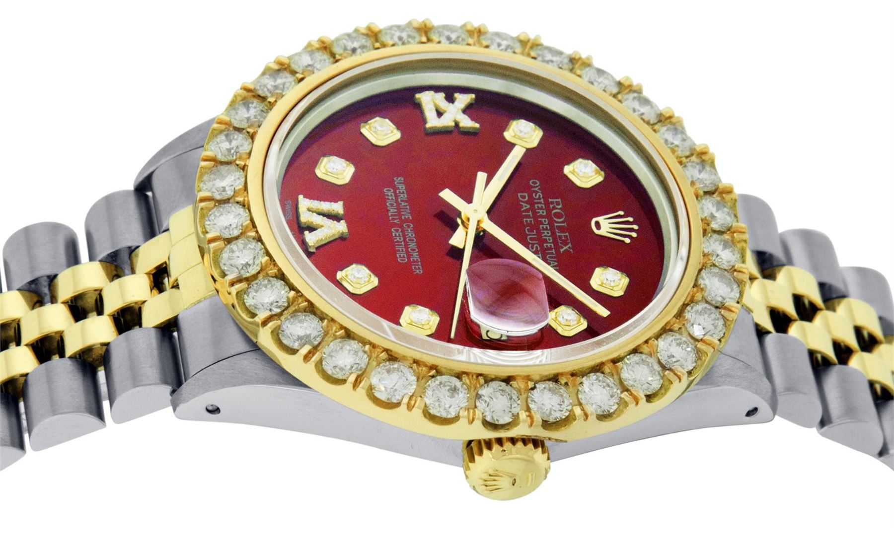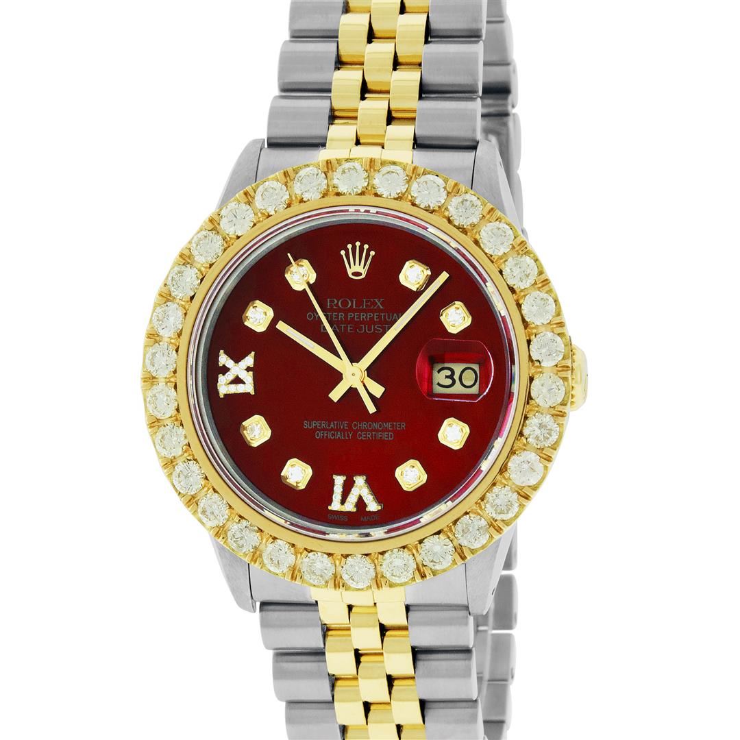 One Mens 14K Yellow Gold Rolex Datejust Polished Bright with Satin Finish, Serviced & Electronically Tested, Stainless Steel Case: 36mm, Yellow Gold Crown, Custom Bezel: New 18K Yellow Gold 4ct beadset Diamond Bezel, Diamond Count: 30 Diamonds, Total Bezel Weight 4.00 Carat, Clarity: SI-VS, Color: G to H. Custom Crystal: New Synthetic Sapphire Cyclops Lens. Custom Hands: New Luminecent Hands. Movement: Automatic Winding Movement Caliber 3035. Custom Dial: Red Diamond Dial, Diamond Count: 8 Diamonds + 2 Roman Diamonds On Dial, Color: G to H, Clarity: VS. Date Window: 3 O'Clock Position Date Display, Quickset, Model: Datejust. Condition: G-6 Extra Fine. Bracelet: 14K Yellow Gold And Stainless Steel Jubilee Band. Bright Polish & Satin Finish. 7.0 Inch Length, Adjustable. Standard Clasp, With Rolex Logo. This Watch Has Been Serviced And Polished It Is Free Of All Scratches And Dents. This Watch Comes With A Rolex Box.