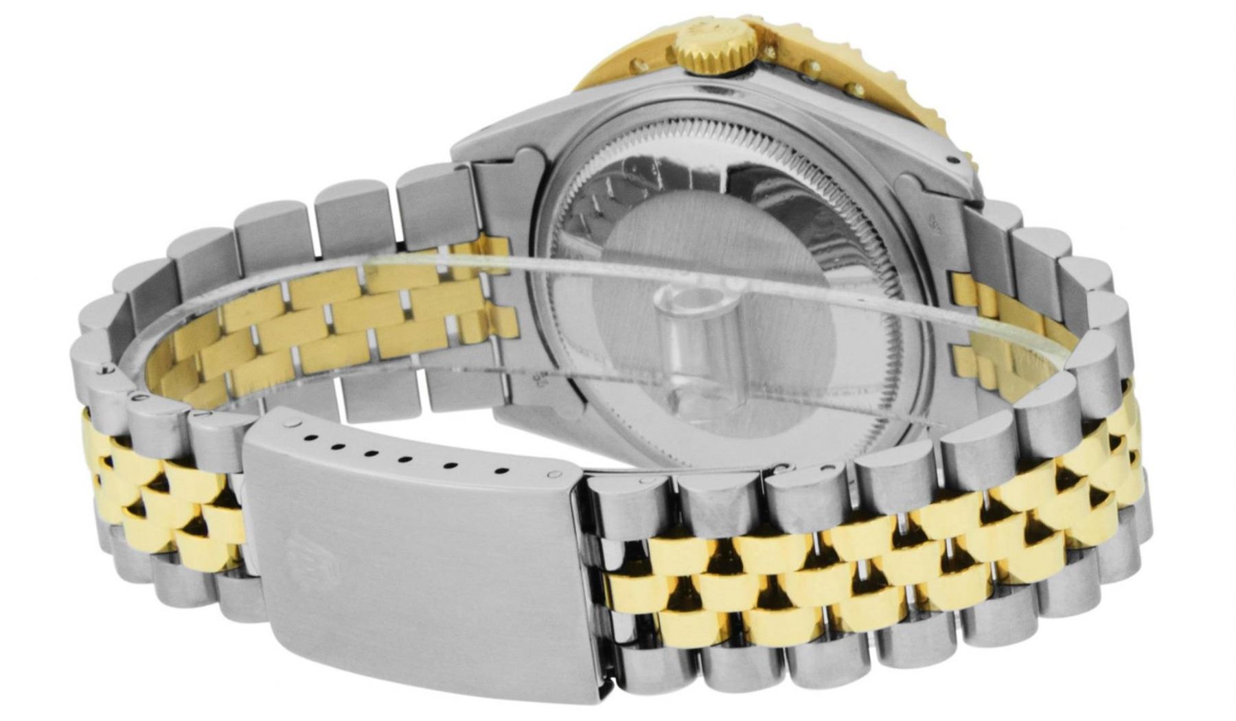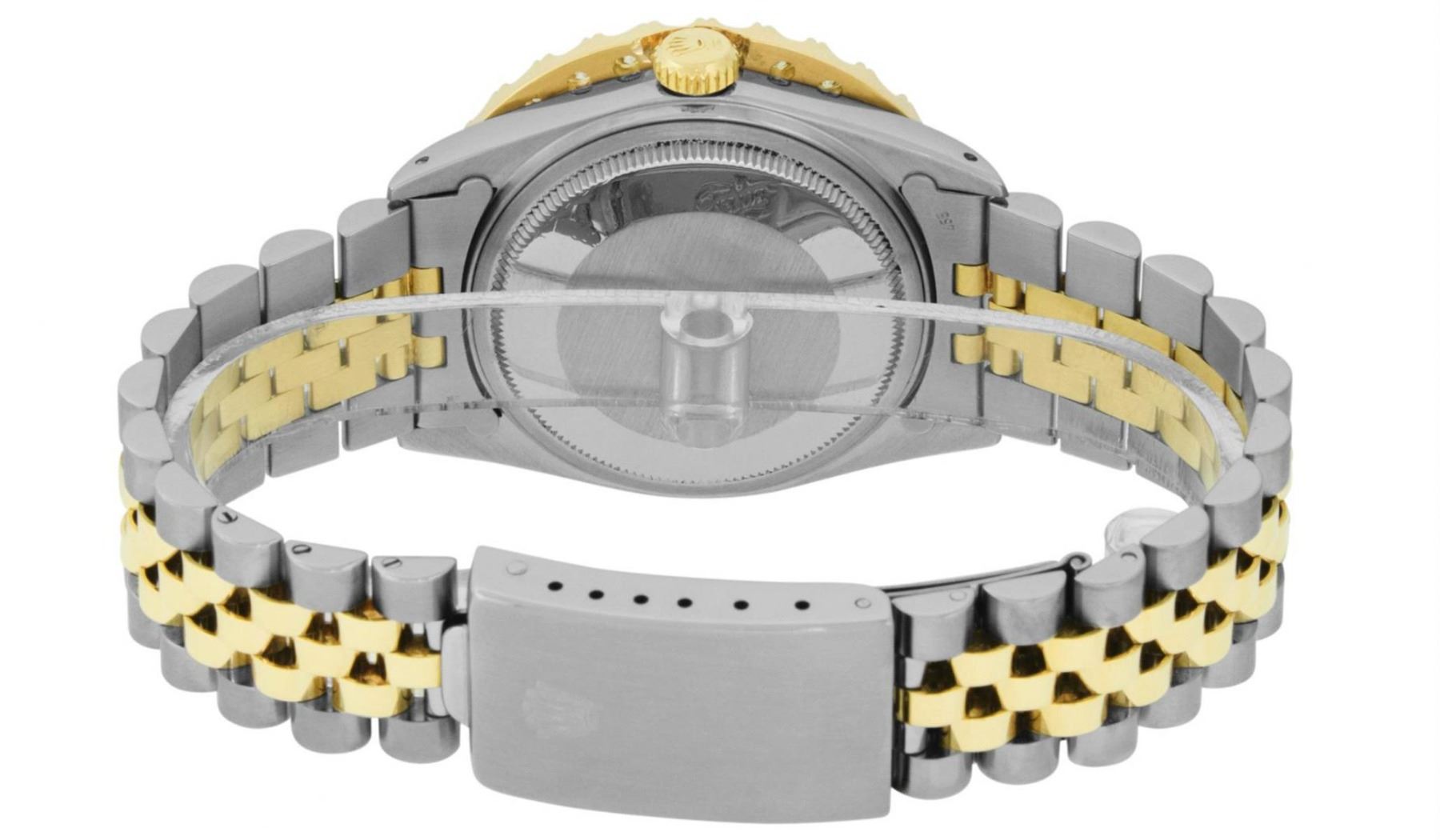 One Mens Yellow Gold Rolex Datejust Polished Bright with Satin Finish, Serviced & Electronically Tested, Stainless Steel Case: 36mm, Yellow Gold Crown, Custom Bezel: New 18K Yellow Gold 4ct Beadset Diamond Bezel, Diamond Count: 30 Diamonds, Total Bezel Weight 4.00 Carat, Clarity: SI-VS, Color: G to H. Custom Crystal: New Scratch Resistant Synthetic Sapphire Cyclops Lens. Custom Hands: New Luminecent Hands. Movement: Automatic Winding Movement. Custom Dial: Red Diamond Dial, Diamond Count: 8 Diamonds + 2 Roman Diamonds On Dial, Color: G to H, Clarity: VS. Date Window: 3 O'Clock Position Date Display, Quickset, Model: Datejust. Condition: G-6 Extra Fine. Bracelet: Yellow Gold And Stainless Steel Jubilee Band. Bright Polish & Satin Finish. 7.0 Inch Length, Adjustable. Standard Clasp, With Rolex Logo. This Watch Has Been Serviced And Polished It Is Free Of All Scratches And Dents. This Watch Comes With A Rolex Box.