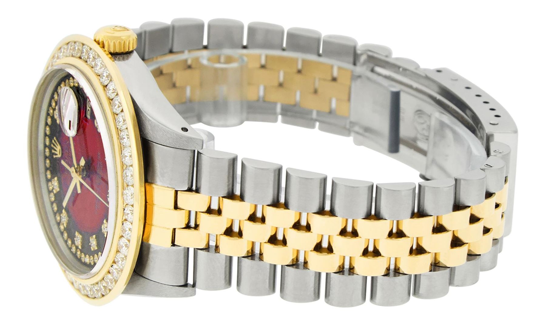 One Mens 14K Yellow Gold Rolex Datejust Polished Bright with Satin Finish, Serviced & Electronically Tested, Stainless Steel Case: 36mm, Yellow Gold Crown, Custom Bezel: New 18K Yellow Gold 3ct Channel Set Diamond Bezel, Diamond Count: 40 Diamonds, Total Weight 3.00 Carat, Clarity: SI-VS, Color: G to H. Custom Crystal: New Scratch Resistent Synthetic Sapphire Cyclops Lens. Custom Hands: New Luminecent Hands. Movement: Automatic Winding Movement Caliber 3035. Custom Dial: Red Vignette String Diamond Dial With Single Cut Diamonds, Diamond Count: 58 Diamonds In Dial, Color: G to H, Clarity: VS. Date Window: 3 O'Clock Position Date Display, Quickset, Model: 16013 Datejust. Condition: G-6 Extra Fine. Bracelet: 14K Yellow Gold And Stainless Steel Jubilee Band. Bright Polish & Satin Finish. 7.0 Inch Length, Adjustable. Standard Clasp, With Rolex Logo. This Watch Has Been Serviced And Polished It Is Free Of All Scratches And Dents.