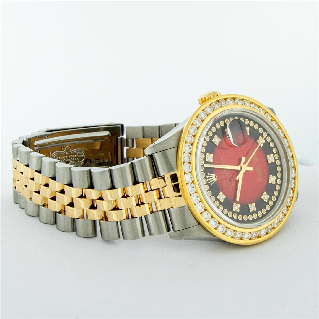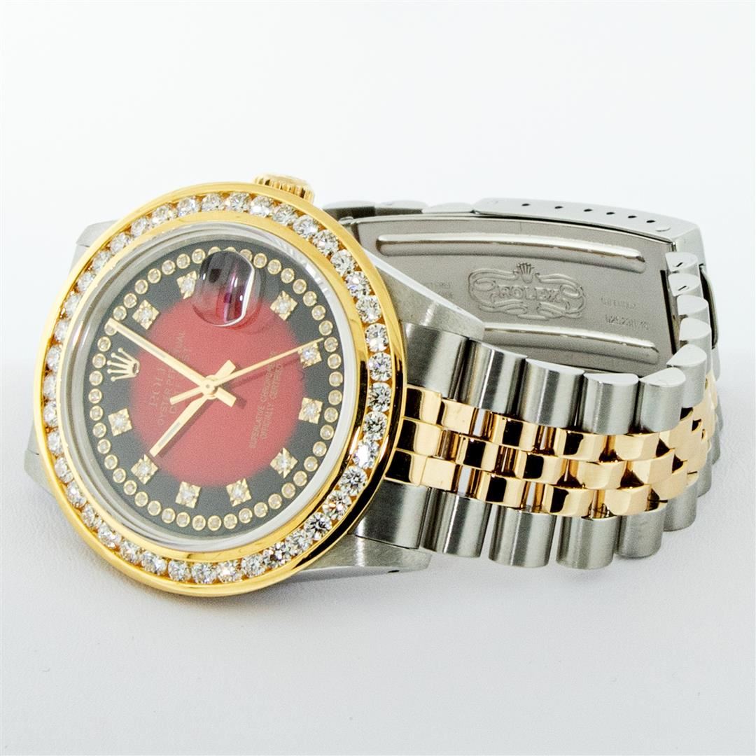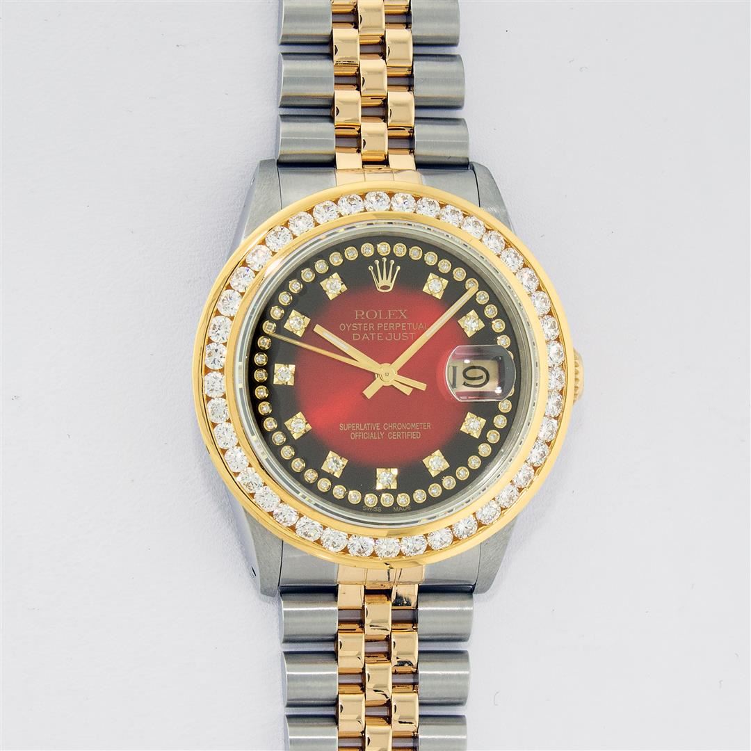 One Mens 14K Yellow Gold Rolex Datejust Polished Bright with Satin Finish, Serviced & Electronically Tested, Stainless Steel Case: 36mm, Yellow Gold Crown, Custom Bezel: New 18K Yellow Gold 3ct Channel Set Diamond Bezel, Diamond Count: 40 Diamonds, Total Weight 3.00 Carat, Clarity: SI-VS, Color: G to H. Custom Crystal: New Scratch Resistent Synthetic Sapphire Cyclops Lens. Custom Hands: New Luminecent Hands. Movement: Automatic Winding Movement Caliber 3035. Custom Dial: Red Vignette String Diamond Dial With Single Cut Diamonds, Diamond Count: 58 Diamonds In Dial, Color: G to H, Clarity: VS. Date Window: 3 O'Clock Position Date Display, Quickset, Model: 16013 Datejust. Condition: G-6 Extra Fine. Bracelet: 14K Yellow Gold And Stainless Steel Jubilee Band. Bright Polish & Satin Finish. 7.0 Inch Length, Adjustable. Standard Clasp, With Rolex Logo. This Watch Has Been Serviced And Polished It Is Free Of All Scratches And Dents. This Watch Comes With A Rolex Box, Appraisal, And Wooden Watch Box.