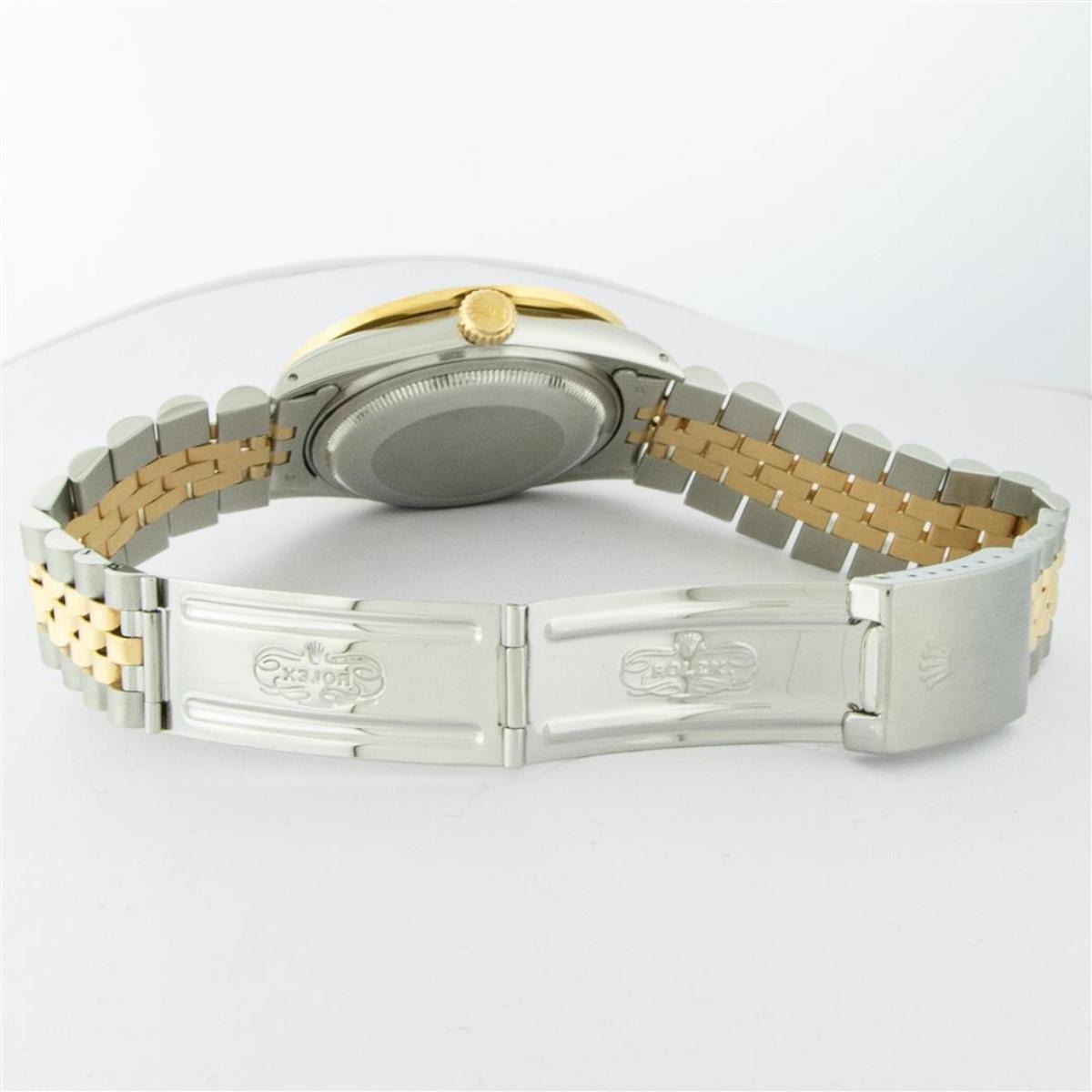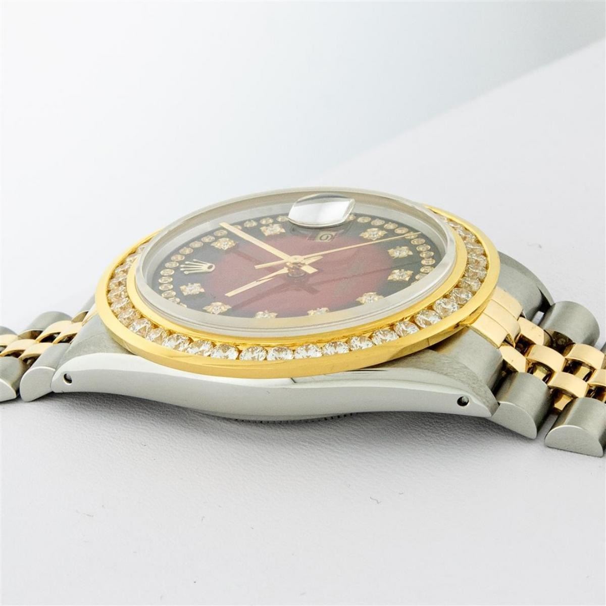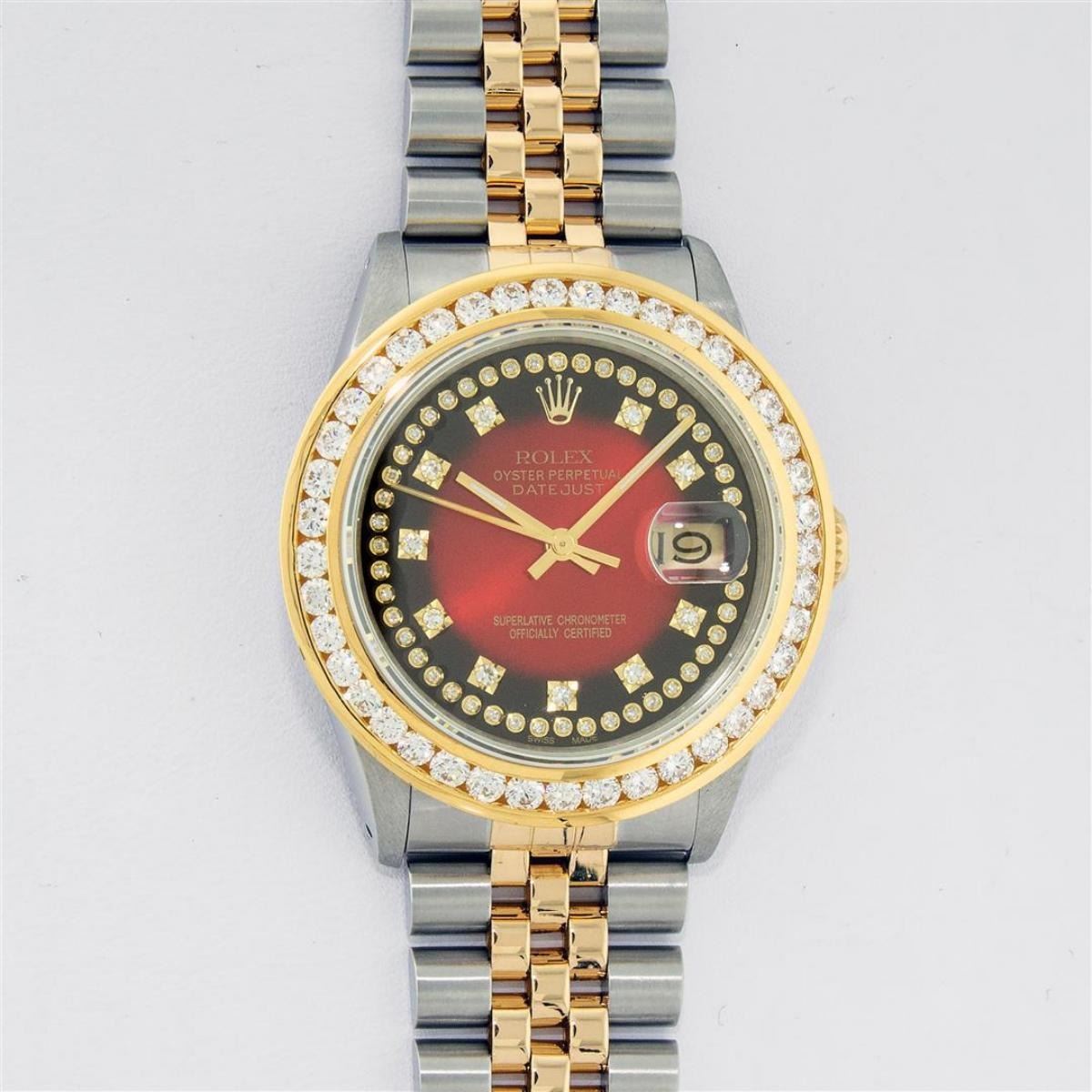 One Mens 14K Yellow Gold Rolex Datejust Polished Bright with Satin Finish, Serviced & Electronically Tested, Stainless Steel Case: 36mm, Yellow Gold Crown, Custom Bezel: New 18K Yellow Gold 3ct Channel Set Diamond Bezel, Diamond Count: 40 Diamonds, Total Weight 3.00 Carat, Clarity: SI-VS, Color: G to H. Custom Crystal: New Scratch Resistent Synthetic Sapphire Cyclops Lens. Custom Hands: New Luminecent Hands. Movement: Automatic Winding Movement Caliber 3035. Custom Dial: Red Vignette String Diamond Dial With Single Cut Diamonds, Diamond Count: 58 Diamonds In Dial, Color: G to H, Clarity: VS. Date Window: 3 O'Clock Position Date Display, Quickset, Model: 16013 Datejust. Condition: G-6 Extra Fine. Bracelet: 14K Yellow Gold And Stainless Steel Jubilee Band. Bright Polish & Satin Finish. 7.0 Inch Length, Adjustable. Standard Clasp, With Rolex Logo. This Watch Has Been Serviced And Polished It Is Free Of All Scratches And Dents. This Watch Comes With A Rolex Box, Appraisal, And Wooden Watch Box.