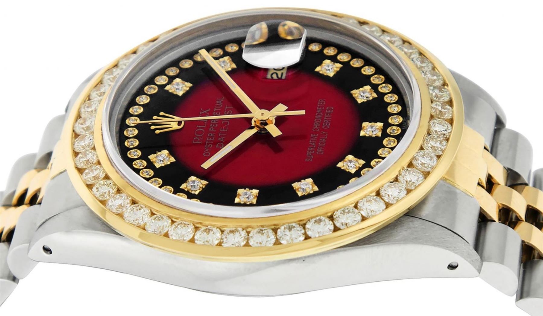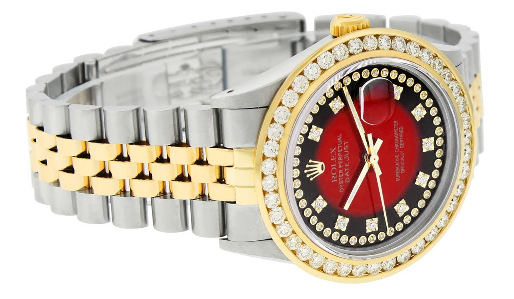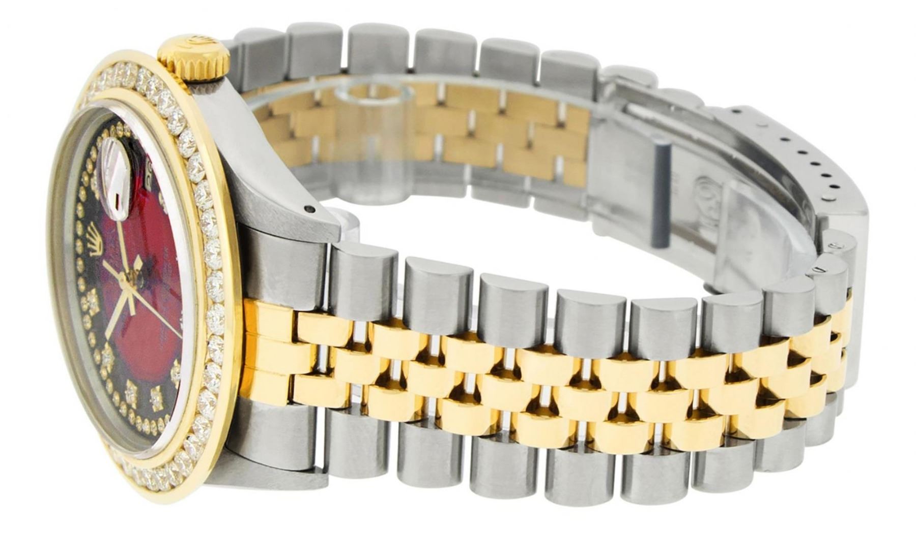 One Mens 14K Yellow Gold Rolex Datejust Polished Bright with Satin Finish, Serviced & Electronically Tested, Stainless Steel Case: 36mm, Yellow Gold Crown, Custom Bezel: New 18K Yellow Gold 3ct Channel Set Diamond Bezel, Diamond Count: 40 Diamonds, Total Weight 3.00 Carat, Clarity: SI-VS, Color: G to H. Custom Crystal: New Scratch Resistent Synthetic Sapphire Cyclops Lens. Custom Hands: New Luminecent Hands. Movement: Automatic Winding Movement Caliber 3035. Custom Dial: Red Vignette String Diamond Dial With Single Cut Diamonds, Diamond Count: 58 Diamonds In Dial, Color: G to H, Clarity: VS. Date Window: 3 O'Clock Position Date Display, Quickset, Model: 16013 Datejust. Condition: G-6 Extra Fine. Bracelet: 14K Yellow Gold And Stainless Steel Jubilee Band. Bright Polish & Satin Finish. 7.0 Inch Length, Adjustable. Standard Clasp, With Rolex Logo. This Watch Has Been Serviced And Polished It Is Free Of All Scratches And Dents.