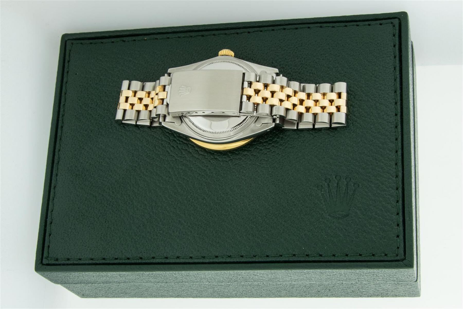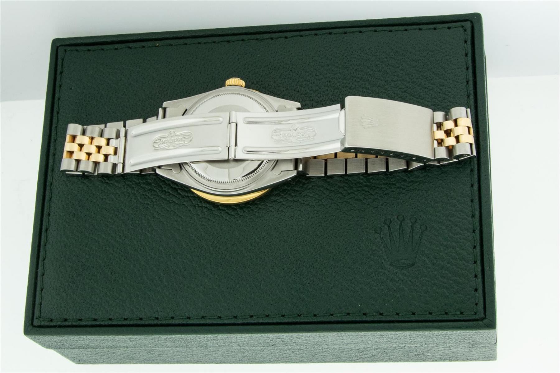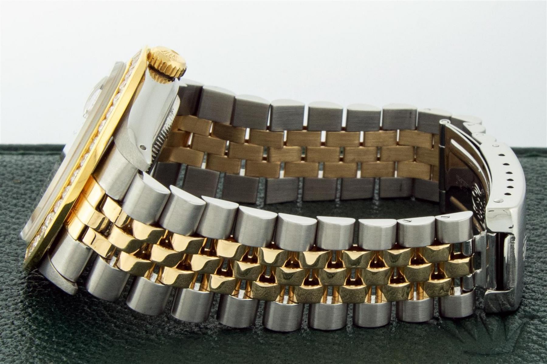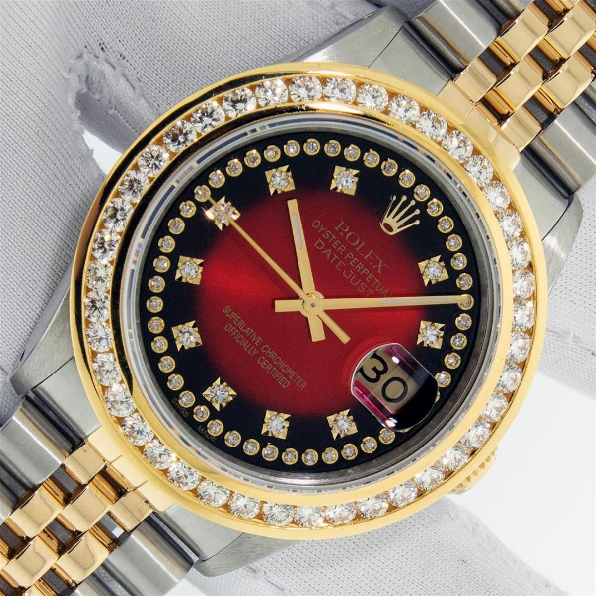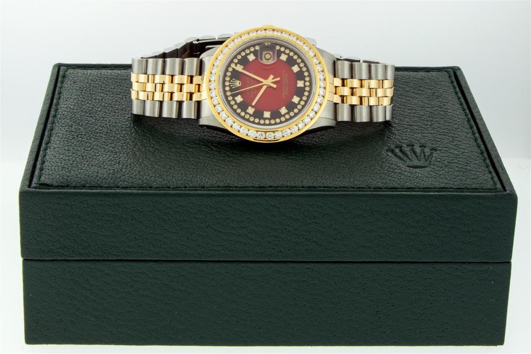 One Mens Yellow Gold Rolex Datejust Polished Bright with Satin Finish, Serviced & Electronically Tested, Stainless Steel Case: 36mm, Yellow Gold Crown, Custom Bezel: New 18K Yellow Gold 3ct Channel Set Diamond Bezel, Diamond Count: 40 Diamonds, Total Weight 3.00 Carat, Clarity: SI-VS, Color: G to H. Custom Crystal: New Scratch Resistent Synthetic Sapphire Cyclops Lens. Custom Hands: New Luminecent Hands. Movement: Automatic Winding Movement. Custom Dial: Red Vignette String Diamond Dial With Single Cut Diamonds, Diamond Count: 58 Diamonds In Dial, Color: G to H, Clarity: VS. Date Window: 3 O'Clock Position Date Display, Quickset, Model: Datejust. Condition: G-6 Extra Fine. Bracelet: Yellow Gold And Stainless Steel Jubilee Band. Bright Polish & Satin Finish. 7.0 Inch Length, Adjustable. Standard Clasp, With Rolex Logo. This Watch Has Been Serviced And Polished It Is Free Of All Scratches And Dents. This Watch Comes With A Rolex Box.