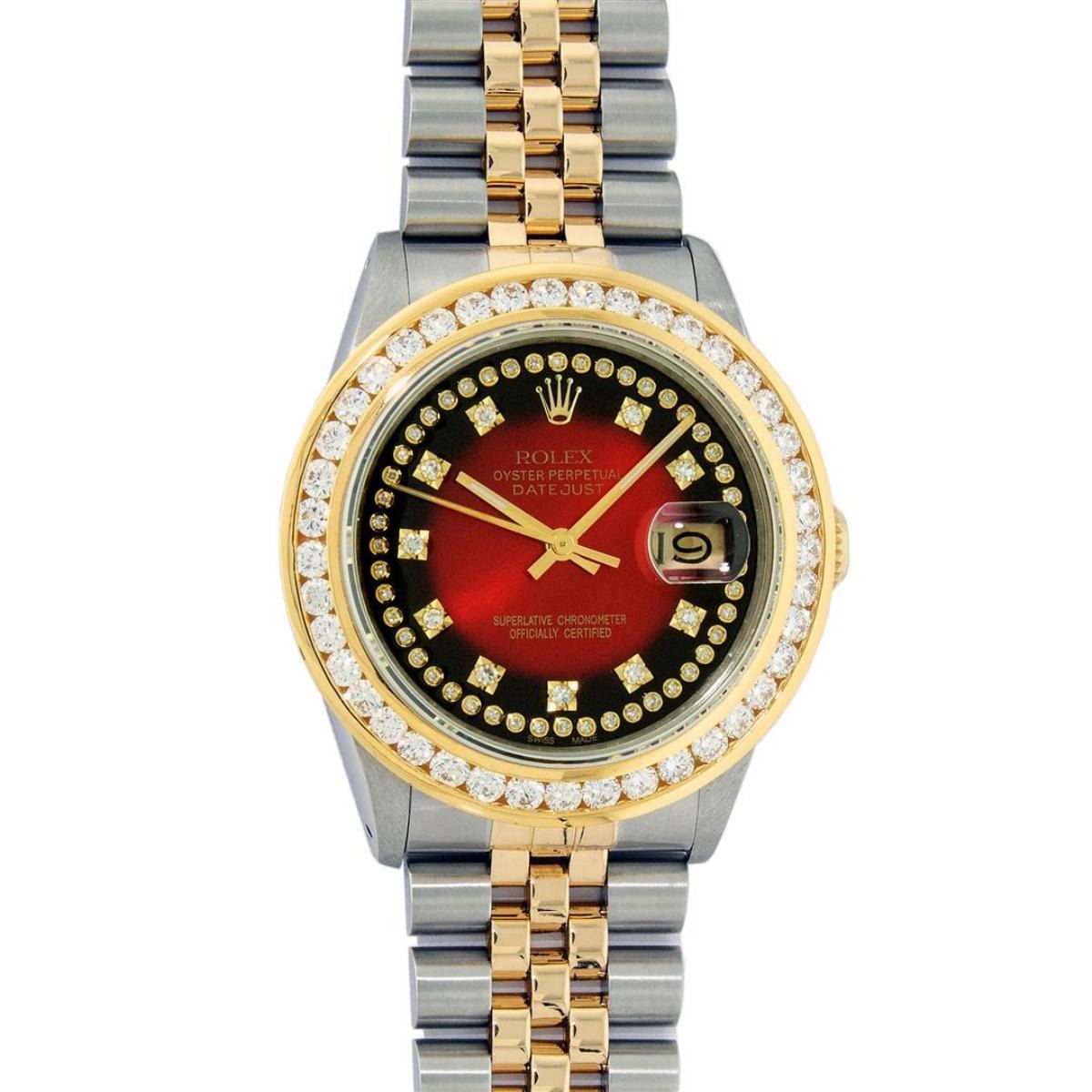 One Mens Yellow Gold Rolex Datejust Polished Bright with Satin Finish, Serviced & Electronically Tested, Stainless Steel Case: 36mm, Yellow Gold Crown, Custom Bezel: New 18K Yellow Gold 3ct Channel Set Diamond Bezel, Diamond Count: 40 Diamonds, Total Weight 3.00 Carat, Clarity: SI-VS, Color: G to H. Custom Crystal: New Scratch Resistent Synthetic Sapphire Cyclops Lens. Custom Hands: New Luminecent Hands. Movement: Automatic Winding Movement. Custom Dial: Red Vignette String Diamond Dial With Single Cut Diamonds, Diamond Count: 58 Diamonds In Dial, Color: G to H, Clarity: VS. Date Window: 3 O'Clock Position Date Display, Quickset, Model: Datejust. Condition: G-6 Extra Fine. Bracelet: Yellow Gold And Stainless Steel Jubilee Band. Bright Polish & Satin Finish. 7.0 Inch Length, Adjustable. Standard Clasp, With Rolex Logo. This Watch Has Been Serviced And Polished It Is Free Of All Scratches And Dents.