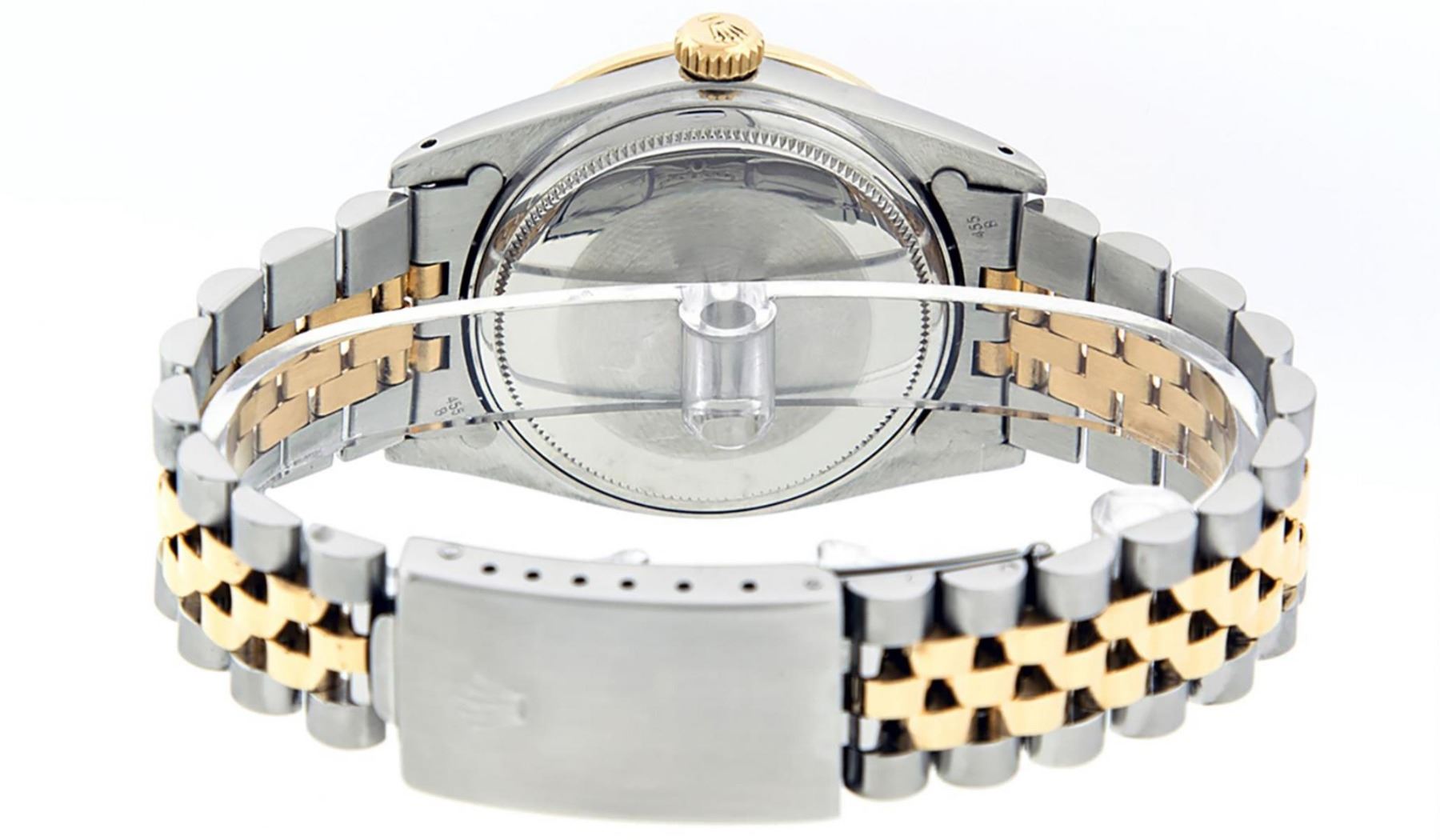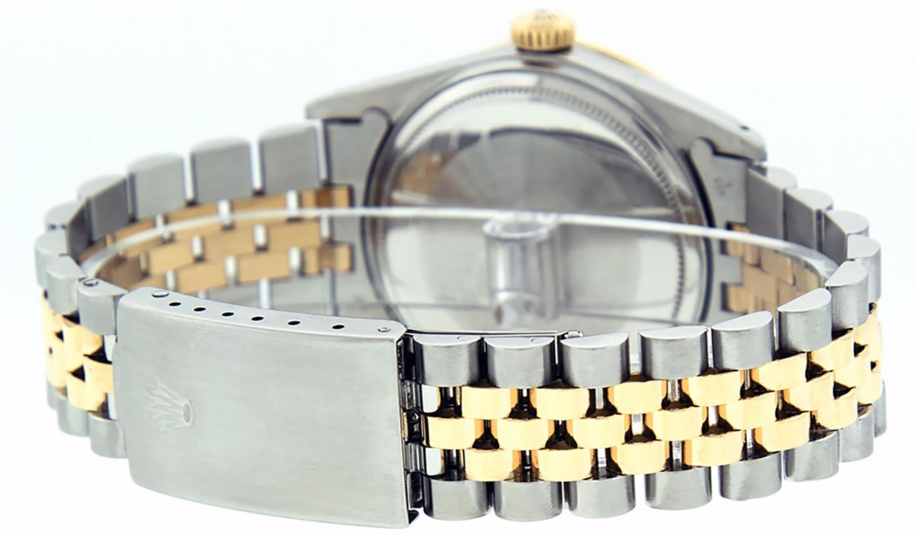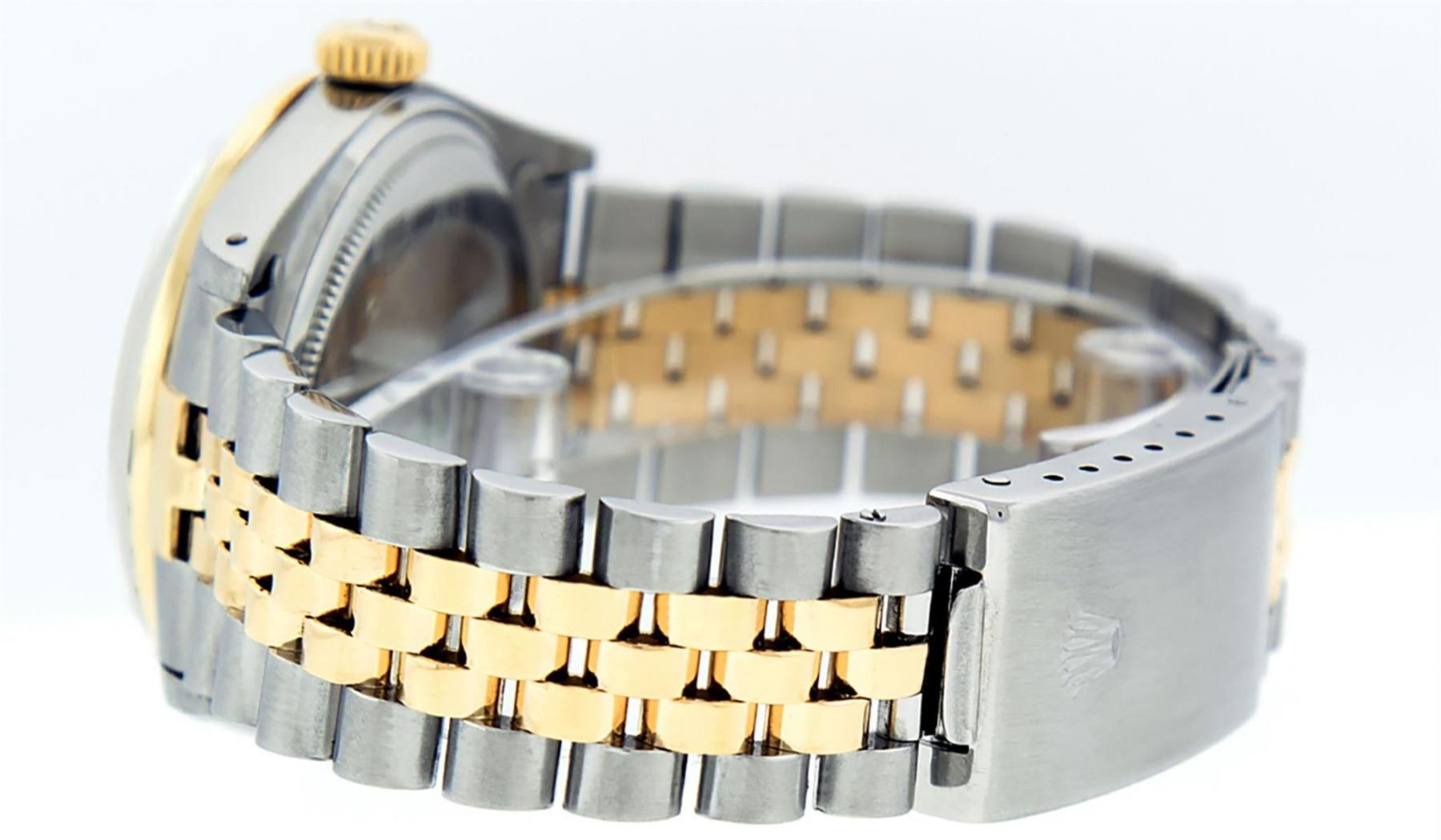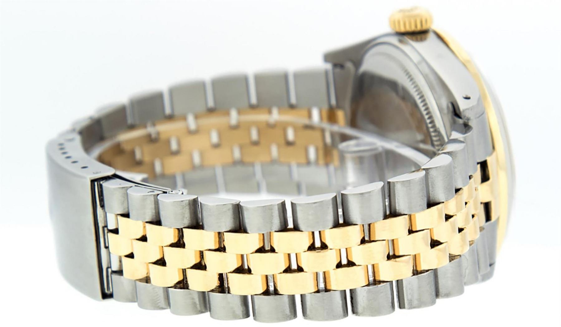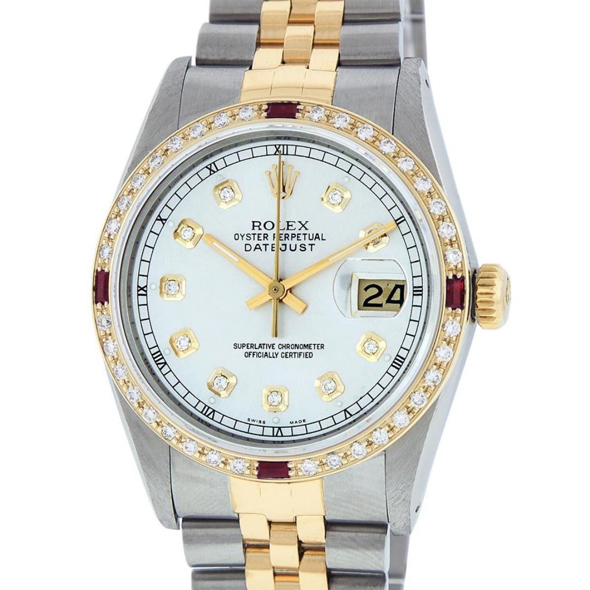 One Mens Pre Owned Yellow Gold Two Tone Rolex Datejust Polished, Fully Serviced & Electronically Tested, Rolex Yellow Gold & Stainless Steel Case: 36mm, Rolex Yellow Gold Crown, Custom Bezel: New 18K Yellow Gold Ruby Beadset Diamond Bezel, Diamond Count: 36 Diamonds + 4 Rubies, Clarity: Si-VS, Color: G to H. Custom Crystal: New Sapphire Magnified Date. Custom Hands: New Luminescent Hands. Rolex Movement: Automatic Winding Movement. Custom Dial: Refinished Silver With Custom Diamonds, Diamond Count: 10 Diamonds In Dial, Color: G to H, Clarity: SI-VS. Date Window: 3 O'Clock Position Date Display, Quickset, Model: Datejust. Condition: G-6 Extra Fine. Rolex Bracelet: Two Tone Yellow Gold & Stainless Steel Jubilee. Bright Polish. 7.0 Inch Length, Adjustable. Standard Clasp, With Rolex Logo. This Watch Has Been Serviced Time Tested And Is In Excellent Condition It Is Free Of All Scratches And Dents.