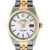 One Mens Pre Owned Yellow Gold Two Tone Rolex Datejust Polished, Serviced & Electronically Tested, Rolex Yellow Gold & Stainless Steel Case: 36mm, Rolex 14K Yellow Gold Crown, Rolex Bezel: Yellow Gold Fluted Bezel. Custom Crystal: New Acrylic Cyclops Lens. Custom Hands: New Luminescent Hands. Rolex Movement: Automatic Winding Movement. Rolex Dial: Silver Index With Index Hour Markers and Small Track With Lumi Dots. Date Window: 3 O'Clock Position Date Display, Quickset, Model: Datejust. Condition: G-6 Extra Fine. Rolex Bracelet: Two Tone Yellow Gold & Stainless Steel Jubilee Band. Bright Polish. 7.0 Inch Length, Adjustable. Standard Clasp, With Rolex Logo. This Watch Has Been Serviced Time Tested And Is In Excellent Condition It Is Free Of All Scratches And Dents.