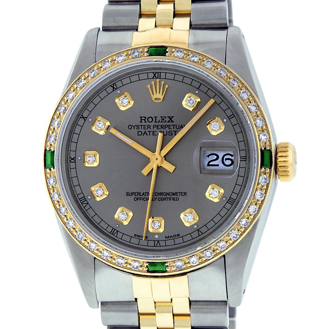One Mens Yellow Gold Two Tone Rolex Datejust Polished, Serviced & Electronically Tested, Yellow Gold & Stainless Steel Case: 36mm, Yellow Gold Crown, Custom Bezel: New 18K Yellow Gold Emerald Beadset Diamond Bezel, Diamond Count: 36 Diamonds + 4 Emeralds, Total Weight 1.00 Carat, Clarity: SI-VS, Color: G to H. Custom Crystal: New Scratch Resistant Synthetic Sapphire Cyclops Lens. Custom Hands: New Luminecent Hands. Movement: Automatic Winding Movement . Custom Dial: Slate Grey Diamond With Square Roman Track & Lumi Dots. Diamond Count: 10 Diamonds In Dial, Clarity: SI-VS, Color: Color G to H Date Window: 3 O'Clock Position Date Display, Quickset, Model: Datejust. Condition: G-6 Extra Fine. Bracelet:Two Tone Yellow Gold & Stainless Steel Jubilee. Bright Polish. 7.0 Inch Length, Adjustable. Standard Clasp, With Rolex Logo. This Watch Has Been Serviced Time Tested And Is In Excellent Condition It Is Free Of All Scratches And Dents.