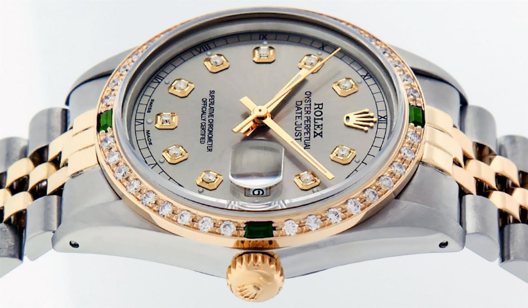 One Mens Yellow Gold Two Tone Rolex Datejust Polished, Serviced & Electronically Tested, Yellow Gold & Stainless Steel Case: 36mm, Yellow Gold Crown, Custom Bezel: New 18K Yellow Gold Emerald Beadset Diamond Bezel, Diamond Count: 36 Diamonds + 4 Emeralds, Total Weight 1.00 Carat, Clarity: SI-VS, Color: G to H. Custom Crystal: New Scratch Resistant Synthetic Sapphire Cyclops Lens. Custom Hands: New Luminecent Hands. Movement: Automatic Winding Movement . Custom Dial: Slate Grey Diamond With Square Roman Track & Lumi Dots. Diamond Count: 10 Diamonds In Dial, Clarity: SI-VS, Color: Color G to H Date Window: 3 O'Clock Position Date Display, Quickset, Model: Datejust. Condition: G-6 Extra Fine. Bracelet:Two Tone Yellow Gold & Stainless Steel Jubilee. Bright Polish. 7.0 Inch Length, Adjustable. Standard Clasp, With Rolex Logo. This Watch Has Been Serviced Time Tested And Is In Excellent Condition It Is Free Of All Scratches And Dents.