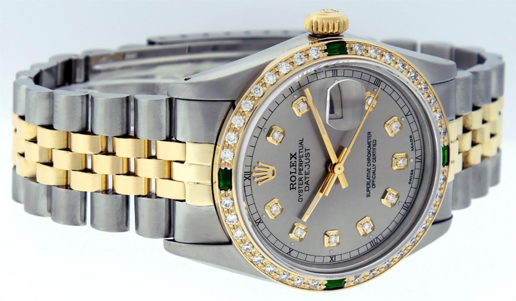 One Mens Yellow Gold Two Tone Rolex Datejust Polished, Serviced & Electronically Tested, Yellow Gold & Stainless Steel Case: 36mm, Yellow Gold Crown, Custom Bezel: New 18K Yellow Gold Emerald Beadset Diamond Bezel, Diamond Count: 36 Diamonds + 4 Emeralds, Total Weight 1.00 Carat, Clarity: SI-VS, Color: G to H. Custom Crystal: New Scratch Resistant Synthetic Sapphire Cyclops Lens. Custom Hands: New Luminecent Hands. Movement: Automatic Winding Movement . Custom Dial: Slate Grey Diamond With Square Roman Track & Lumi Dots. Diamond Count: 10 Diamonds In Dial, Clarity: SI-VS, Color: Color G to H Date Window: 3 O'Clock Position Date Display, Quickset, Model: Datejust. Condition: G-6 Extra Fine. Bracelet:Two Tone Yellow Gold & Stainless Steel Jubilee. Bright Polish. 7.0 Inch Length, Adjustable. Standard Clasp, With Rolex Logo. This Watch Has Been Serviced Time Tested And Is In Excellent Condition It Is Free Of All Scratches And Dents.
