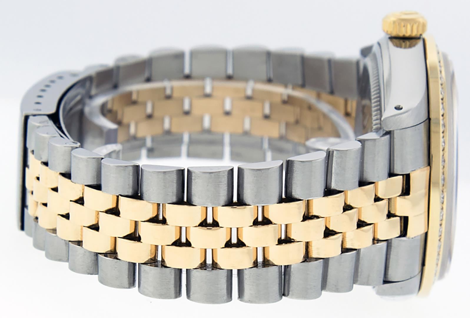 One Mens Pre Owned Yellow Gold And Stainless Steel Two Tone Rolex Datejust Polished, Serviced And Electronically Tested, Rolex Yellow Gold And Stainless Steel Case: 36mm, Yellow Gold Crown, Custom Bezel: New 18K Yellow Gold Beadset Diamond Bezel, Diamond Count: 44 Diamonds. Custom Crystal: New Sapphire With Magnified Date. Rolex Movement: Automatic Winding Movement 3035. Custom Dial: Custom White Dial With Added Diamond Hour Markers, Diamond Count: 8 Diamonds + 2 Baguette Diamond Hour Markers. Date Window: 3 O'Clock Position Date Display, Quickset, Model: Quickset Datejust. Condition: G-6 Extra Fine. Rolex Bracelet: Two Tone Yellow Gold And Stainless Steel Jubilee Band. Bright Polish. 7.0 Inch Length, Adjustable. Standard Clasp, With Rolex Logo. This Watch Has Been Serviced Time Tested And Is In Excellent Condition It Is Free Of All Scratches And Dents.