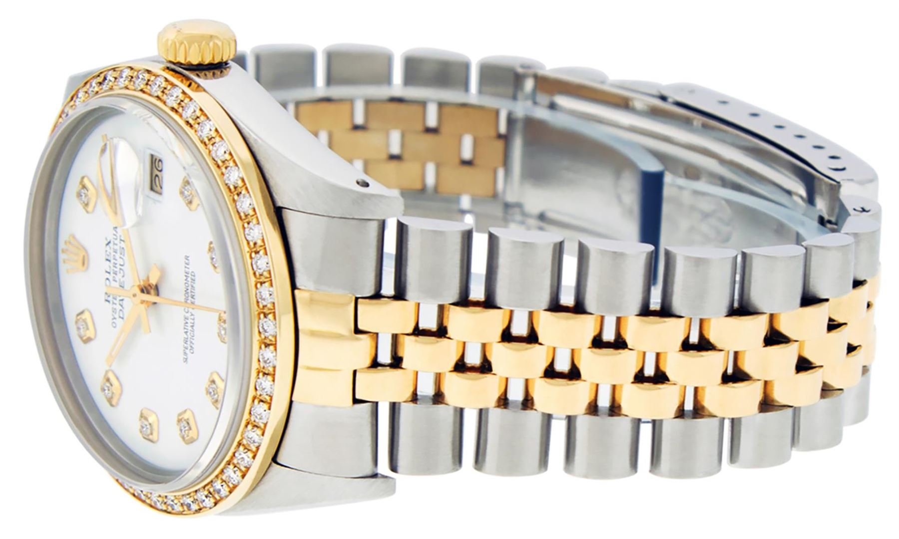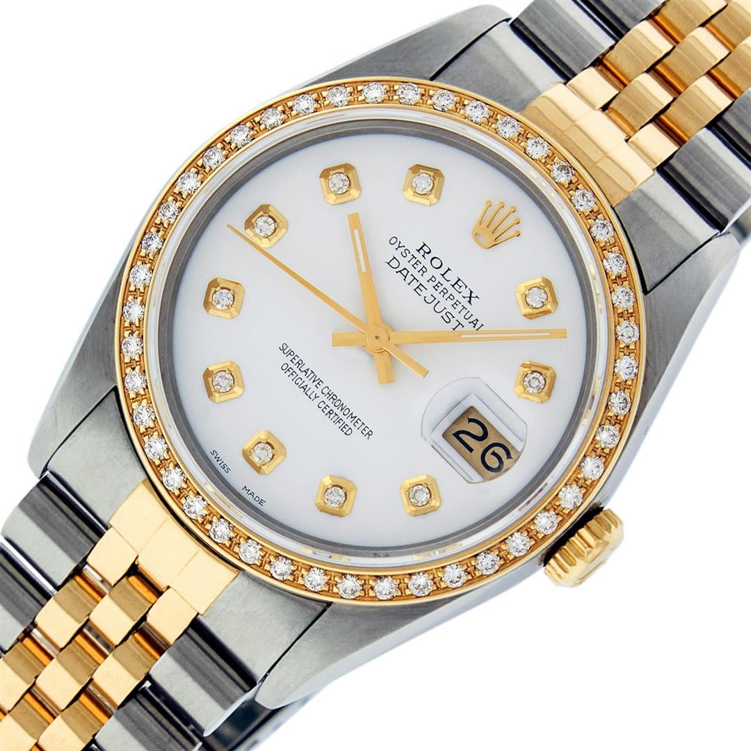 One Mens Yellow Gold Two Tone Rolex Datejust Polished, Serviced & Electronically Tested, Yellow Gold & Stainless Steel Case: 36mm, Yellow Gold Crown, Custom Bezel: New 18K Yellow Gold Beadset Diamond Bezel, Diamond Count: 44 Diamonds, Total Weight 1.00 Carat, Clarity: SI-VS, Color: G to H. Custom Crystal: New Synthetic Sapphire Cyclops Lens. Movement: Automatic Winding Movement . Custom Dial: White Diamond Dial, Diamond Count: 10 Diamonds In Dial, Color: G To H In Color, Clarity: SI-VS, Date Window: 3 O'Clock Position Date Display, Quickset, Model: Datejust, Condition: G-6 Extra Fine. Bracelet: Two Tone Yellow Gold & Stainless Steel Jubilee. Bright Polish. 7.0 Inch Length, Adjustable. Standard Clasp, With Rolex Logo. This Watch Has Been Serviced Time Tested And Is In Excellent Condition It Is Free Of All Scratches And Dents.