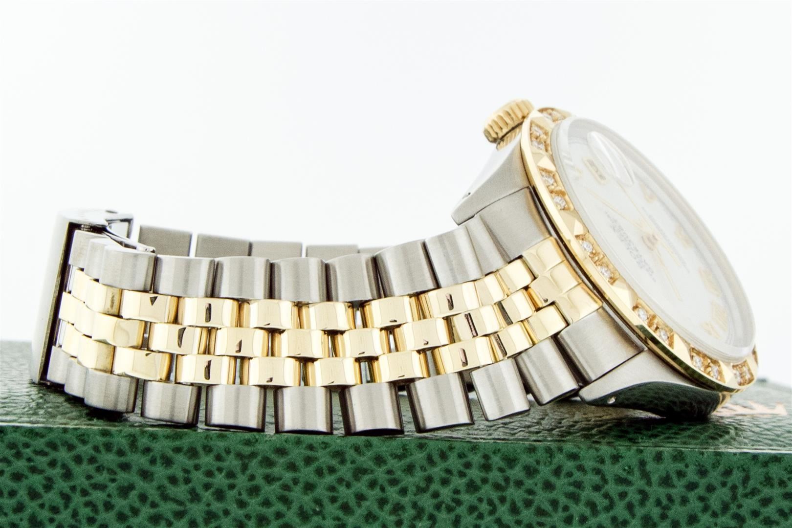 One Mens Pre Owned Yellow Gold Rolex Datejust Polished Bright with Satin Finish, Serviced & Electronically Tested, Stainless Steel Case: 36mm, Rolex Yellow Gold Crown, Custom Bezel: New 18K Yellow Gold Pyramid Diamond Bezel, Diamond Count: 24 Diamonds, Total Weight .75 Carat, Clarity: SI-VS, Color: G to H. Custom Crystal: New Sapphire With Magnified Date Window. Custom Hands: New Luminecent Hands. Rolex Movement: Automatic Winding Movement. Rolex Dial: White Roman Dial With Square Track. Date Window: 3 O'Clock Position Date Display, Quickset, Model: Datejust. Condition: G-6 Extra Fine. Rolex Bracelet: Yellow Gold And Stainless Steel Jubilee Band. Bright Polish & Satin Finish. 7.0 Inch Length, Adjustable. Standard Clasp, With Rolex Logo. This Watch Has Been Serviced And Polished It Is Free Of All Scratches And Dents. This Watch Comes With A Rolex Box.