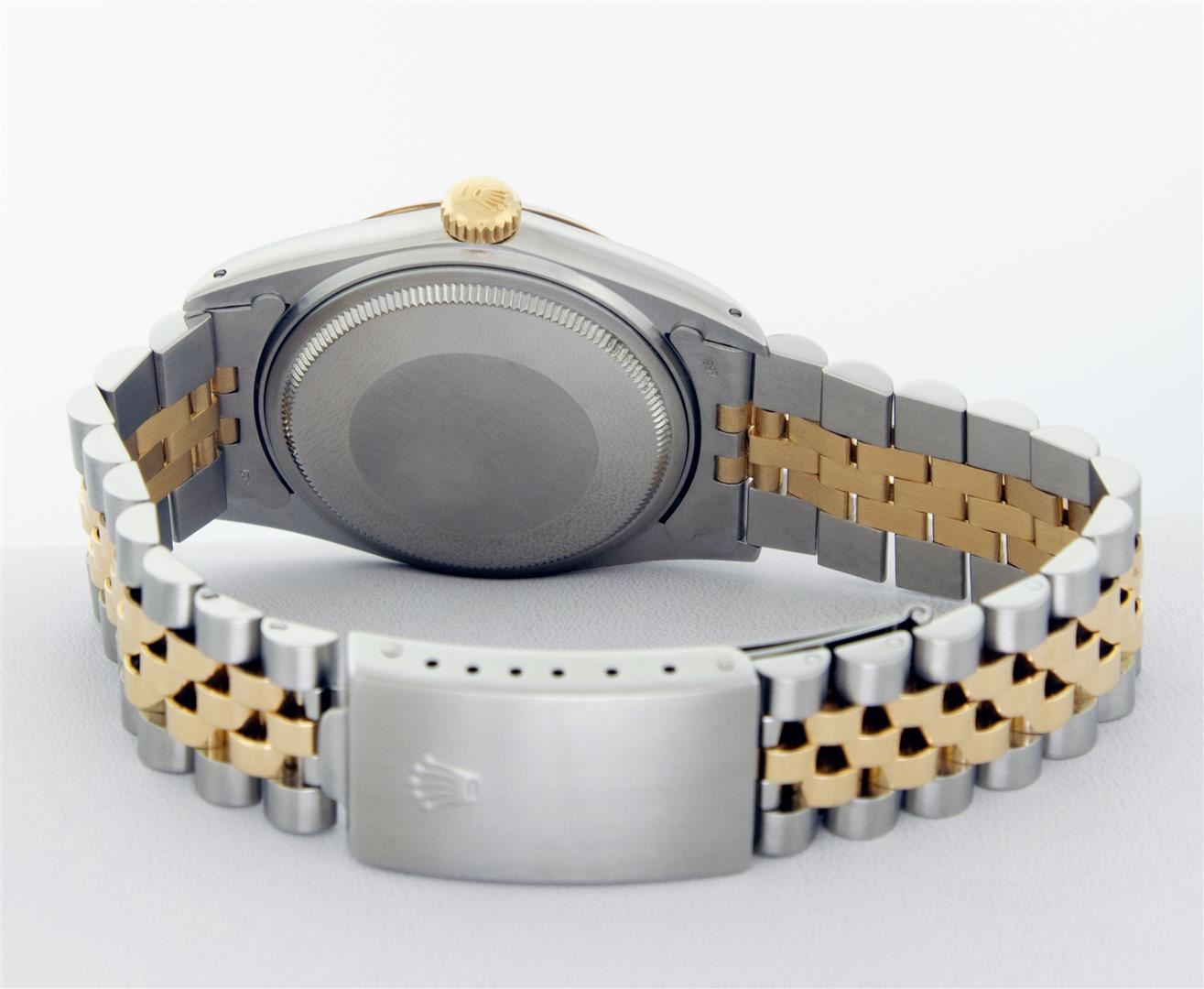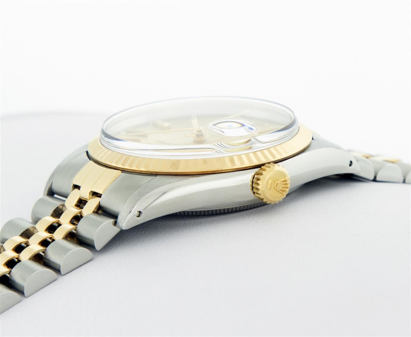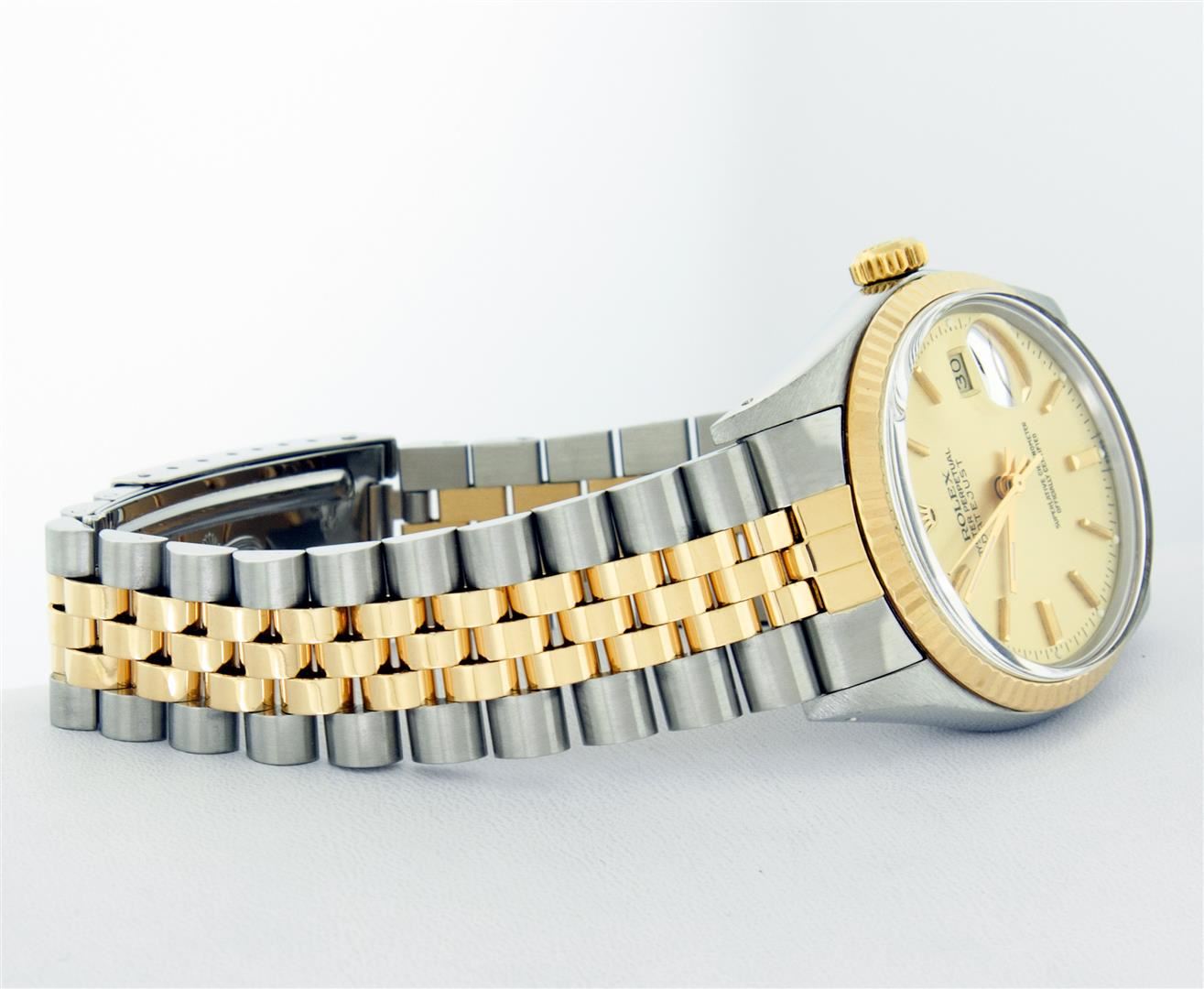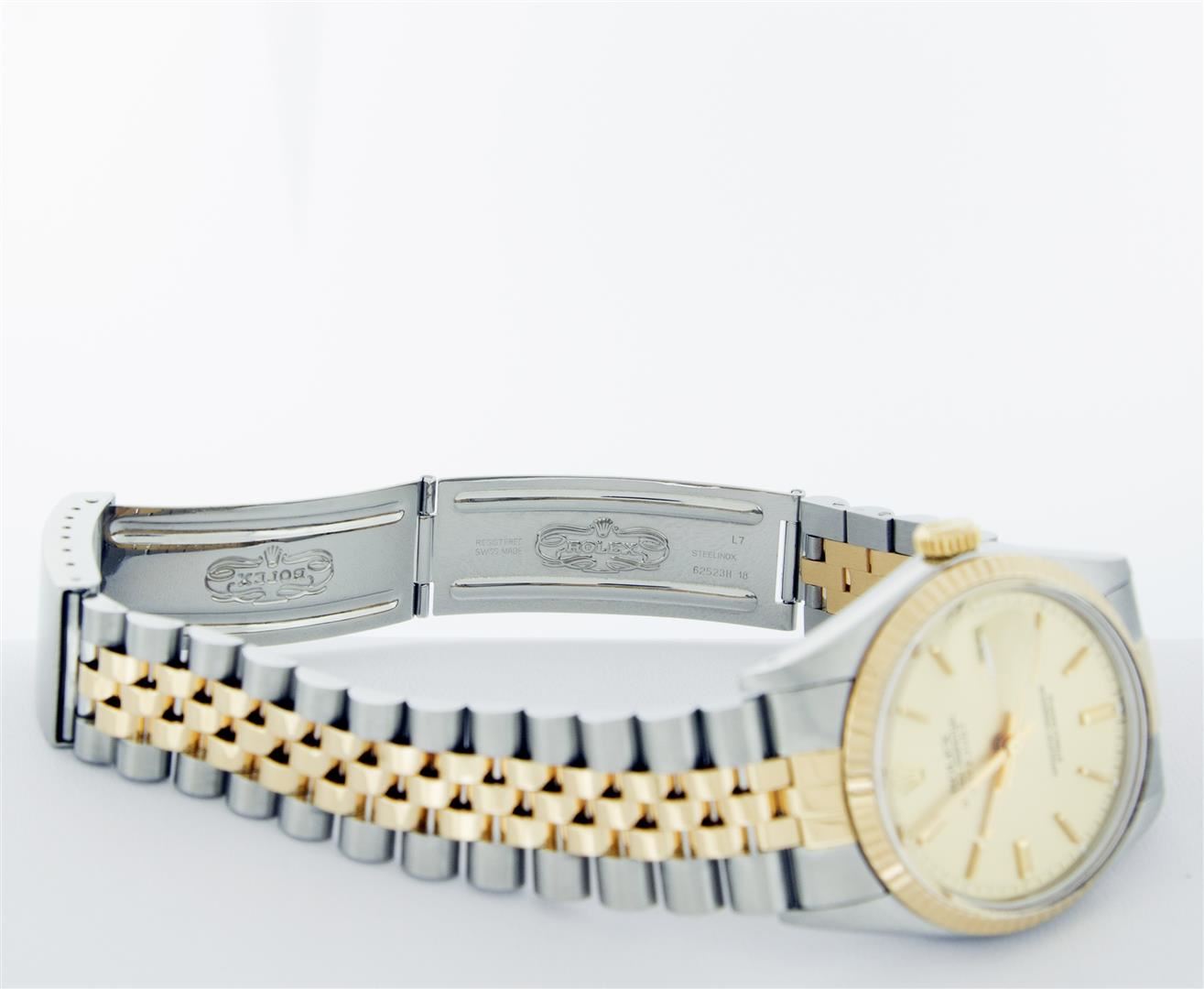 One Mens Rolex Pre Owned 14K Two Tone Yellow Gold And Stainless Steel Datejust Polished, Serviced & Electronically Tested, Yellow Gold & Stainless Steel Case: 36mm, Yellow Gold Crown, Rolex Bezel: 14K Yellow Gold Fluted Bezel. Custom Crystal: New Acrylic With Magnified Date Window. Custom Hands: New Luminescent Hands. Rolex Movement: Automatic Winding Movement 3035. Rolex Dial: Champagne Index Dial With Dash Track & Lumi Dots. Date Window: 3 O'Clock Position Date Display, Quickset, Model: Datejust. Condition: G-6 Extra Fine. Rolex Bracelet: Two Tone 14K Yellow Gold And Stainless Steel Jubilee Band. Bright Polish. 7.0 Inch Length, Adjustable. Standard Clasp, With Rolex Logo. This Watch Has Been Serviced Time Tested And Is In Excellent Condition It Is Free Of All Scratches And Dents.
