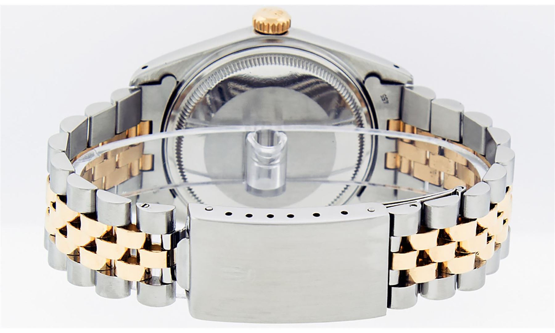 One Mens Rolex Pre Owned 14K Two Tone Yellow Gold And Stainless Steel Datejust Polished, Serviced & Electronically Tested, Yellow Gold & Stainless Steel Case: 36mm, Yellow Gold Crown, Rolex Bezel: 14K Yellow Gold Fluted Bezel. Custom Crystal: New Acrylic With Magnified Date Window. Hands: Luminescent Hands. Rolex Movement: Automatic Winding Movement 3035. Rolex Dial: Champagne Index Dial With Dash Track & Lumi Dots. Date Window: 3 O'Clock Position Date Display, Quickset, Model: Datejust. Condition: G-6 Extra Fine. Rolex Bracelet: Two Tone 14K Yellow Gold And Stainless Steel Jubilee Band. Bright Polish. 7.0 Inch Length, Adjustable. Standard Clasp, With Rolex Logo. This Watch Has Been Serviced Time Tested And Is In Excellent Condition It Is Free Of All Scratches And Dents.