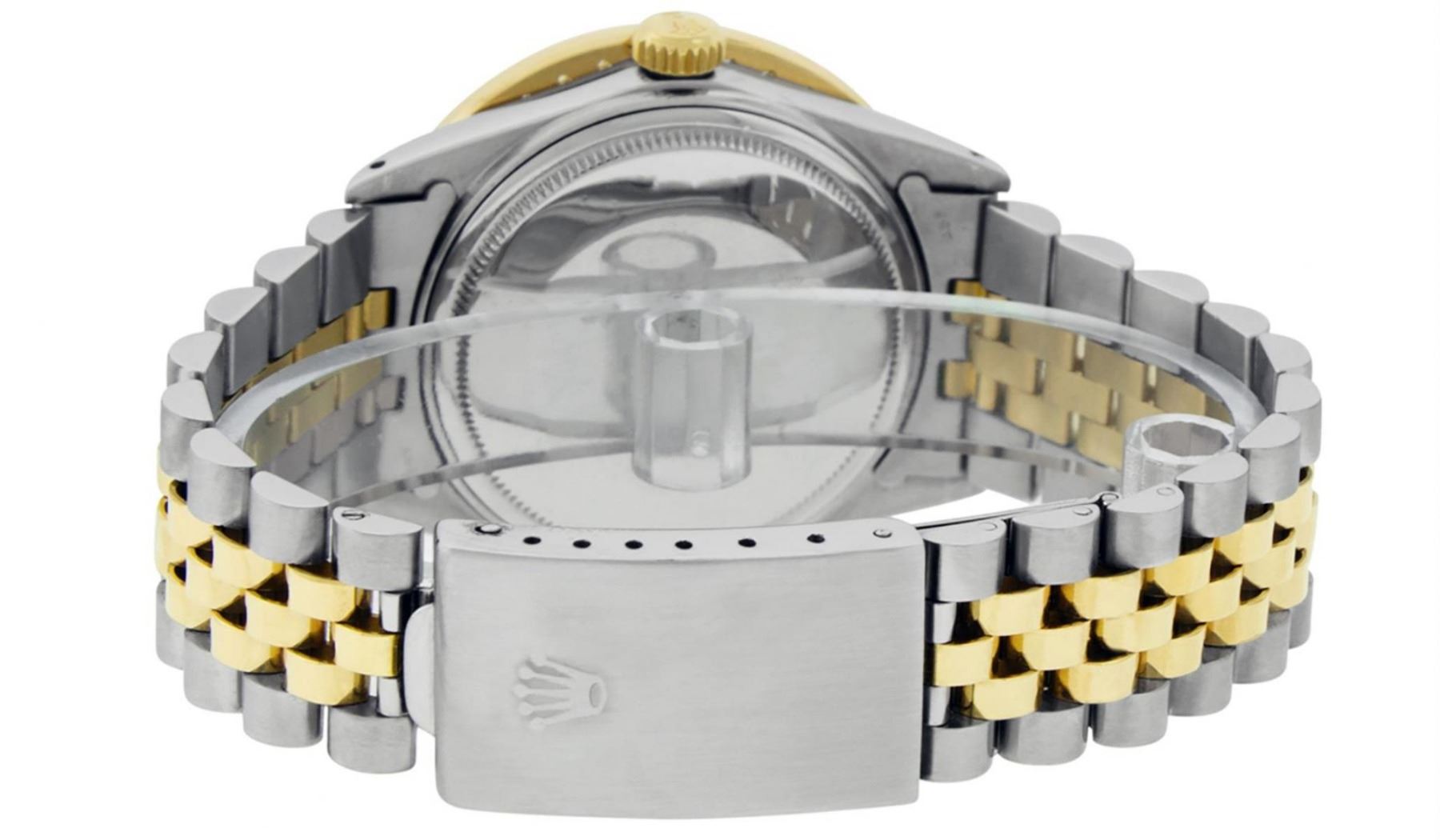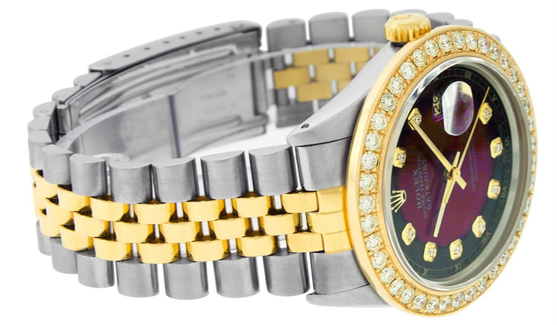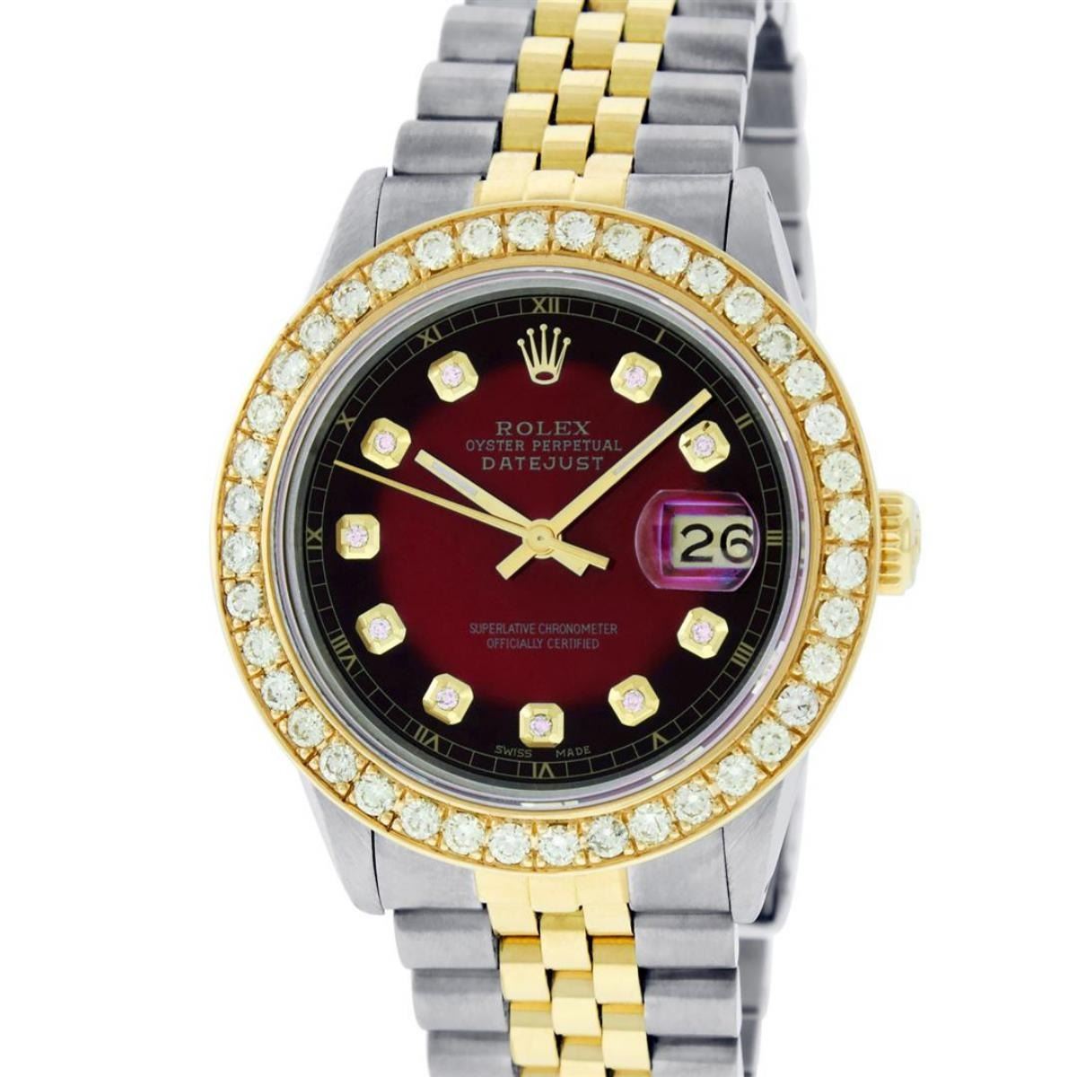 One Mens Yellow Gold Two Tone Rolex Datejust Polished Bright with Satin Finish, Serviced & Electronically Tested, Yellow Gold And Stainless Steel Case: 36mm, Yellow Gold Crown, Custom Bezel: New 18K Yellow Gold Beadset Diamond Bezel, Diamond Count: 40 Diamonds On Bezel, Total Bezel Weight 2.5 Carat, Clarity: SI-VS, Color: G to H. Custom Crystal: New Scratch Resistant Synthetic Sapphire Cyclops Lens. Custom Hands: New Luminecent Hands. Movement: Automatic Winding Movement. Custom Dial: Red Vignette Diamond Dial With Roman Track, Diamond Count: 10 Diamonds On Dial, Dial Color: G To H In Color, Clarity: VS2-SI1. Date Window: 3 O'Clock Position Date Display, Quickset, Model: Datejust. Condition: G-6 Extra Fine. Bracelet: Yellow Gold And Stainless Steel Jubilee Band. Bright Polish & Satin Finish. 7.0 Inch Length, Adjustable. Standard Clasp, With Rolex Logo. This Watch Has Been Serviced and Polished And It Is Free Of All Dents And Scratches And Has Been Time Tested. This Watch Comes With A Rolex Box.