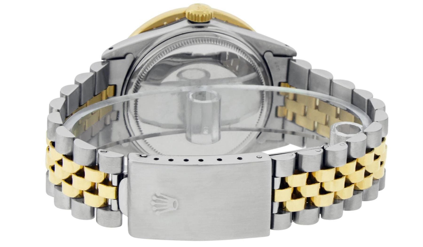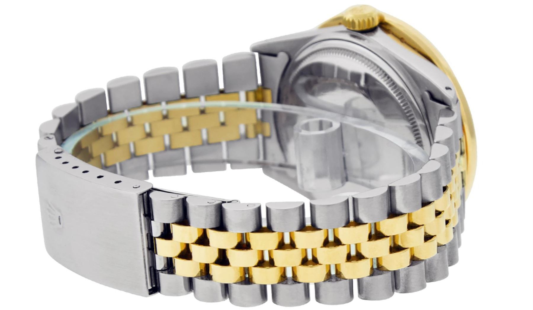 One Mens Pre Owned Yellow Gold Two Tone Rolex Datejust Polished Bright with Satin Finish, Serviced & Electronically Tested, Yellow Gold And Stainless Steel Case: 36mm, Yellow Gold Crown, Custom Bezel: New 18K Yellow Gold Bead set Diamond Bezel, Diamond Co